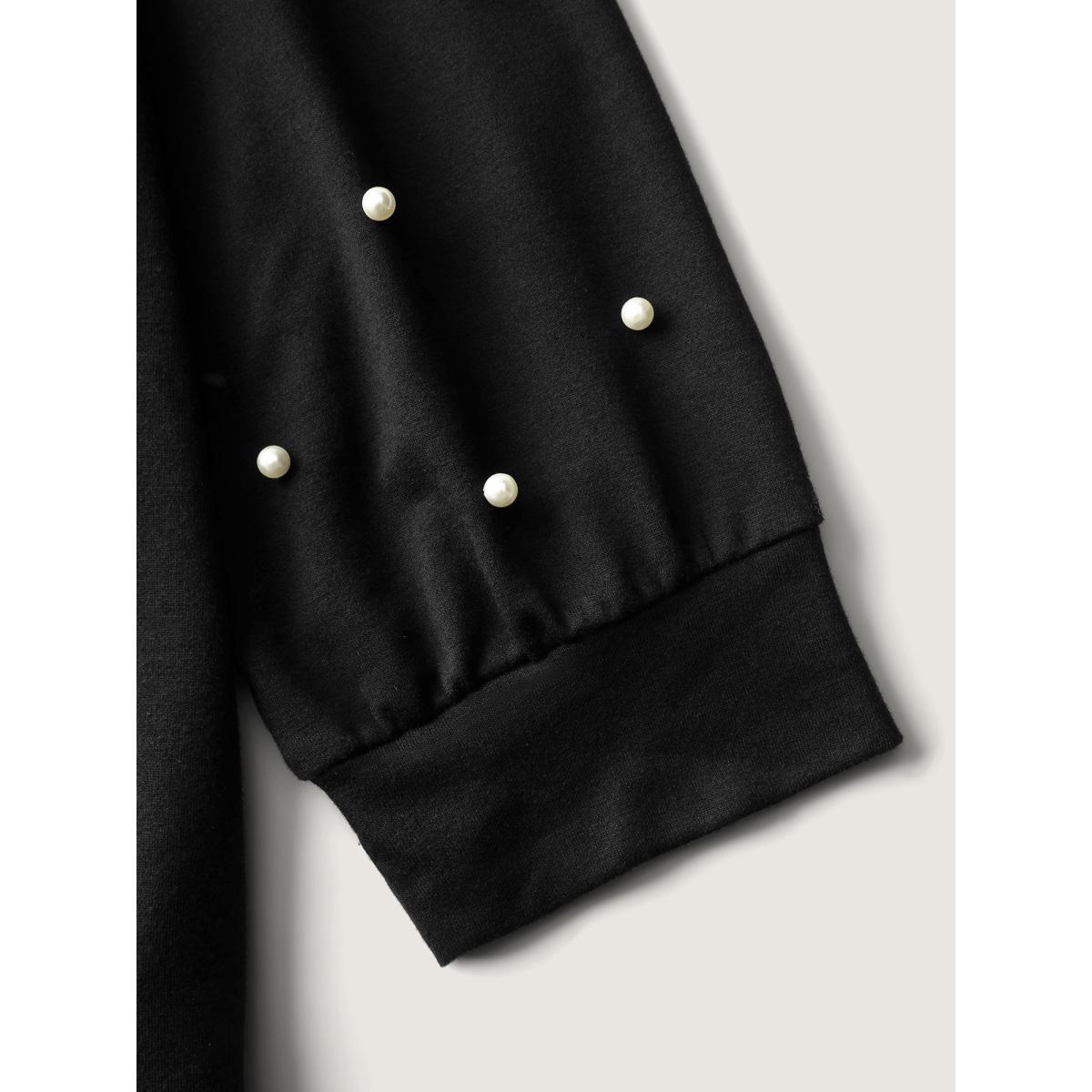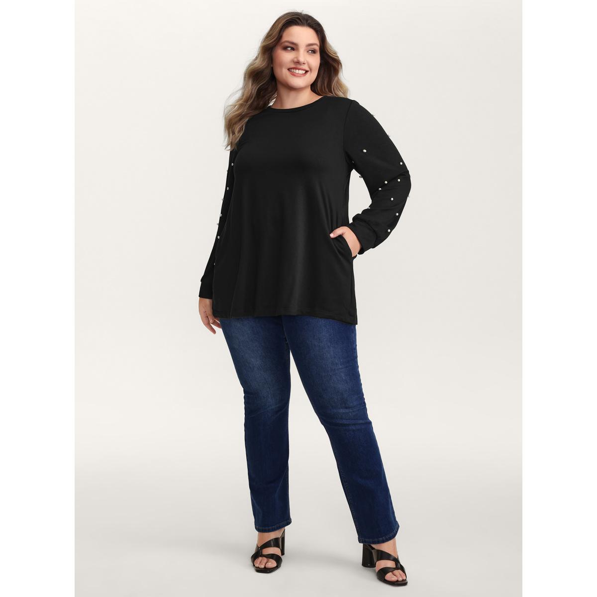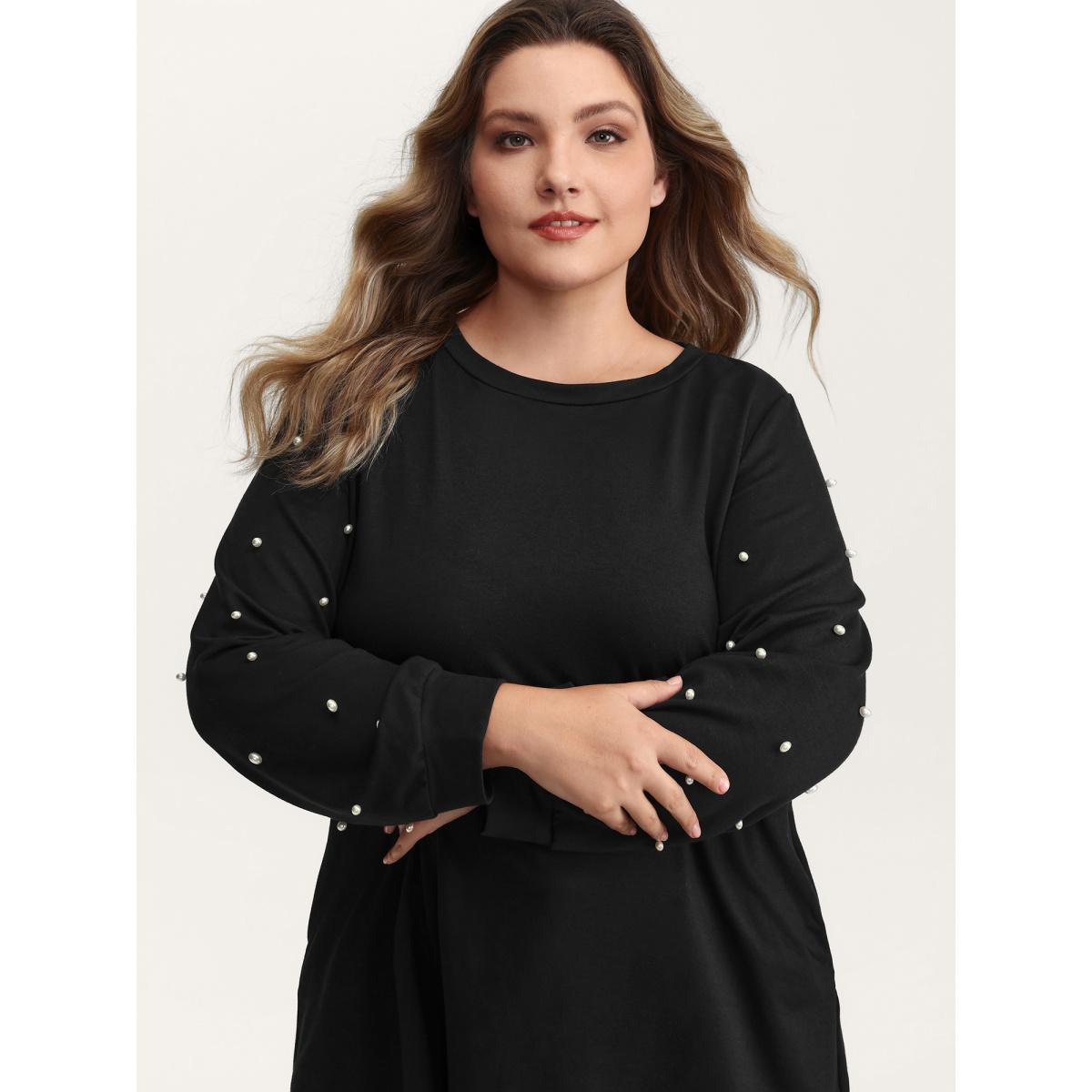 Plus Size Bubble Beads Pockets Solid Top Women Black Leisure Beaded Round Neck Casual Sweatshirts BloomChic 12/L