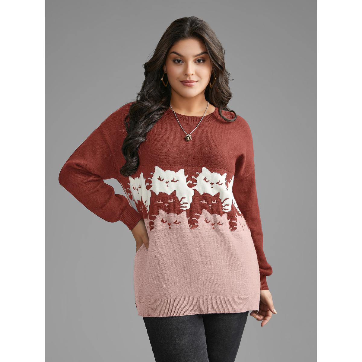 Plus Size Cat Contrast Drop Shoulder Pullover Rust Women Playful Loose Long Sleeve Round Neck Casual Pullovers BloomChic 10/M