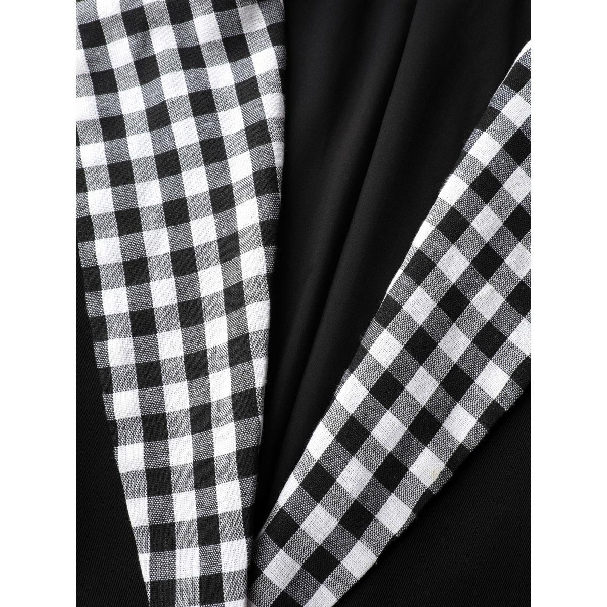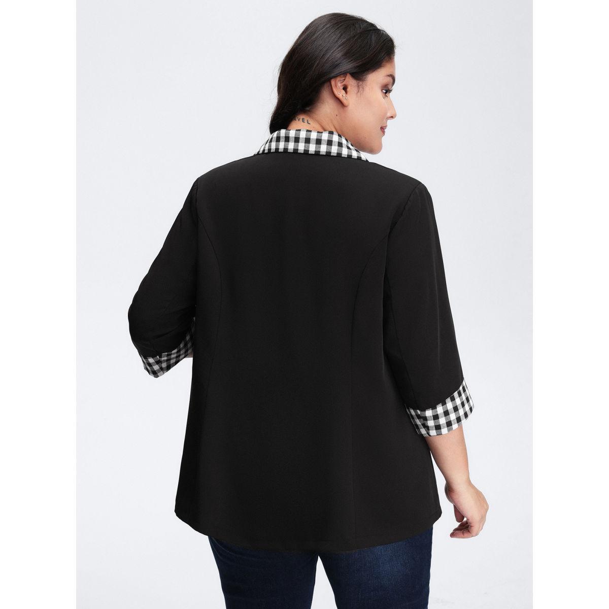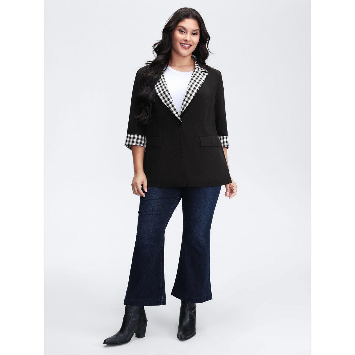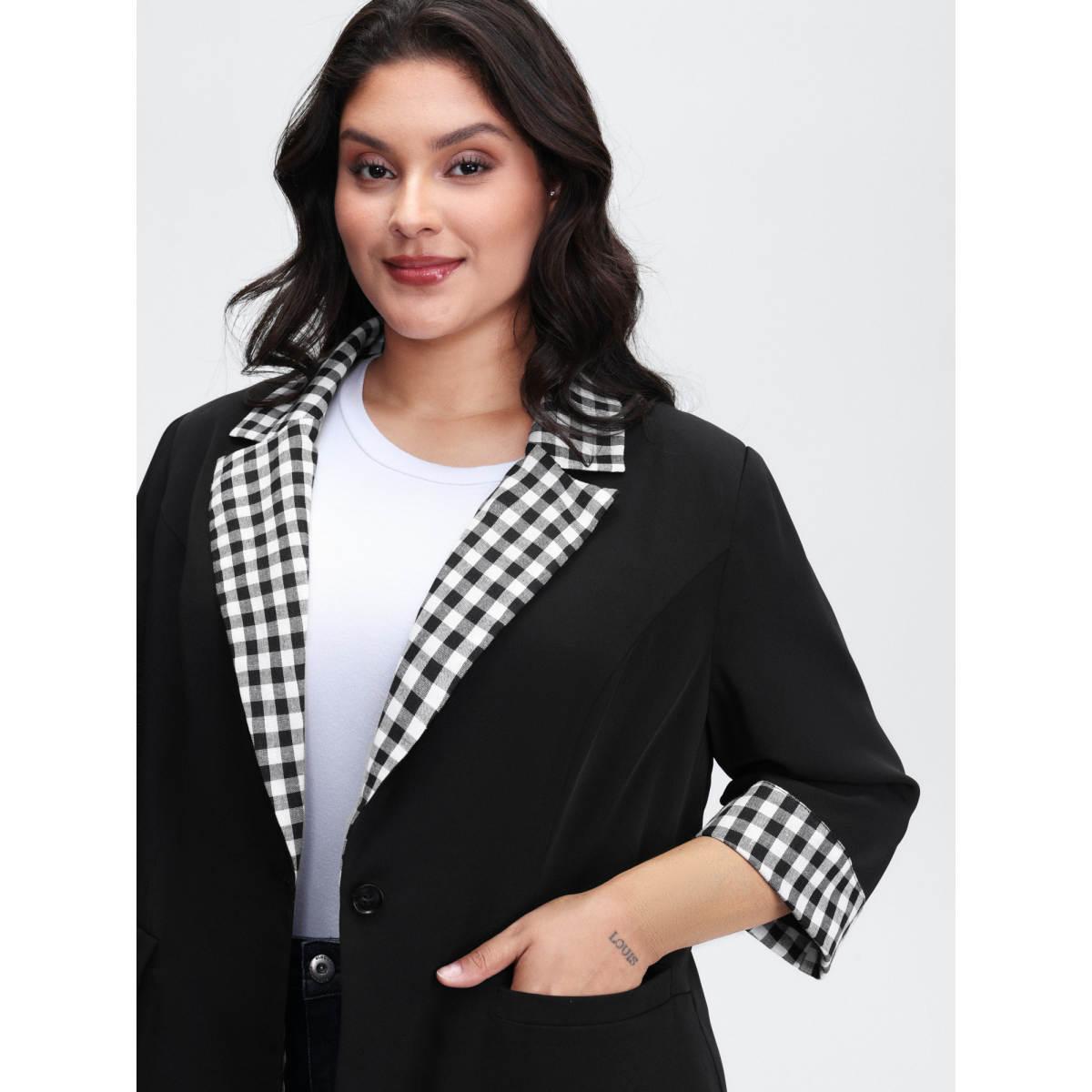 Plus Size Checkered Contrast Button Blazer Black Women Casual Contrast Sleeve Elbow-length sleeve Suit Collar 28/5X Open pocket with flap Leisure Blazers BloomChic