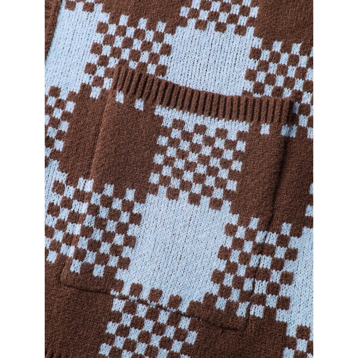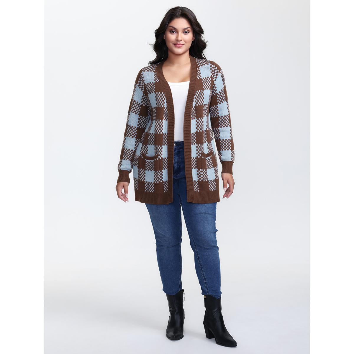 Plus Size Checkered Pattern Pockets Knit Cardigan Browncoffeecolor Women Playful Loose Long Sleeve Casual Cardigans BloomChic 12/L