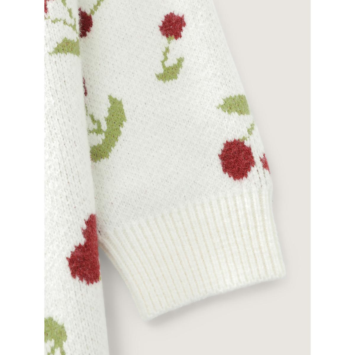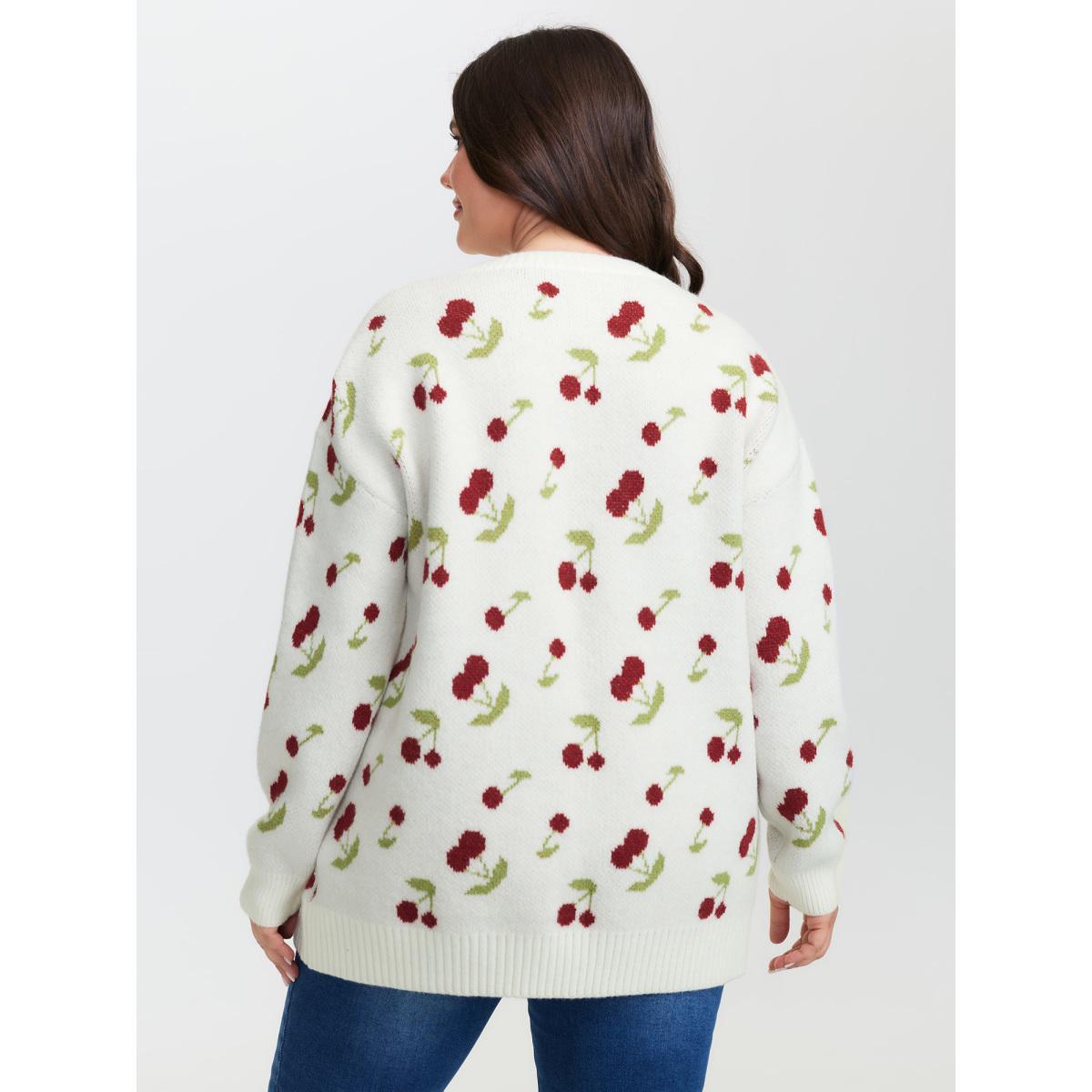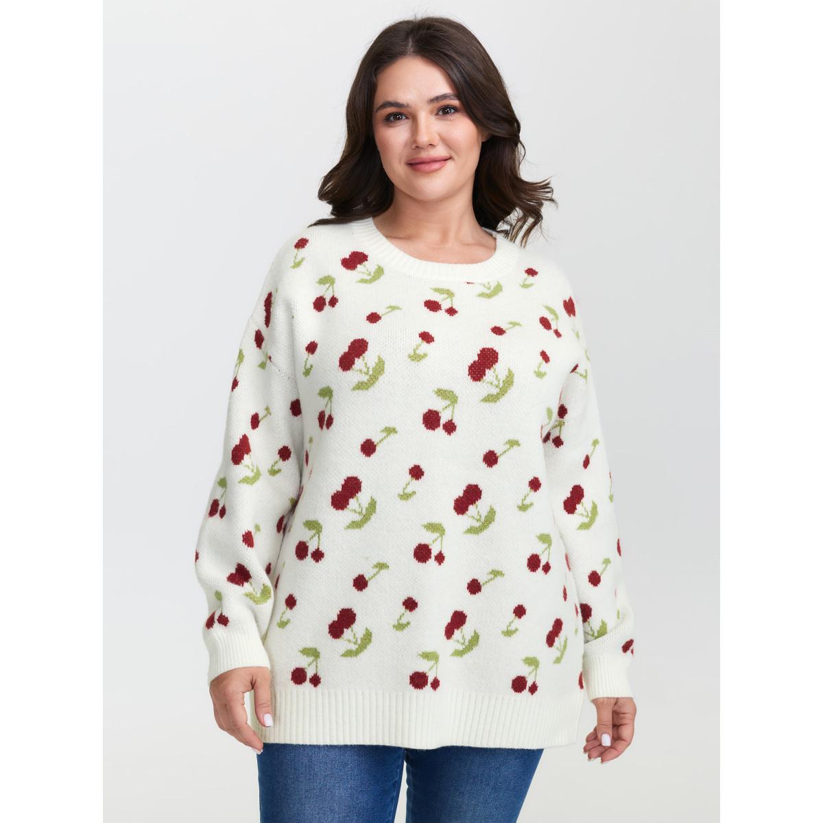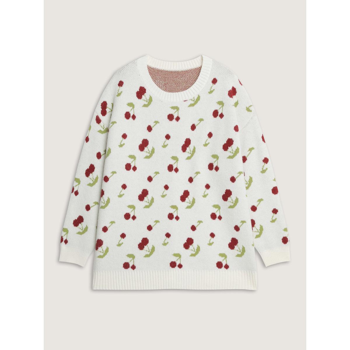 Plus Size Cherry Pattern Jacquard Pullover Ivory Women Casual Loose Long Sleeve Round Neck Casual Pullovers BloomChic 14-16/1X