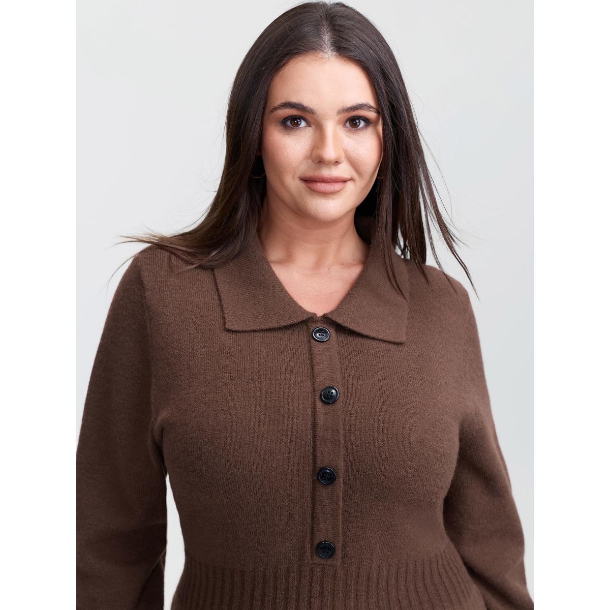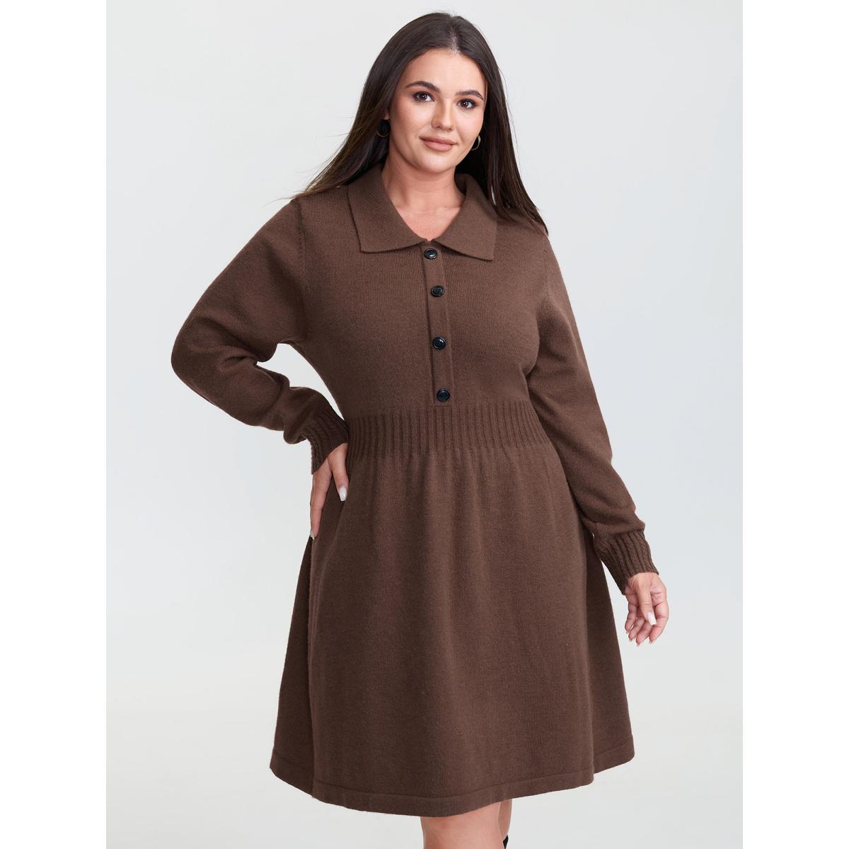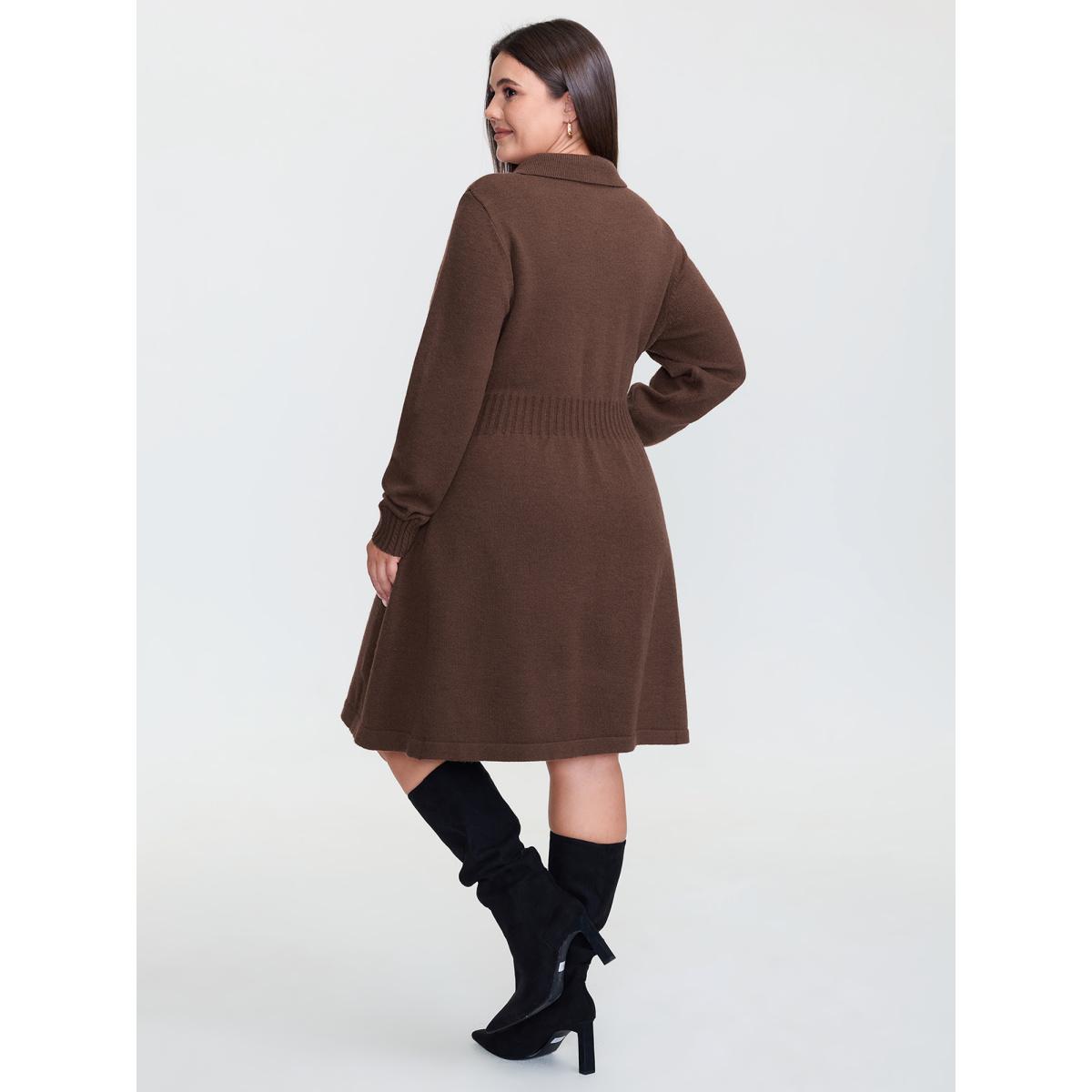 Plus Size Cinched-Waist Collar Button Sweater Dress Browncoffeecolor Women Office Bodycon Long Sleeve Office Sweater Dresses BloomChic 10/M