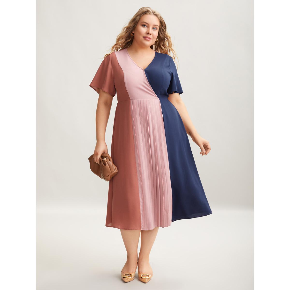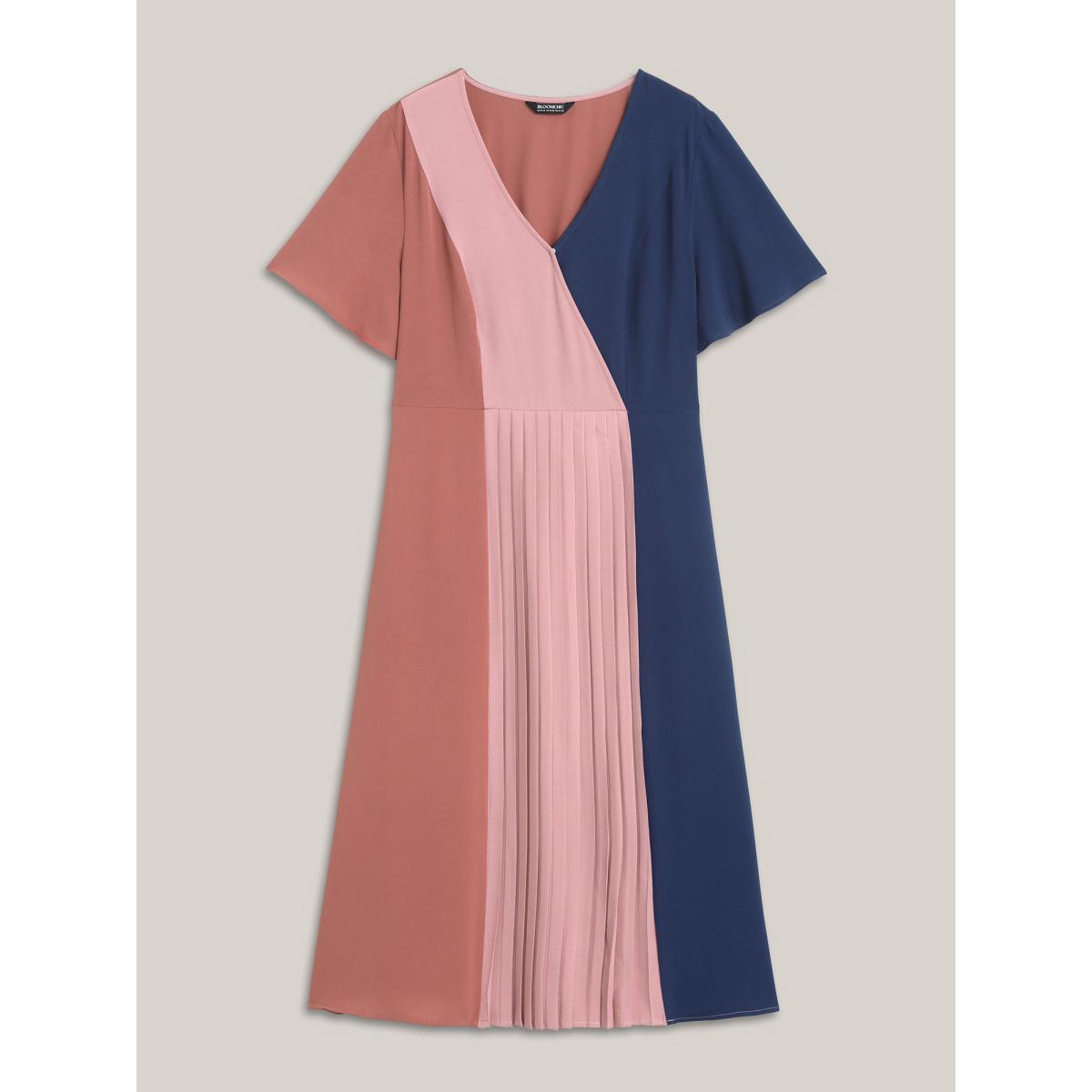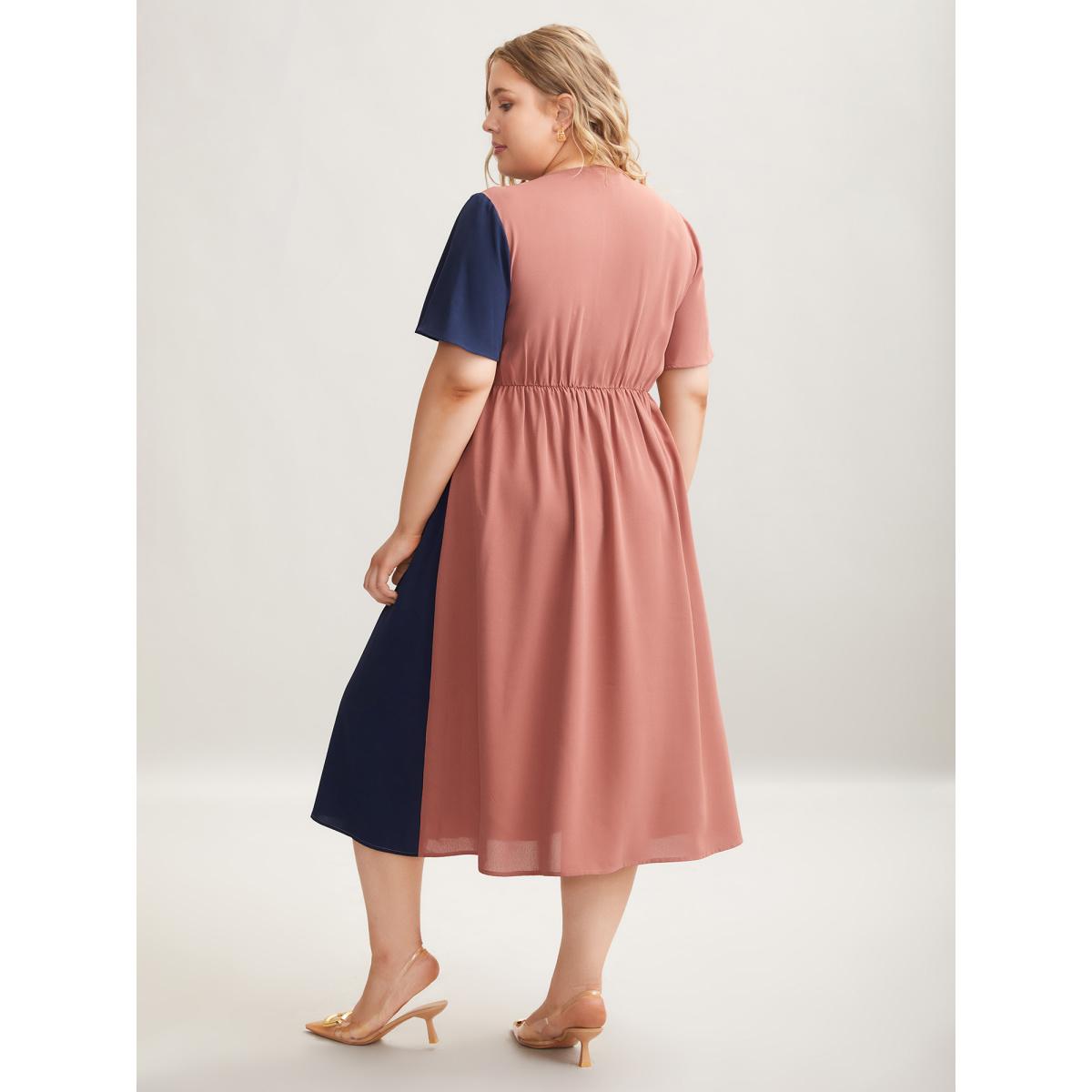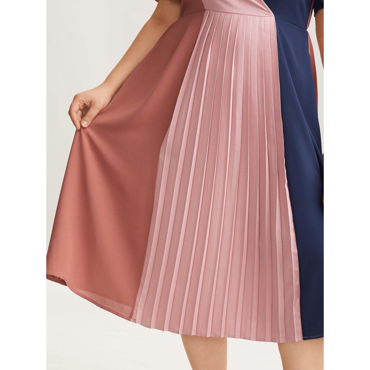 Plus Size Color Block Pleated Waist-Cinched Midi Dress Multicolor Women At the Office Contrast Overlap Collar Short sleeve Curvy BloomChic 14-16/1X