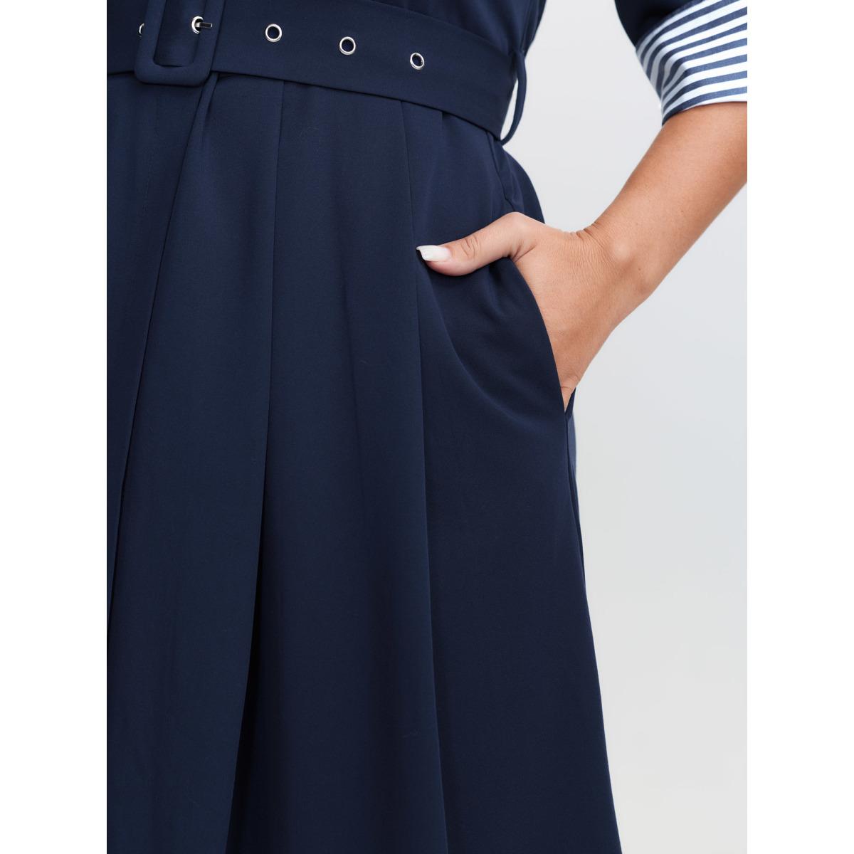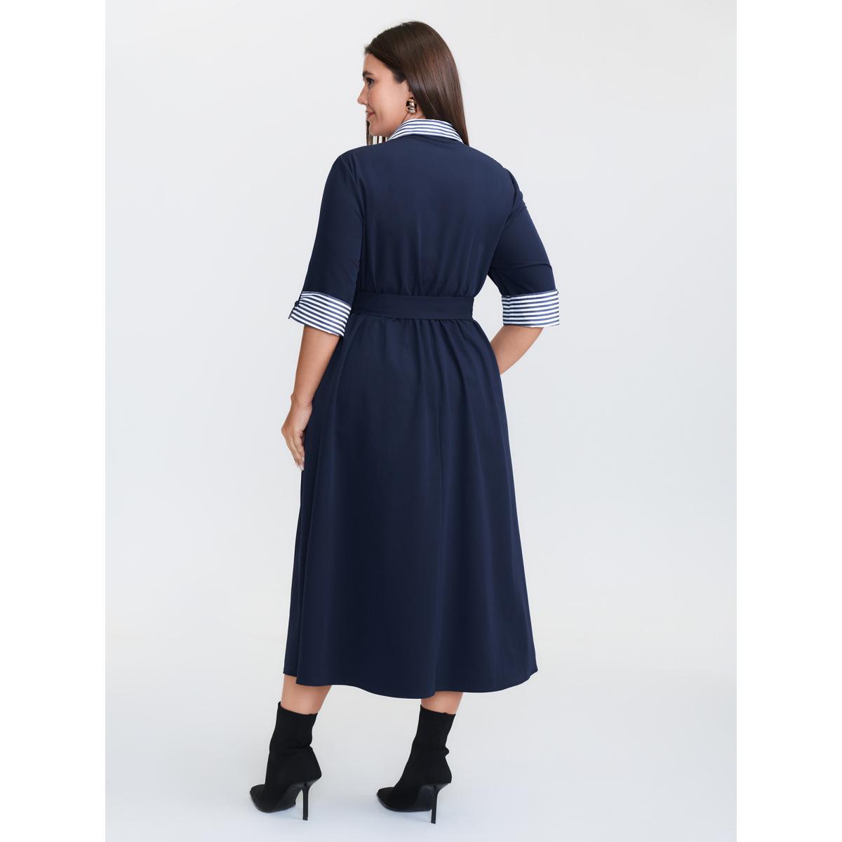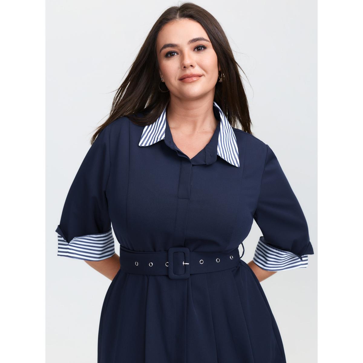 Plus Size Color Contrast Cuffs Belted Midi Dress DarkBlue Women Shirt collar Elbow-length sleeve Curvy BloomChic 26/4X Product Image