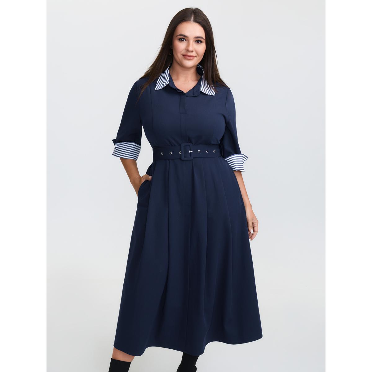 Plus Size Color Contrast Cuffs Belted Midi Dress DarkBlue Women Shirt collar Elbow-length sleeve Curvy BloomChic 26/4X