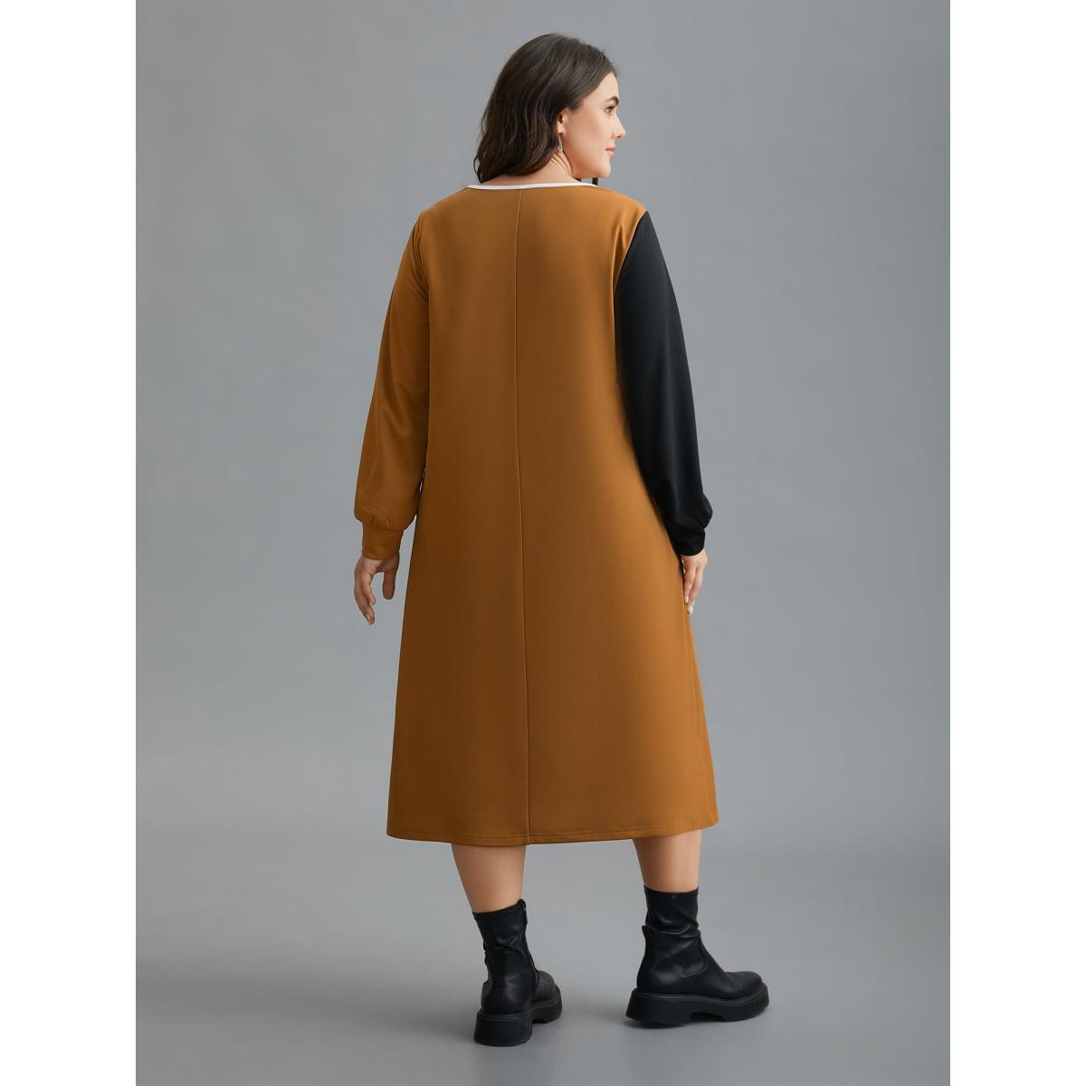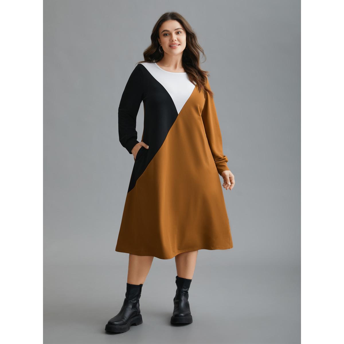 Plus Size Colorblock Contrast Pockets Knitted Midi Dress Yellowishbrown Women Casual Contrast Knit Dresses Bloomchic 14-16/1X