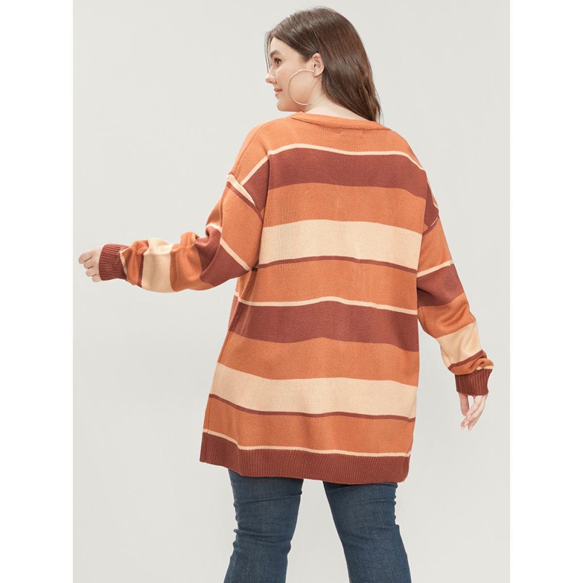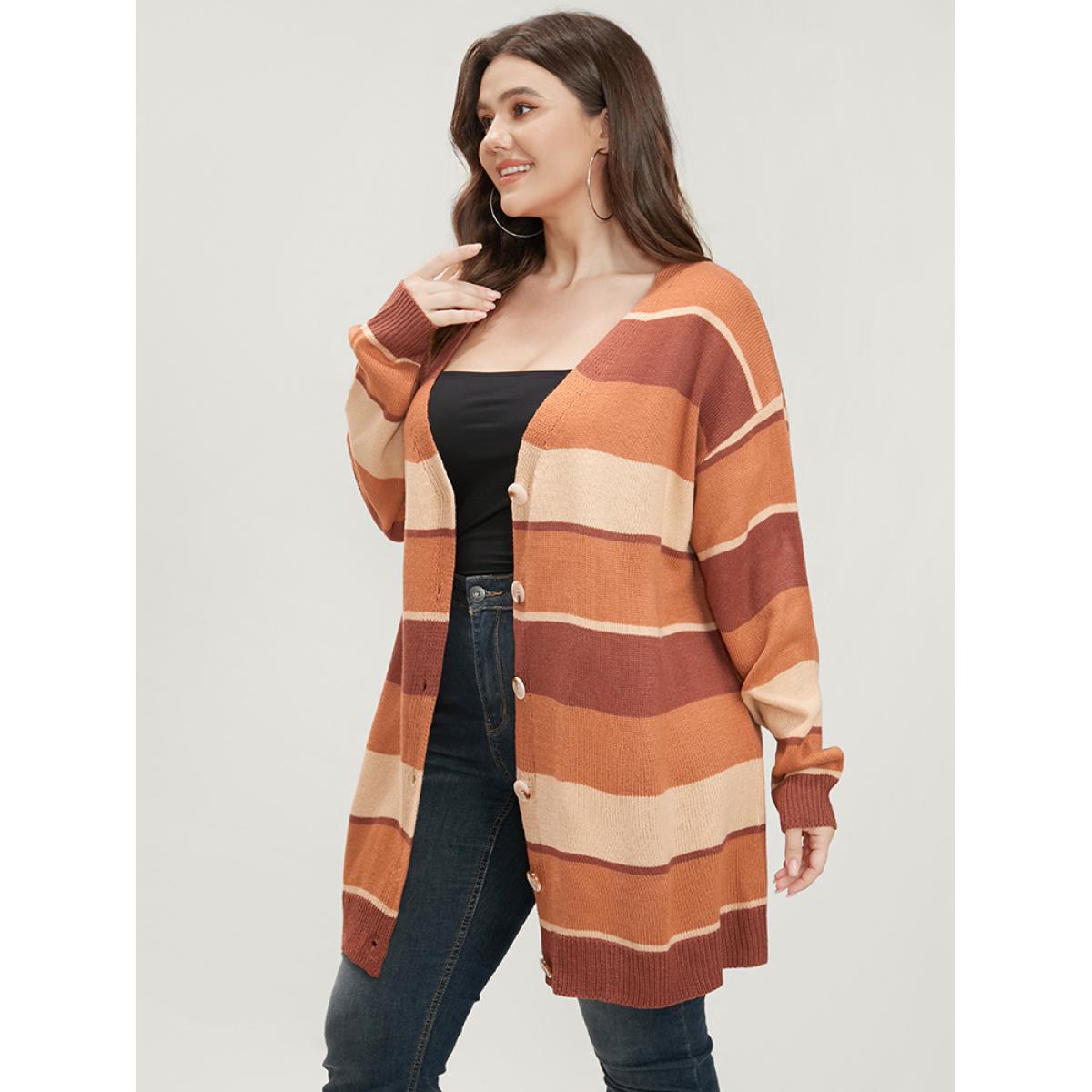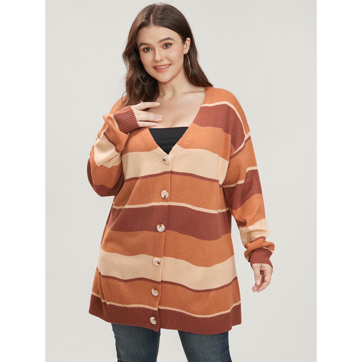 Plus Size Colorblock Contrast Pointelle Knit Button Front Cardigan Bronze Women Casual Long Sleeve Dailywear Cardigans BloomChic 14-16/1X