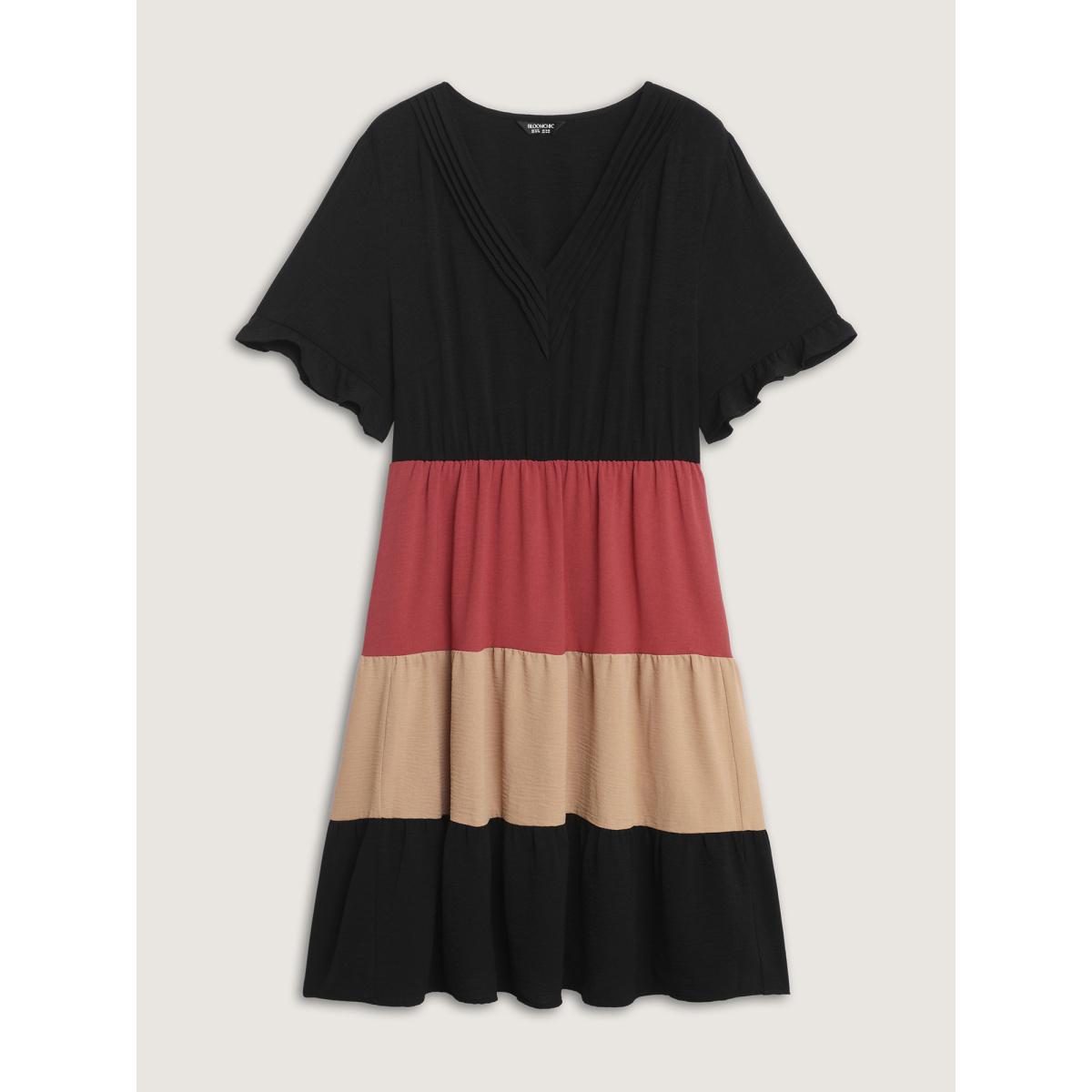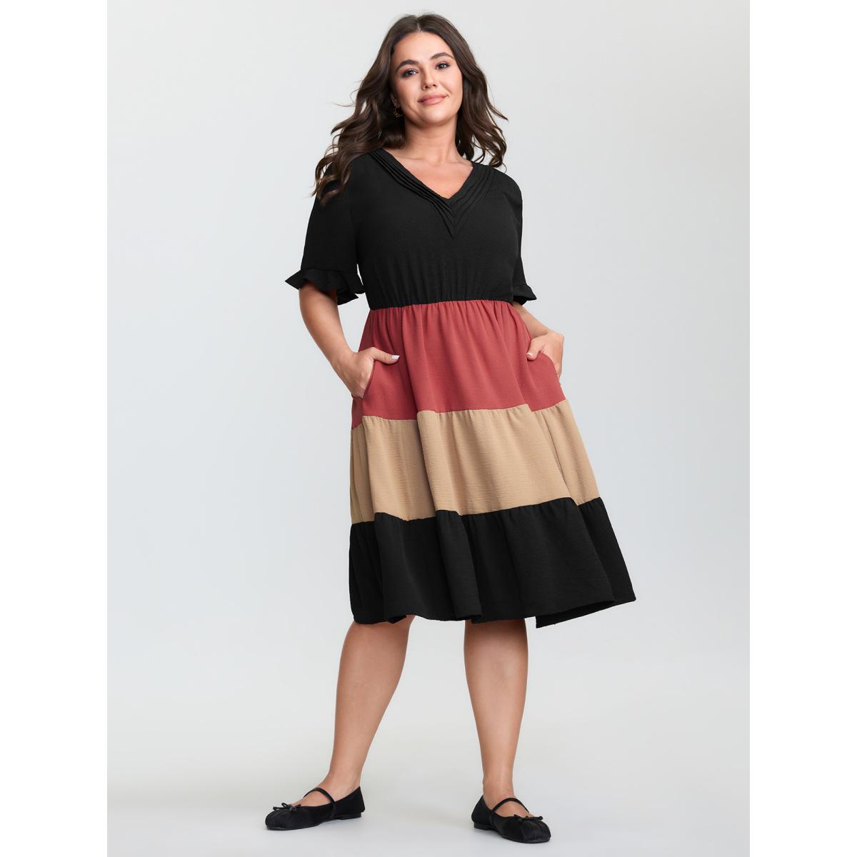 Plus Size Colorblock Tiered Pockets Midi Dress Black Women Leisure Gathered V-neck Short sleeve Curvy BloomChic 14-16/1X