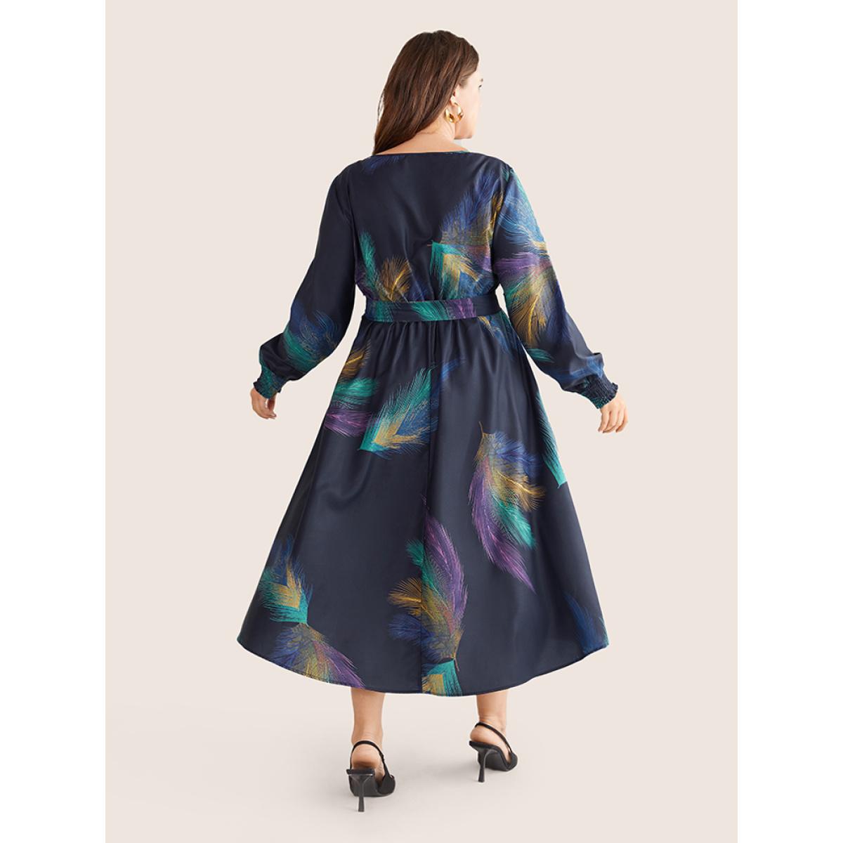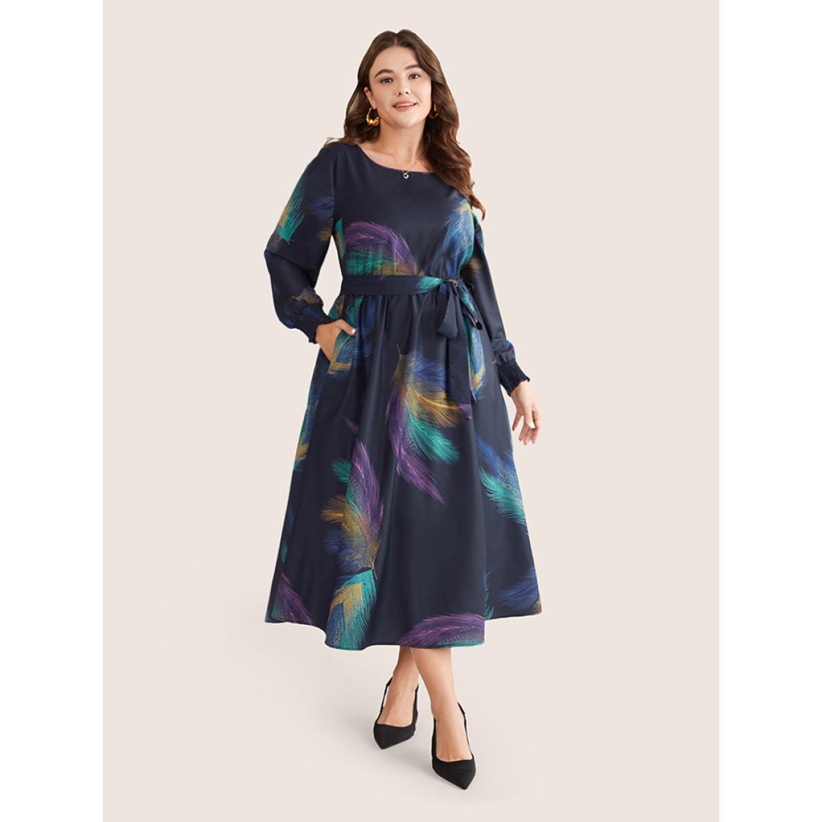 Plus Size Colored Feather Belted Shirred Cuffs Dress DarkBlue Women Elegant Belted Round Neck Long Sleeve Curvy Midi Dress BloomChic 18-20/2X