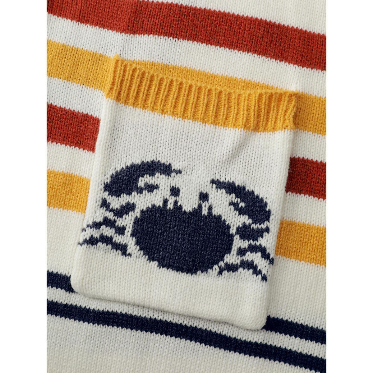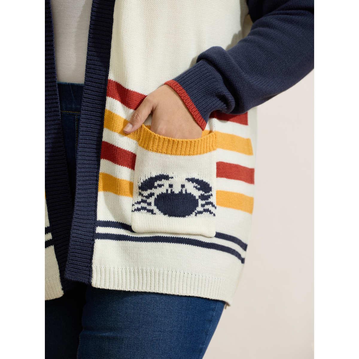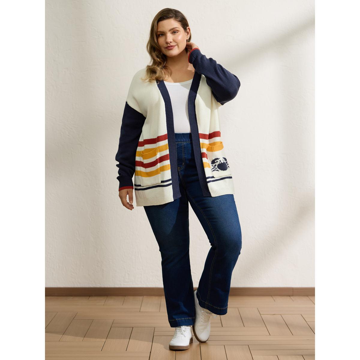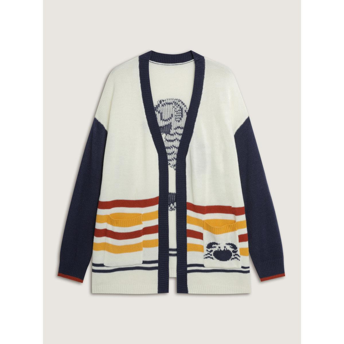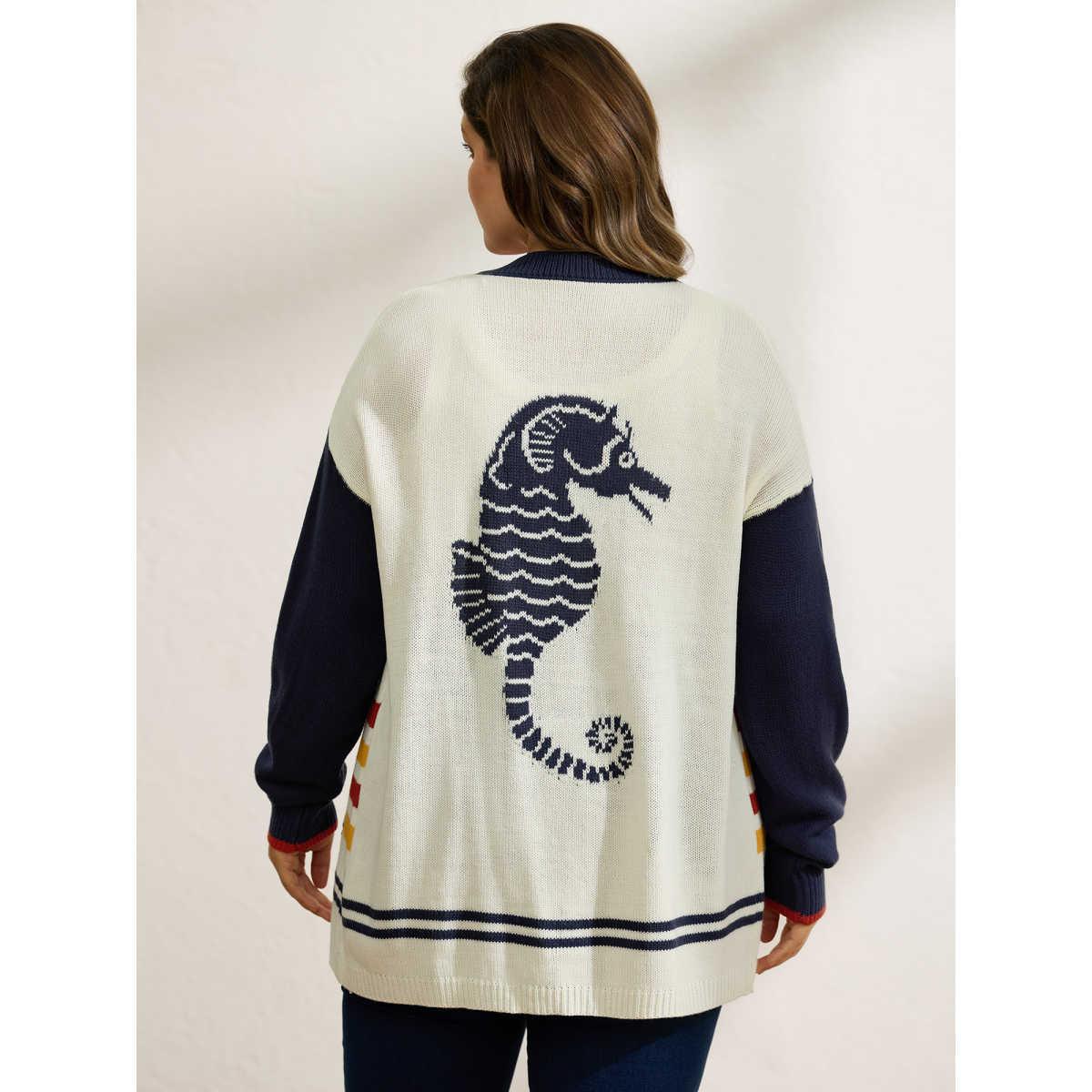 Plus Size Colorful Stripe Seahorse Motif Jacquard Knit Cardigan Originalwhite Women Playful Loose Long Sleeve Casual Cardigans BloomChic 26/4X