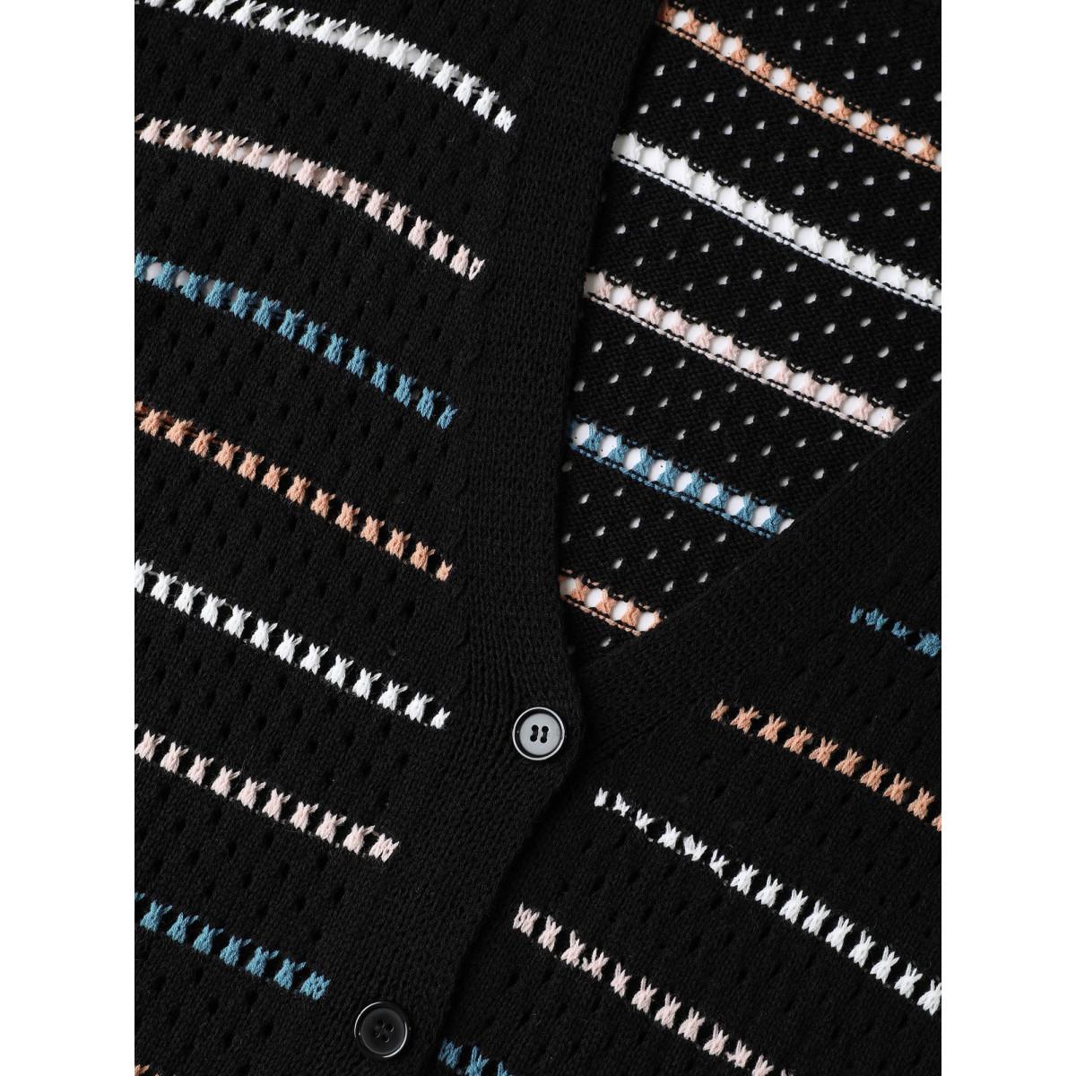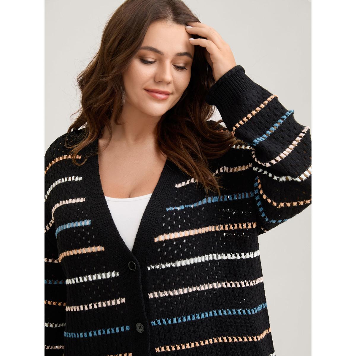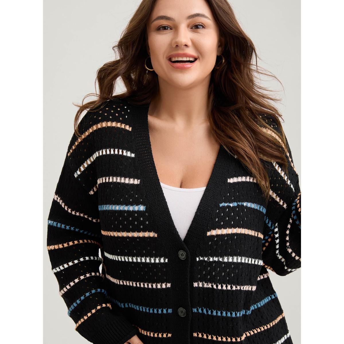 Plus Size Striped Geo Eyelet Drop Shoulder Cardigan Black Women Casual Loose Long Sleeve Dailywear Cardigans BloomChic 22-24/3X