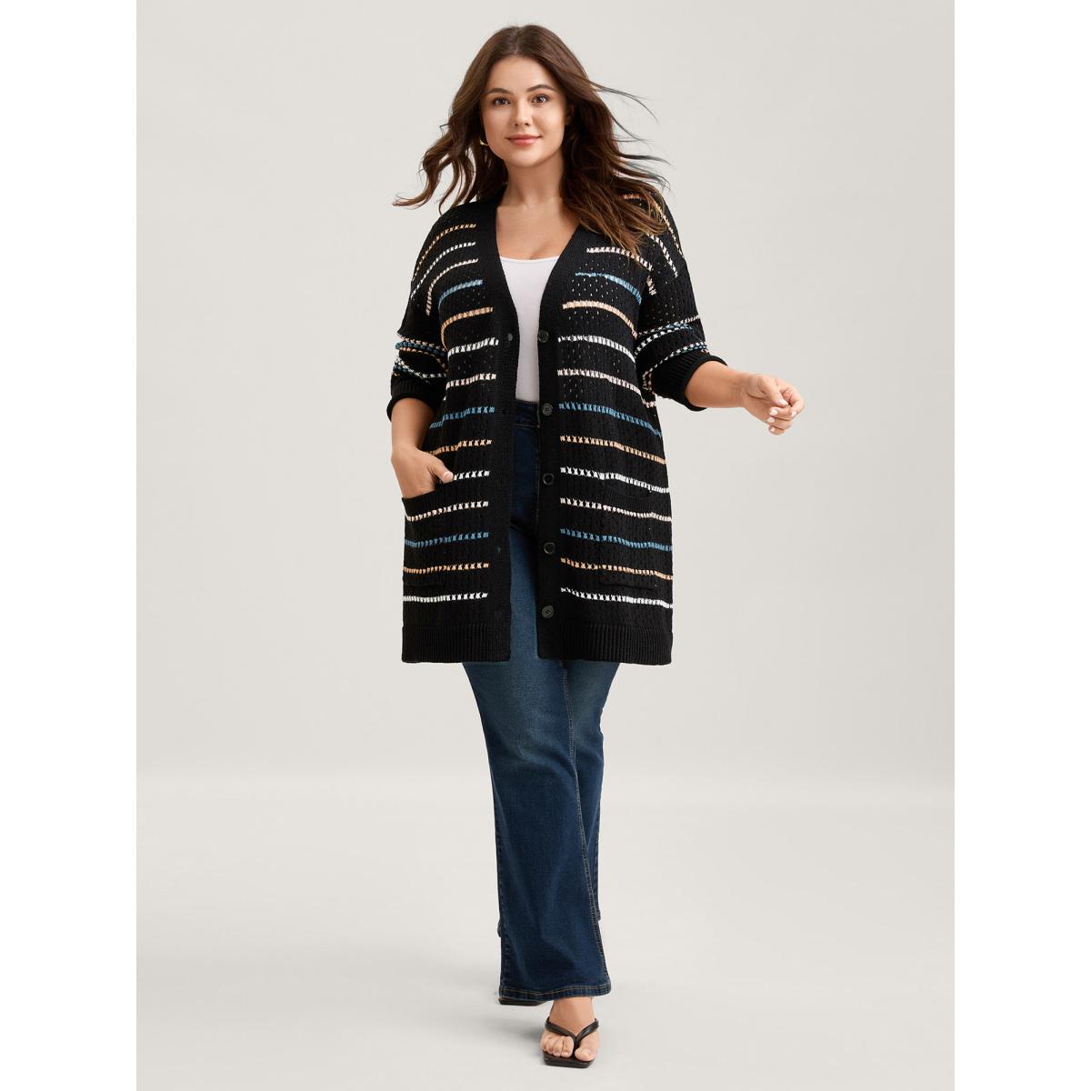 Plus Size Striped Eyelet Curved Hem Patched Pocket Cardigan Black Women Casual Loose Long Sleeve Dailywear Cardigans BloomChic 30/6X
