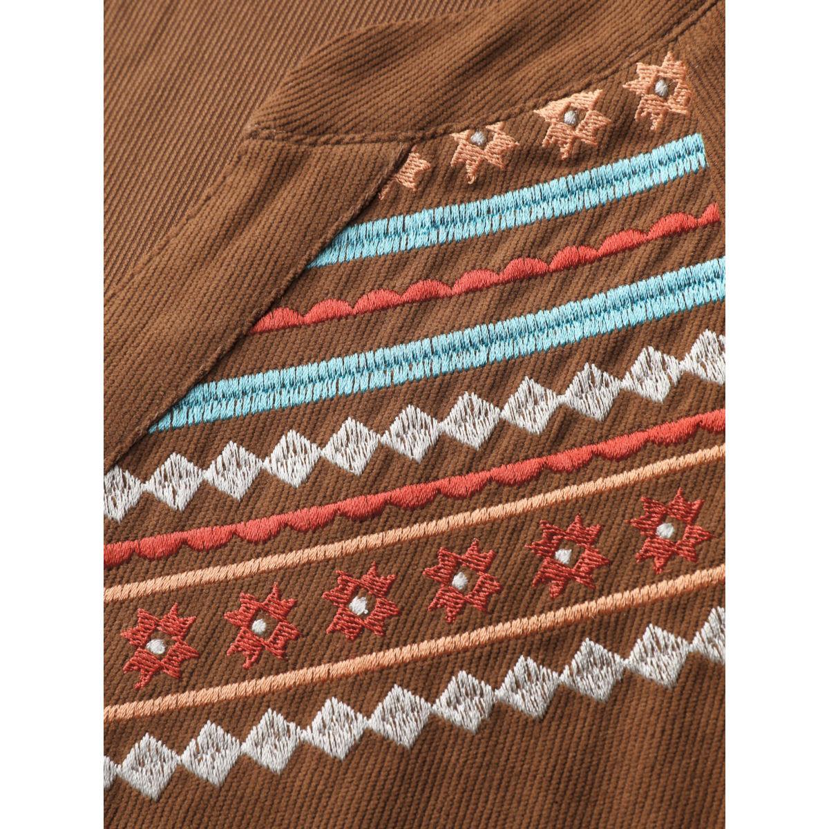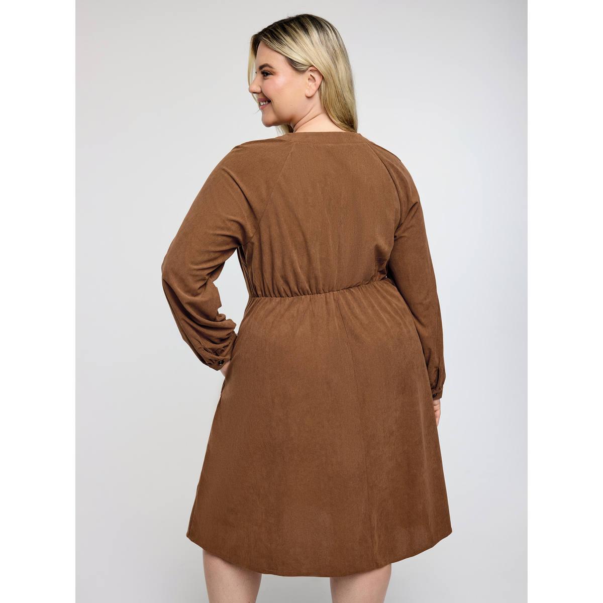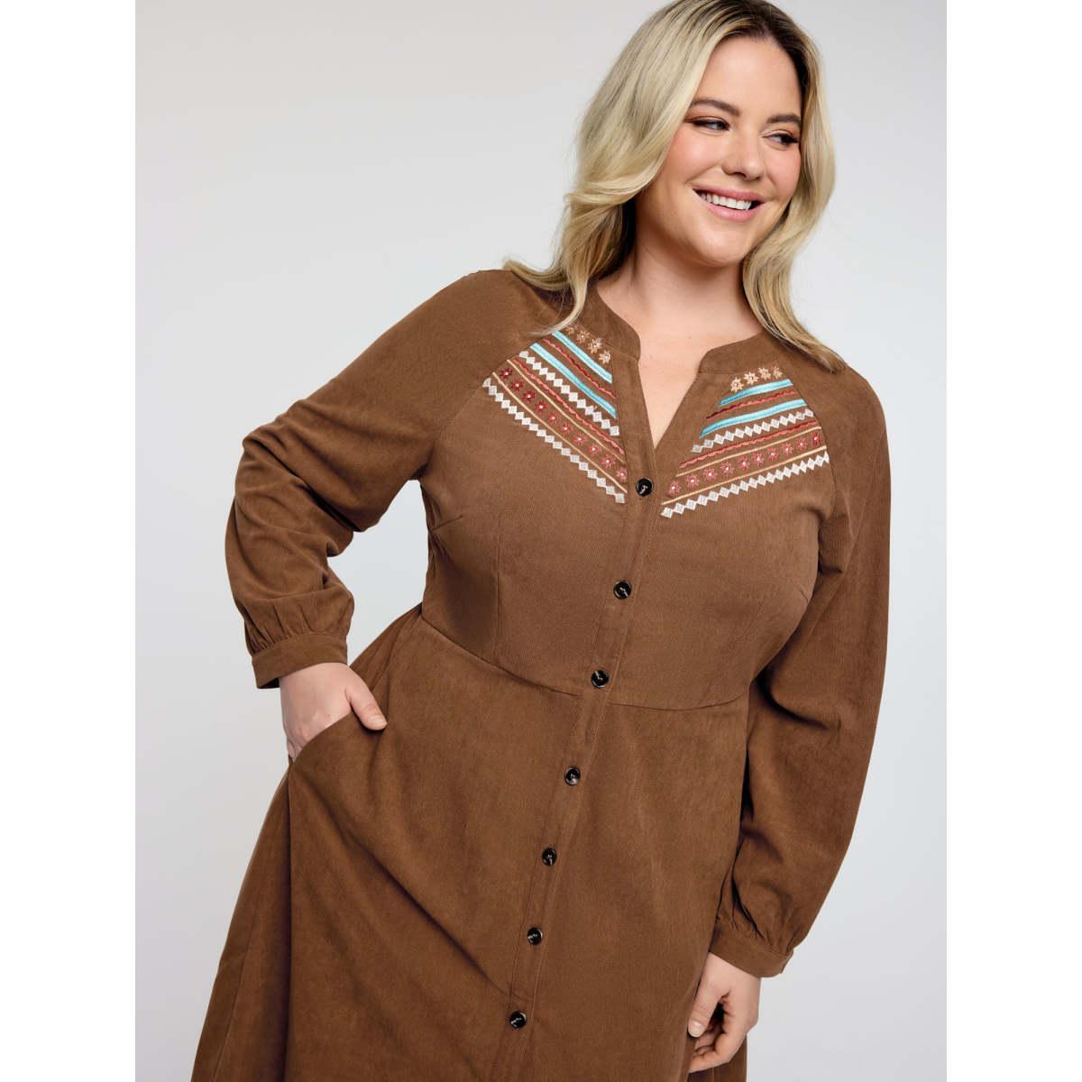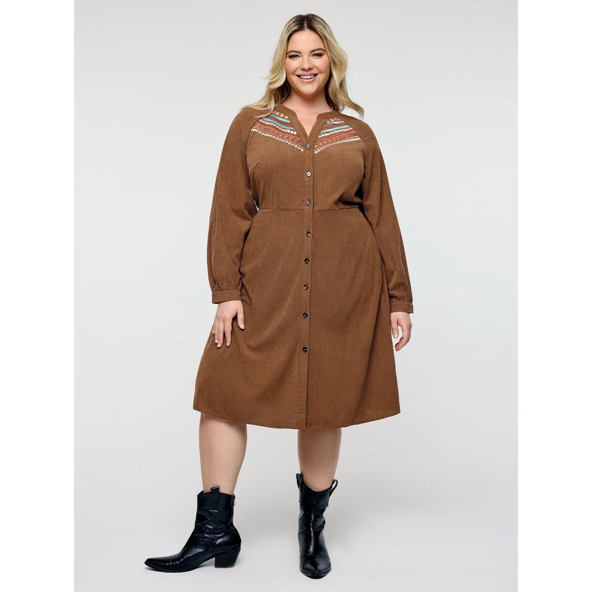 Plus Size Corduroy Embroidered Pockets Button Midi Dress Yellowishbrown Women Notched collar Long Sleeve Curvy BloomChic 22-24/3X