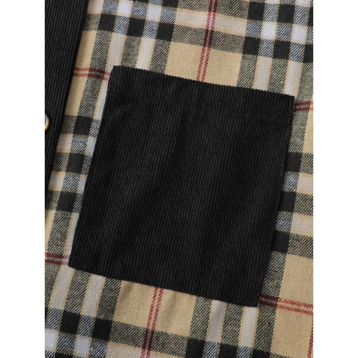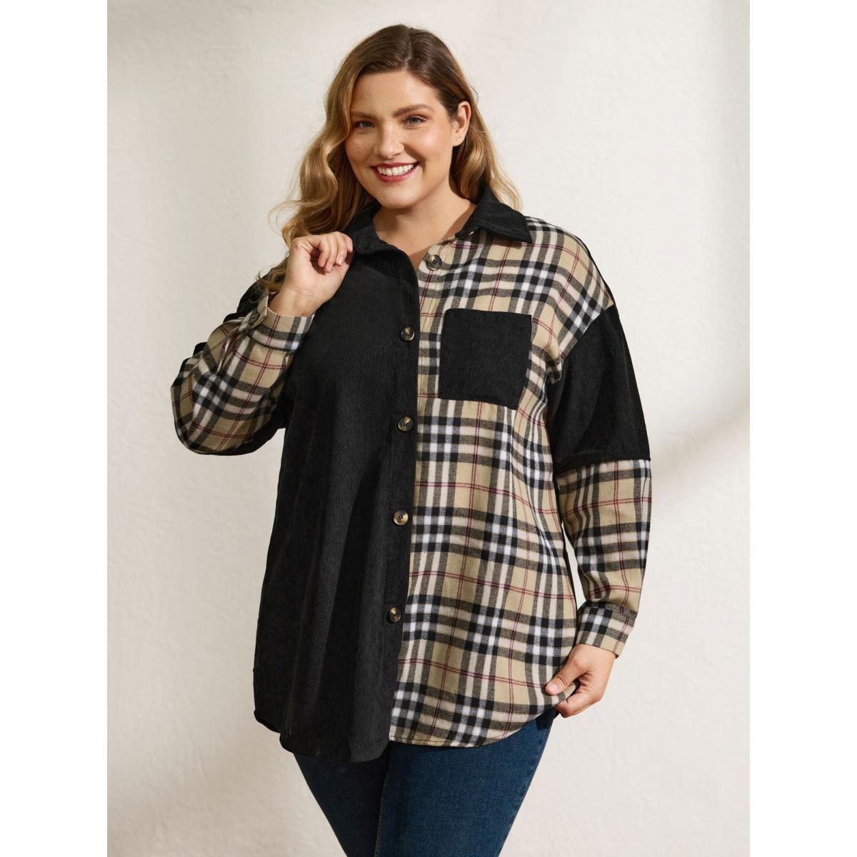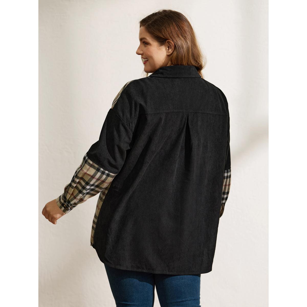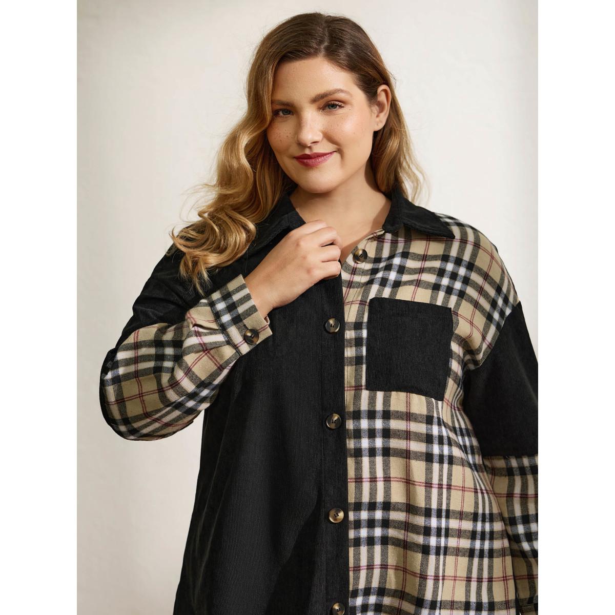 Plus Size Corduroy Plaid Print Contrast Jacket Women Black Texture Patch pocket Casual Jackets BloomChic 26/4X