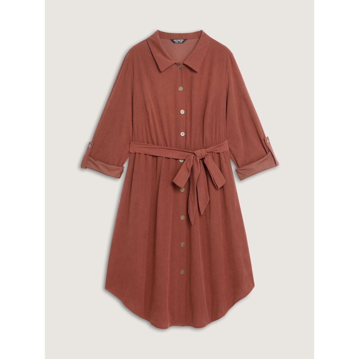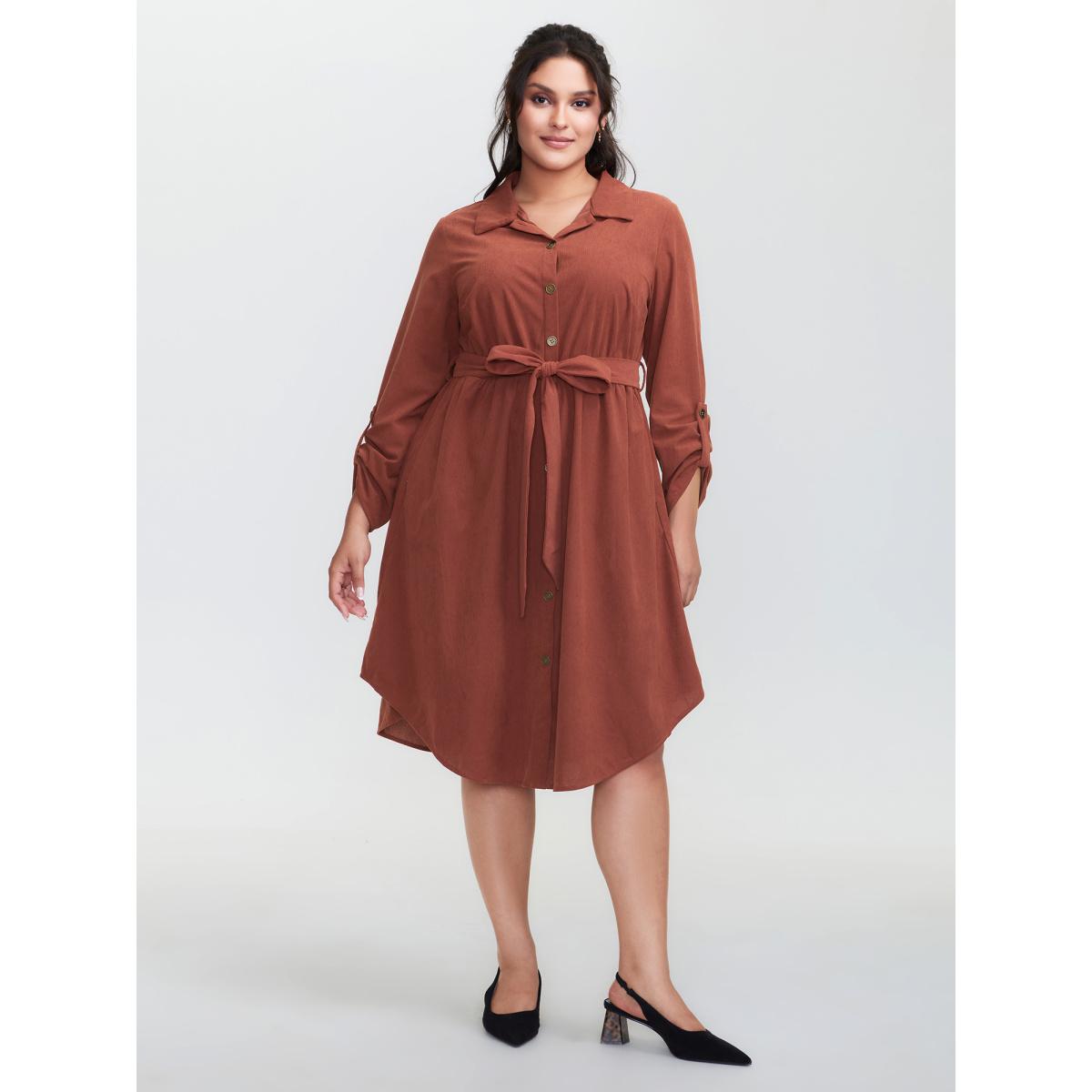Plus Size Corduroy Tab Sleeve Belted Midi Dress Rust Women Timeless Belted Shirt collar Long Sleeve Curvy BloomChic 18-20/2X