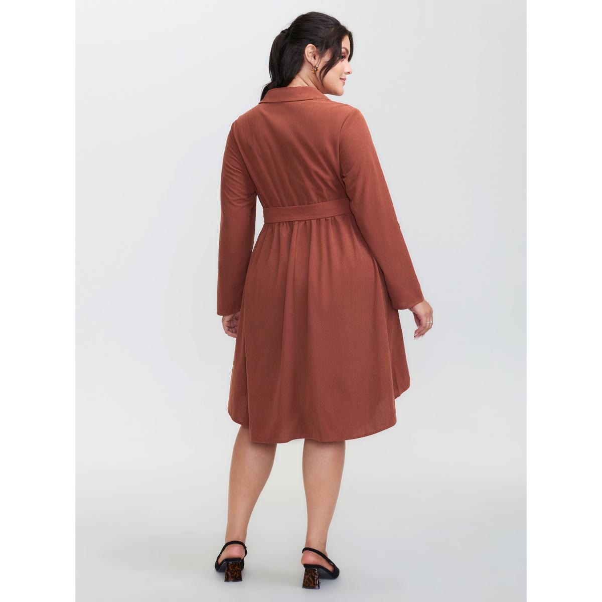 Plus Size Shirt Collar Button Through Belted Crepe Dress Rust Women At the Office Non Shirt collar Short sleeve Curvy Midi Dress BloomChic 12/L