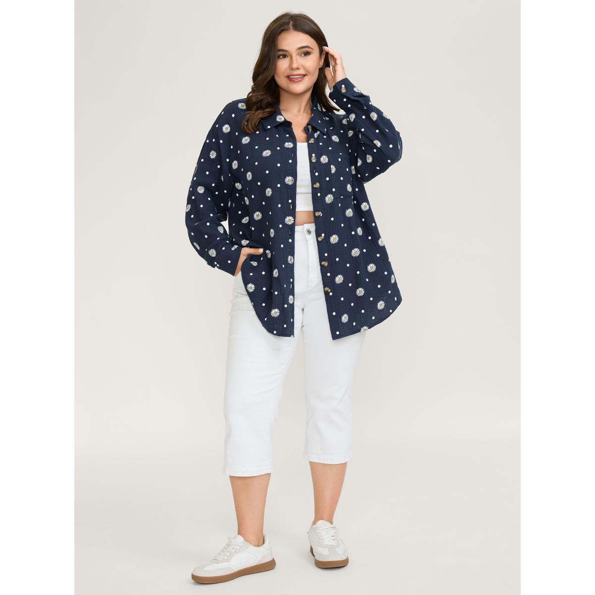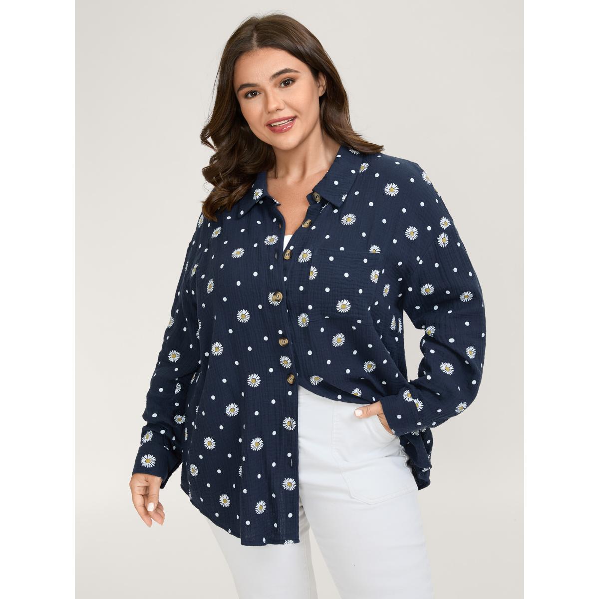 Plus Size Cotton Floral Print Button-Down Jacket Women Indigo Texture Loose Patch pocket Casual Jackets BloomChic 30/6X