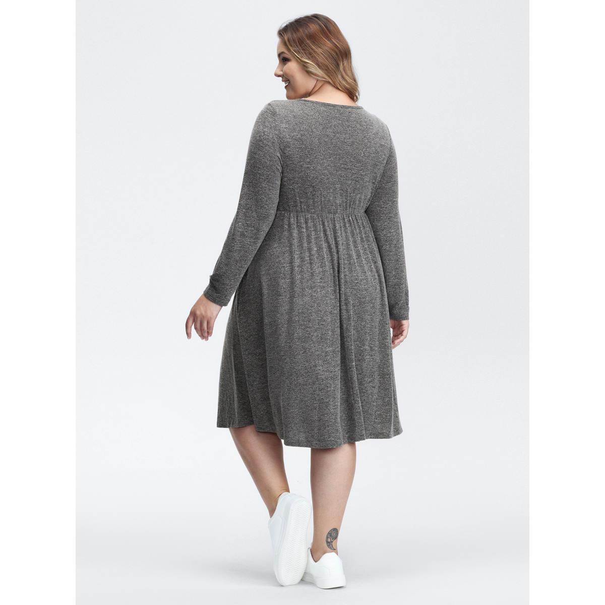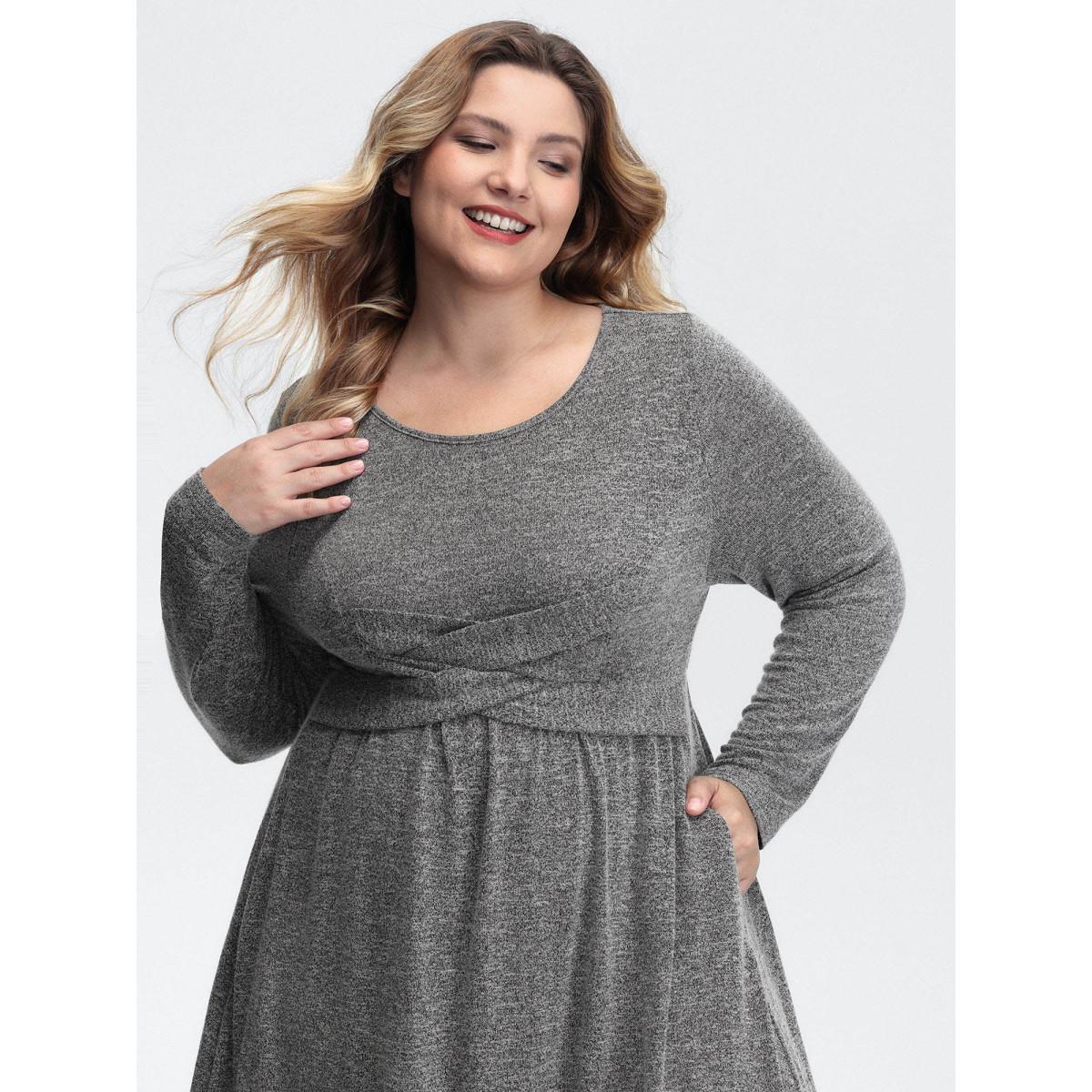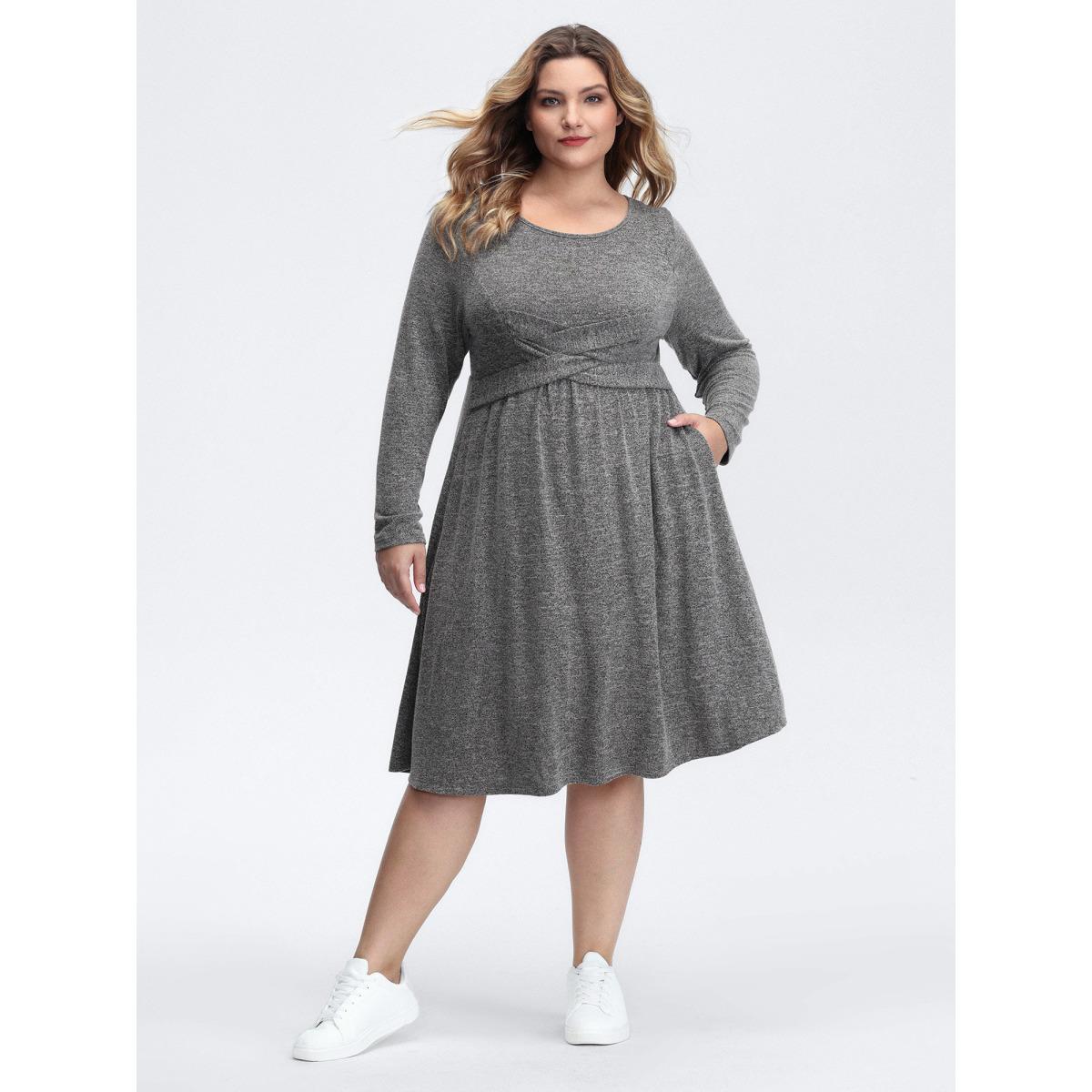 Plus Size Crossover Waist-Defining Round Neck Midi Dress DimGray Women Leisure Overlapping Round Neck Extra Long Sleeve Curvy BloomChic 18-20/2X