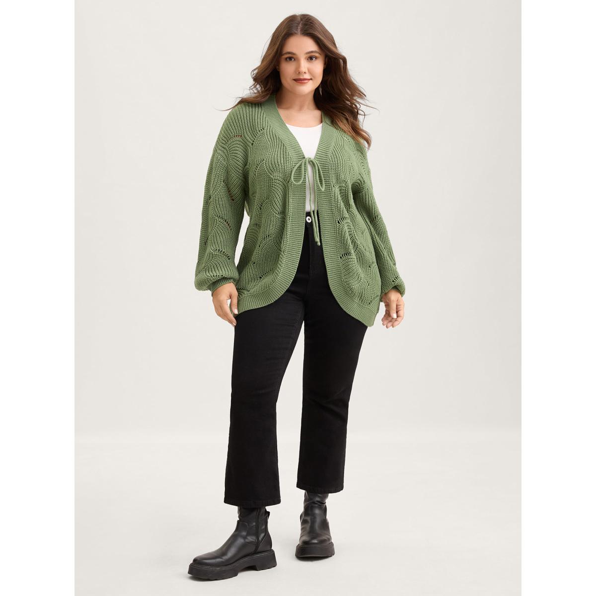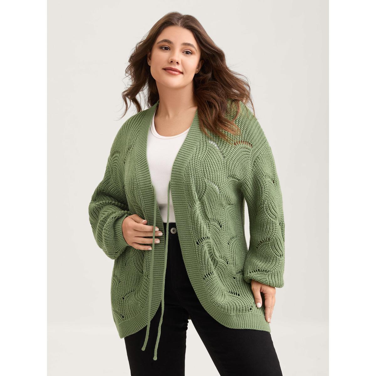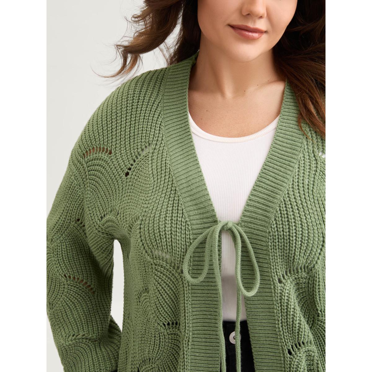 Plus Size Solid Ties Front Cable Knit Cardigan Green Women Casual Long Sleeve Dailywear Cardigans BloomChic 28/5X