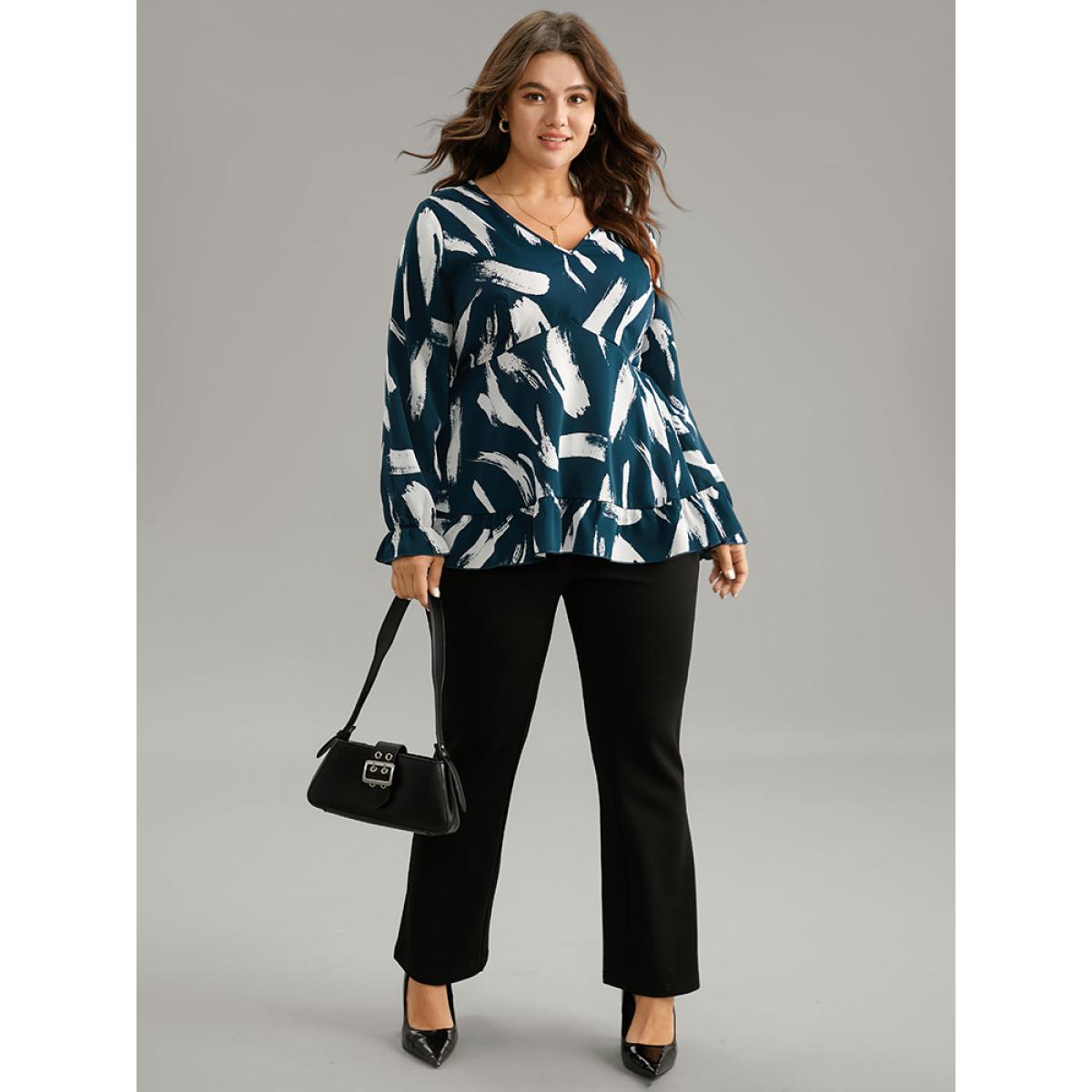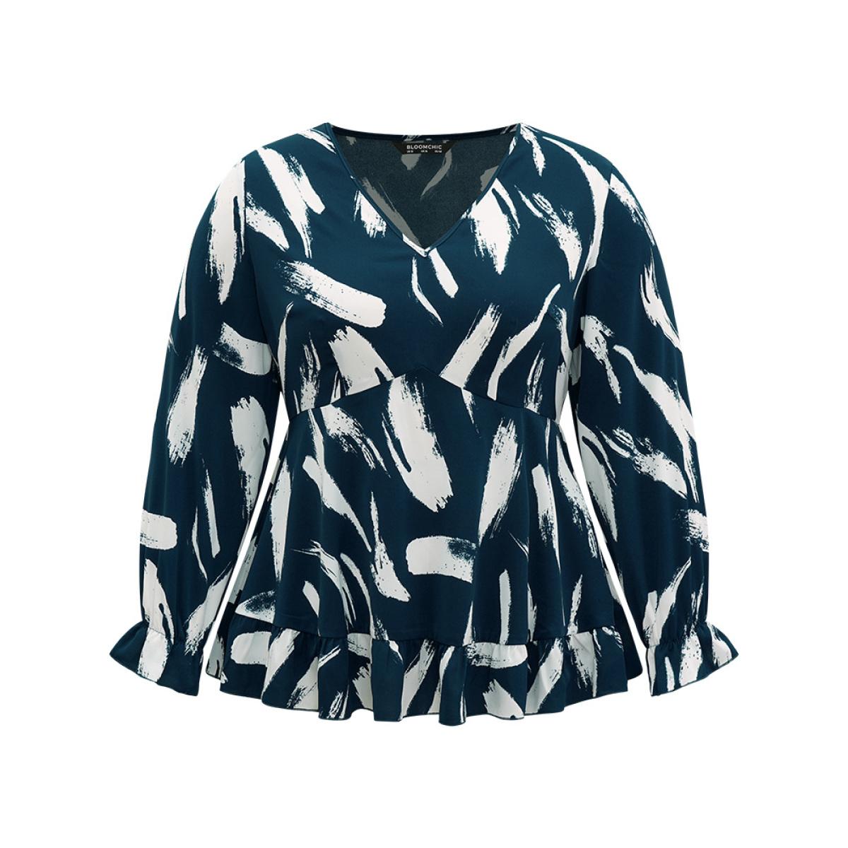 Plus Size Cyan Brush Print Elastic Waist V Neck Ruffles Blouse Women Office Long Sleeve V-neck Work Blouses BloomChic 18-20/2X
