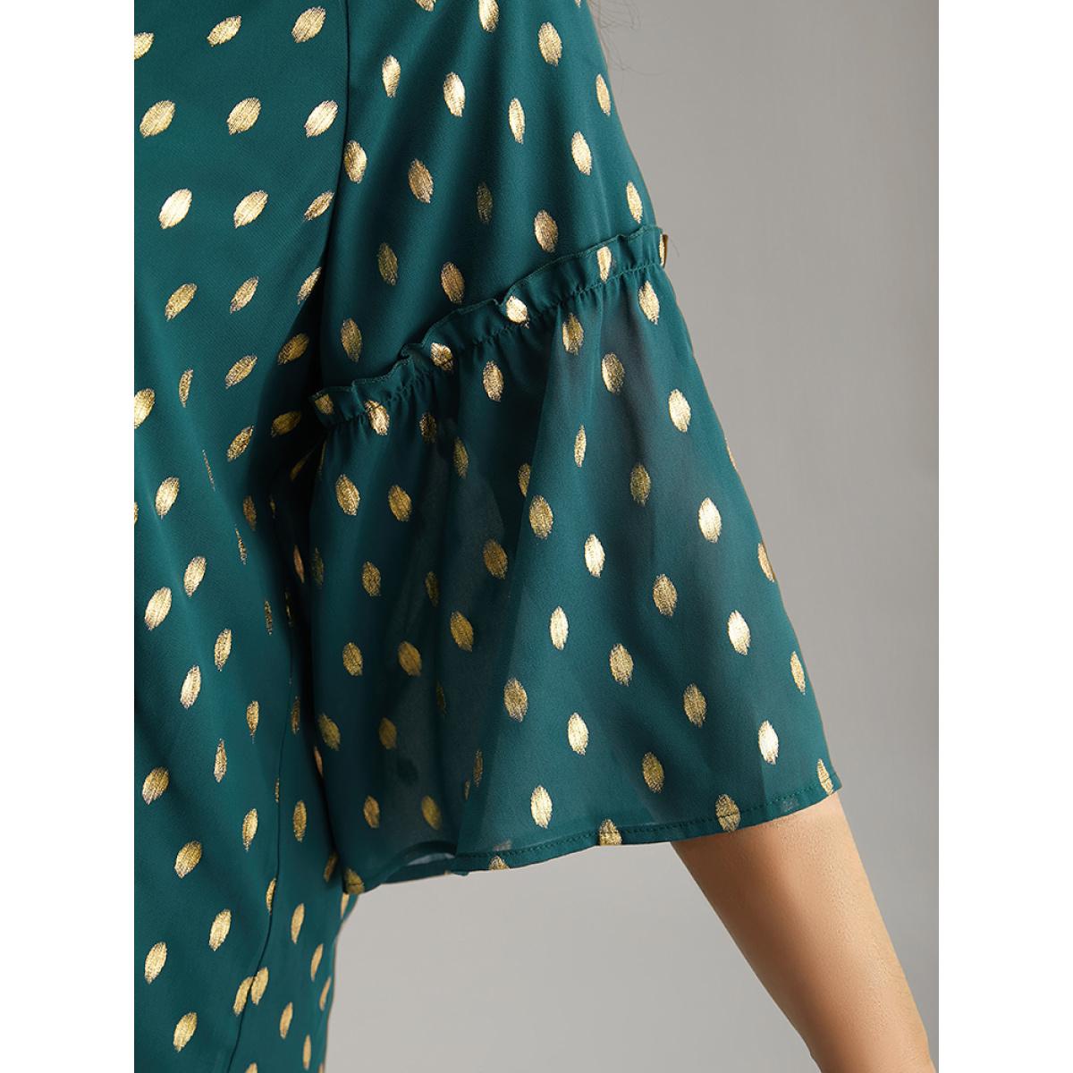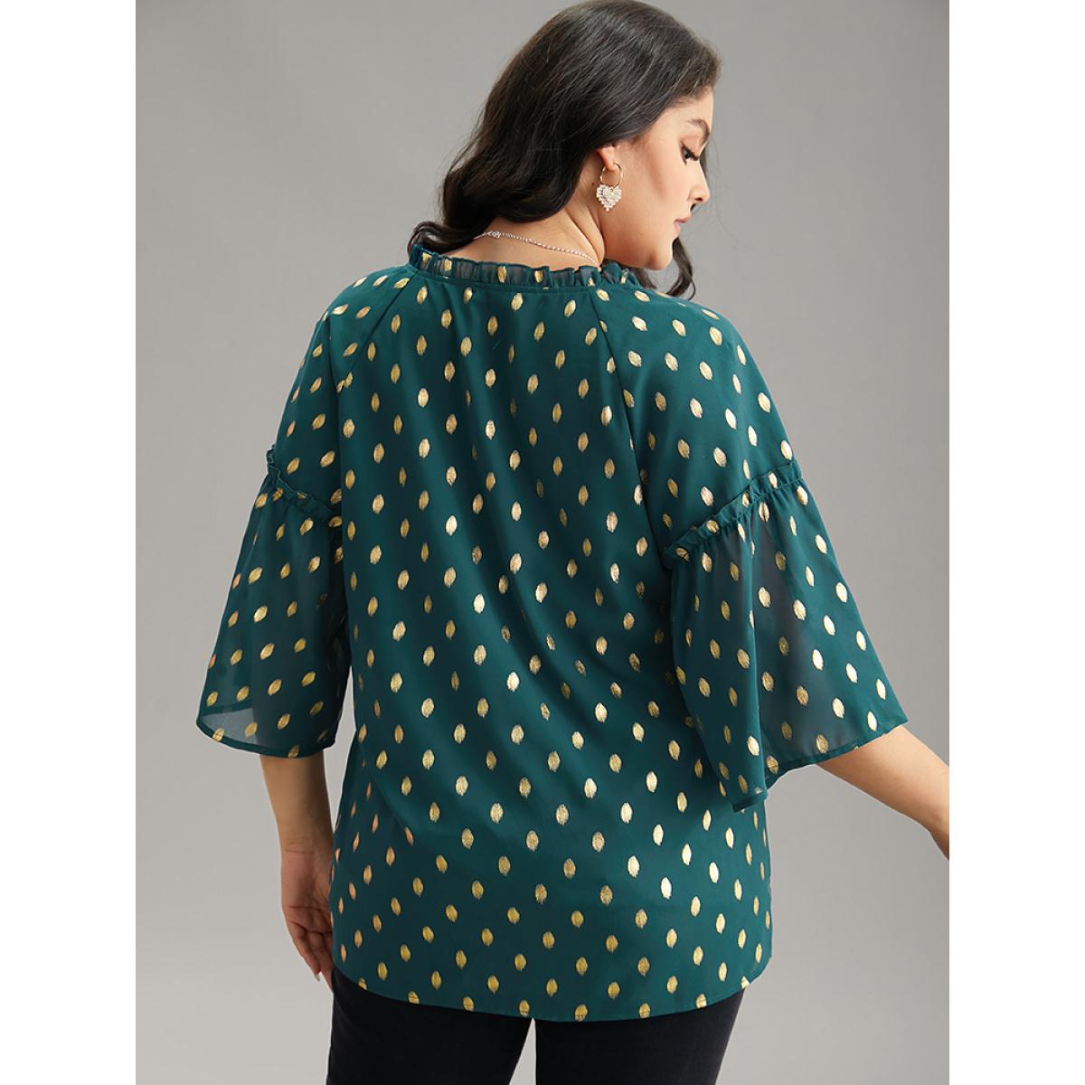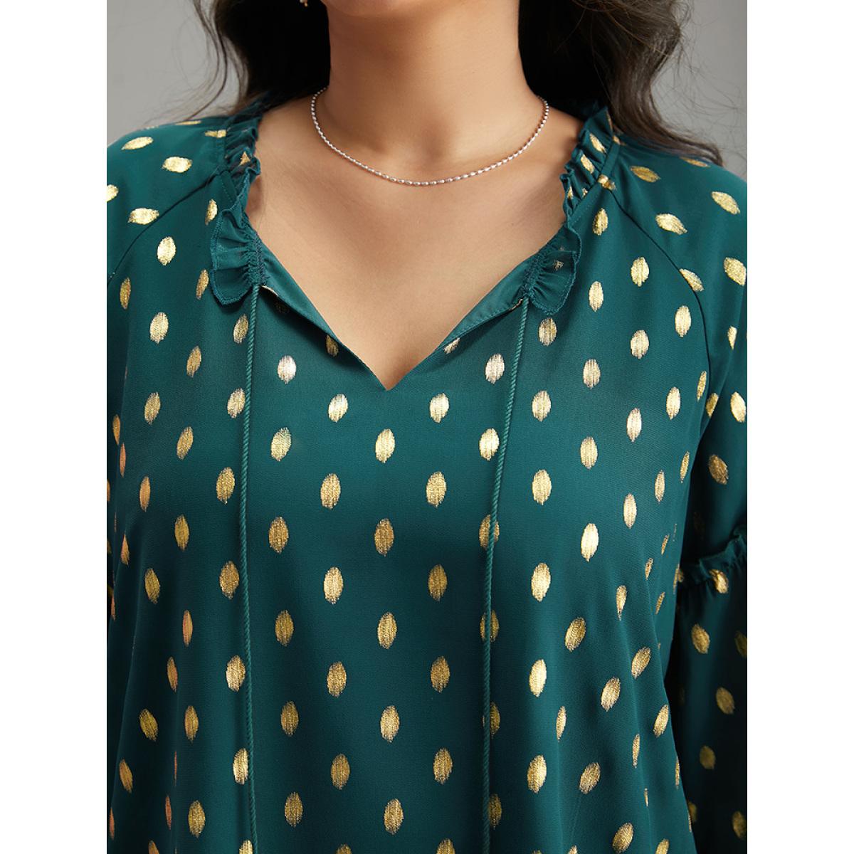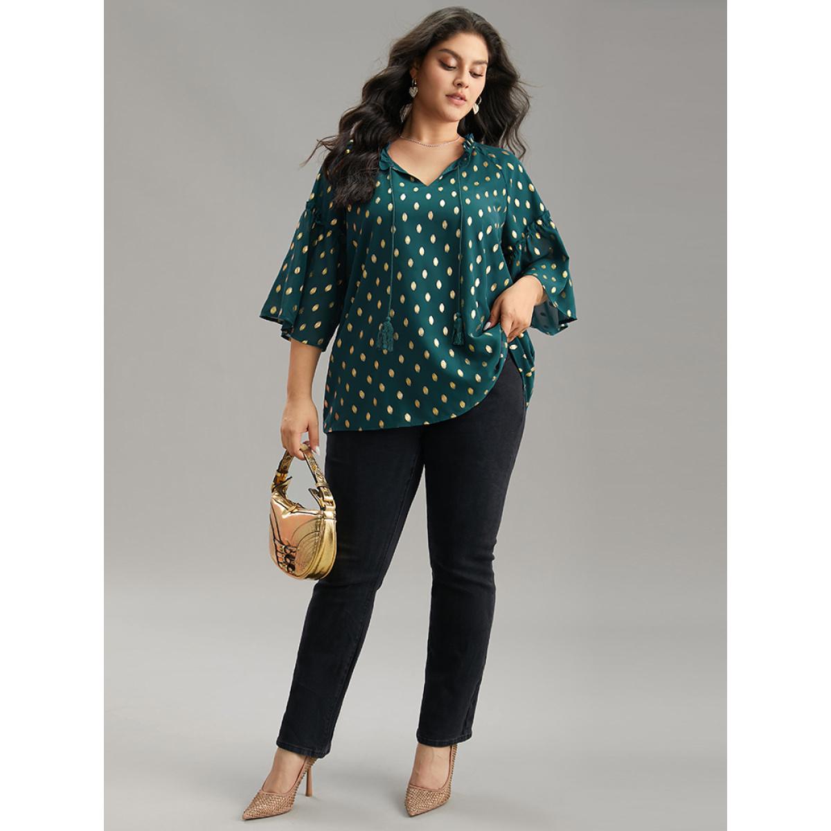 Plus Size Cyan Geo Glitter Tassels Ties Blouse Women Glamour Elbow-length sleeve Tie Neck Going out Blouses BloomChic 18-20/2X