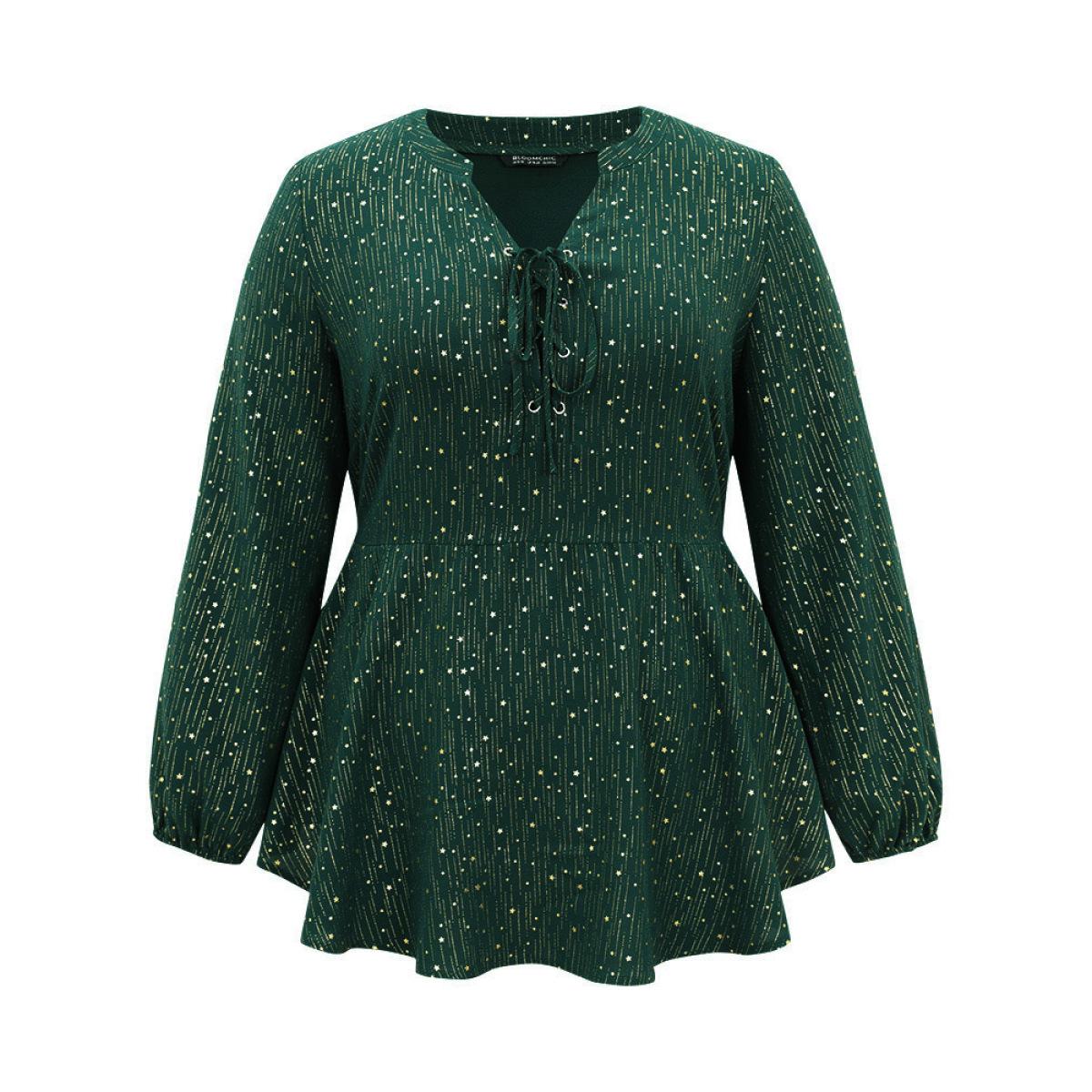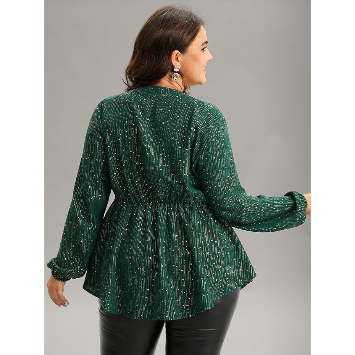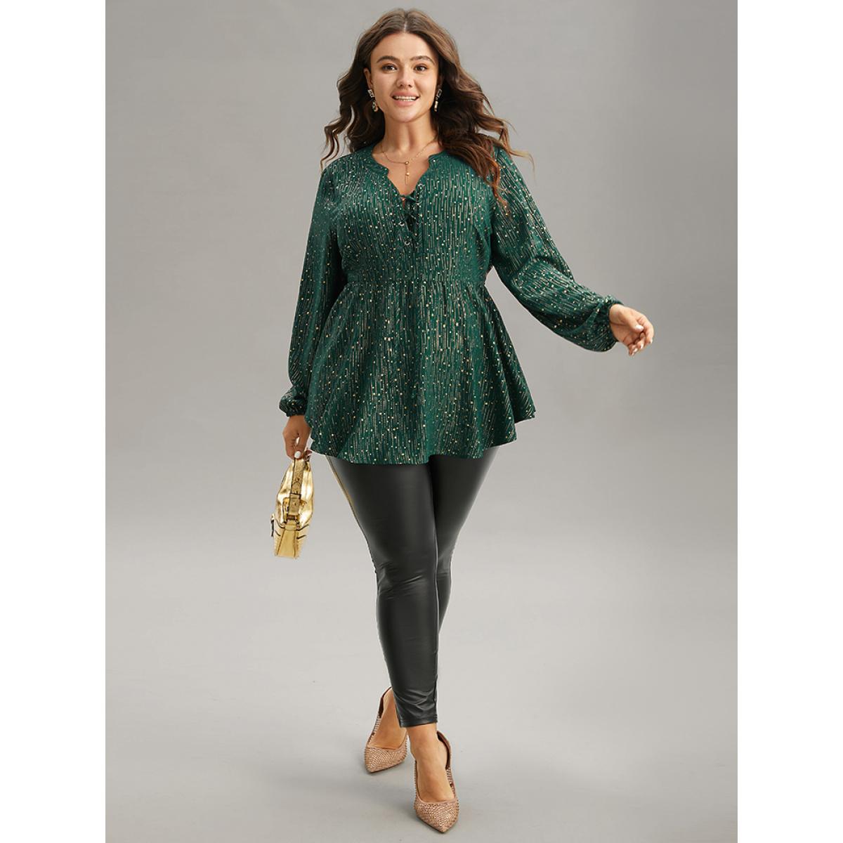 Plus Size Cyan Glitter Lantern Sleeve Elastic Waist Lace Up Blouse Women Party&Cocktail V-neck Party Blouses BloomChic 12/L Product Image
