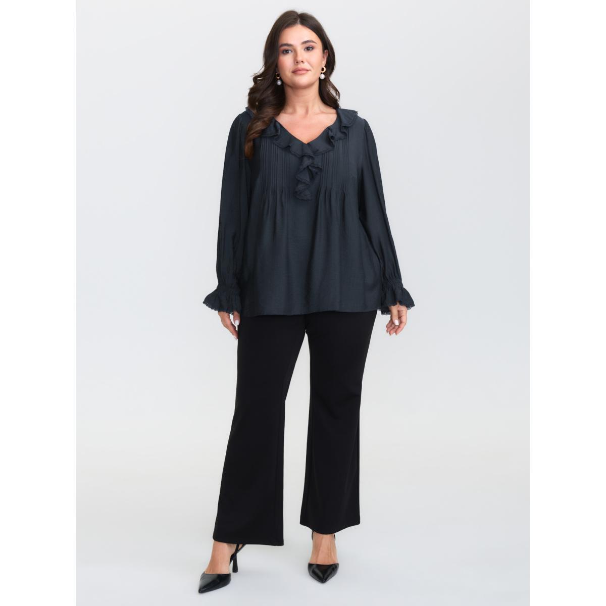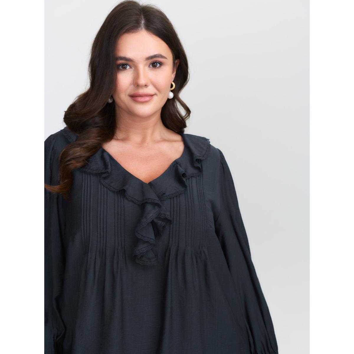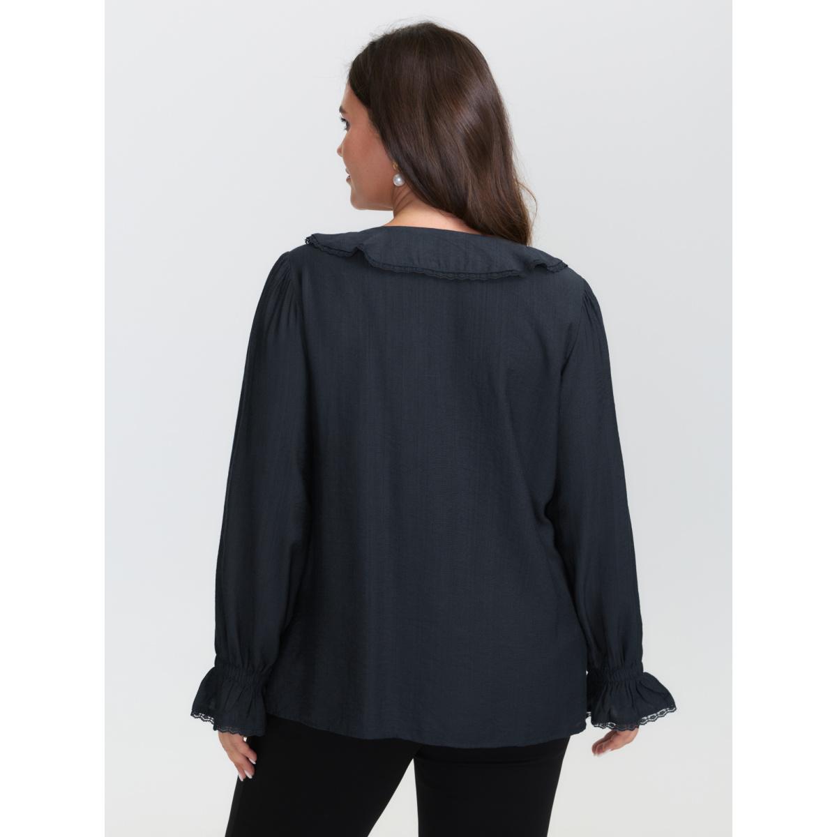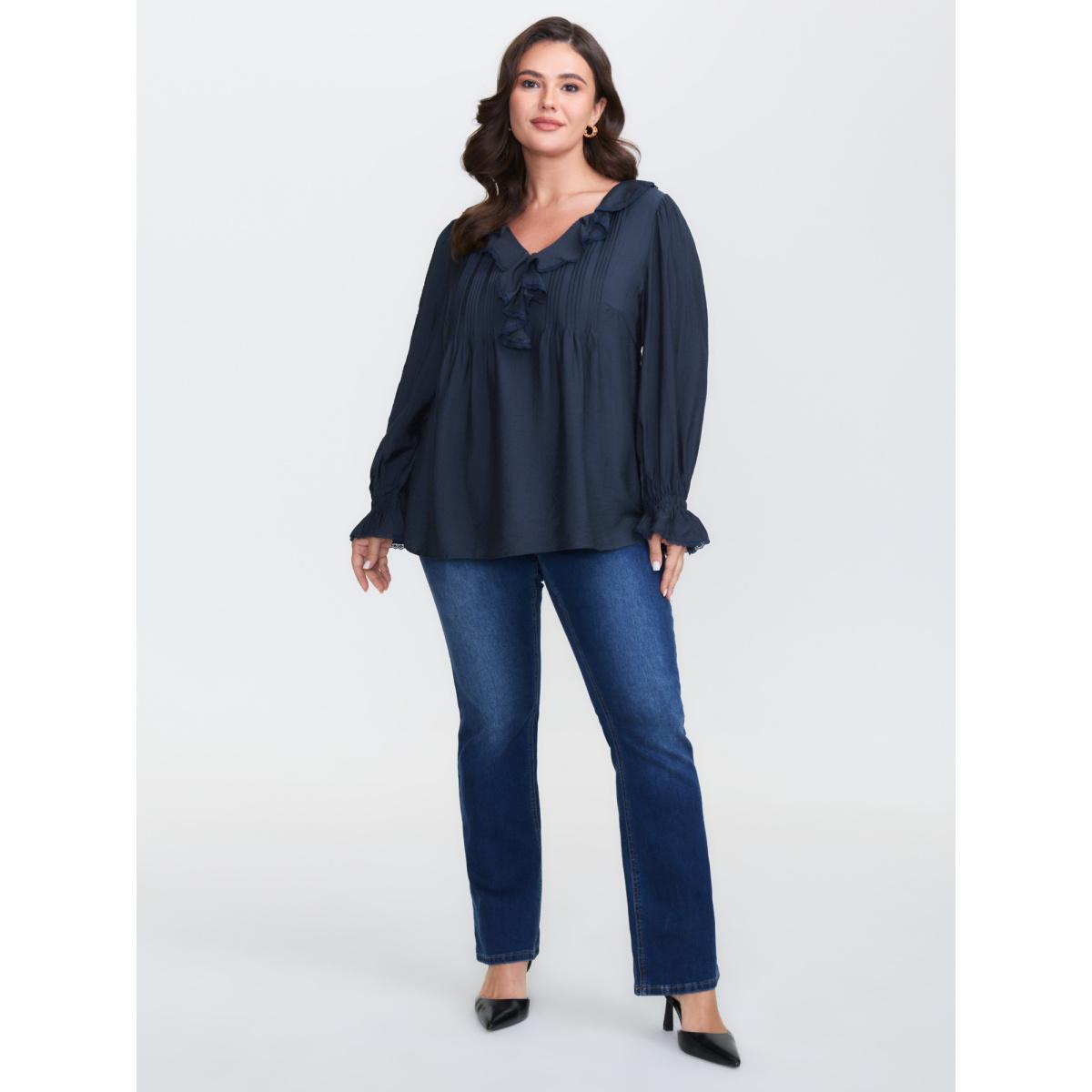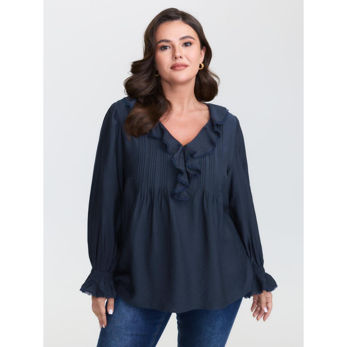 Plus Size DarkBlue Ruffled Neckline Stretchy Cuffs Blouse Women Romantic Extra Long Sleeve Lace collar Elegant Blouses BloomChic 22-24/3X