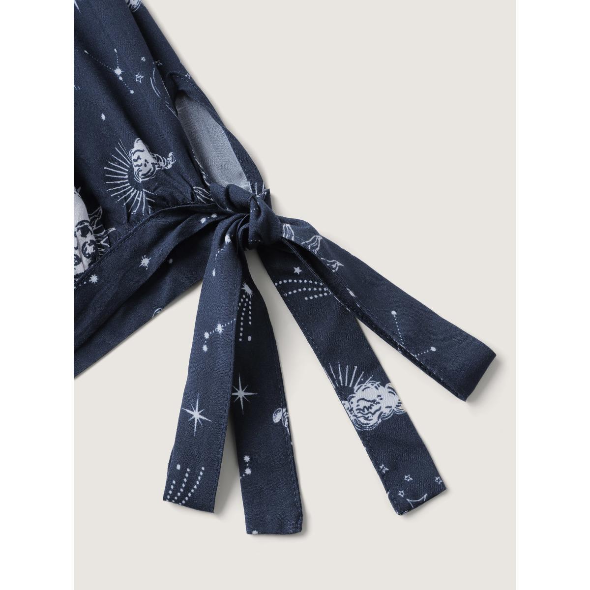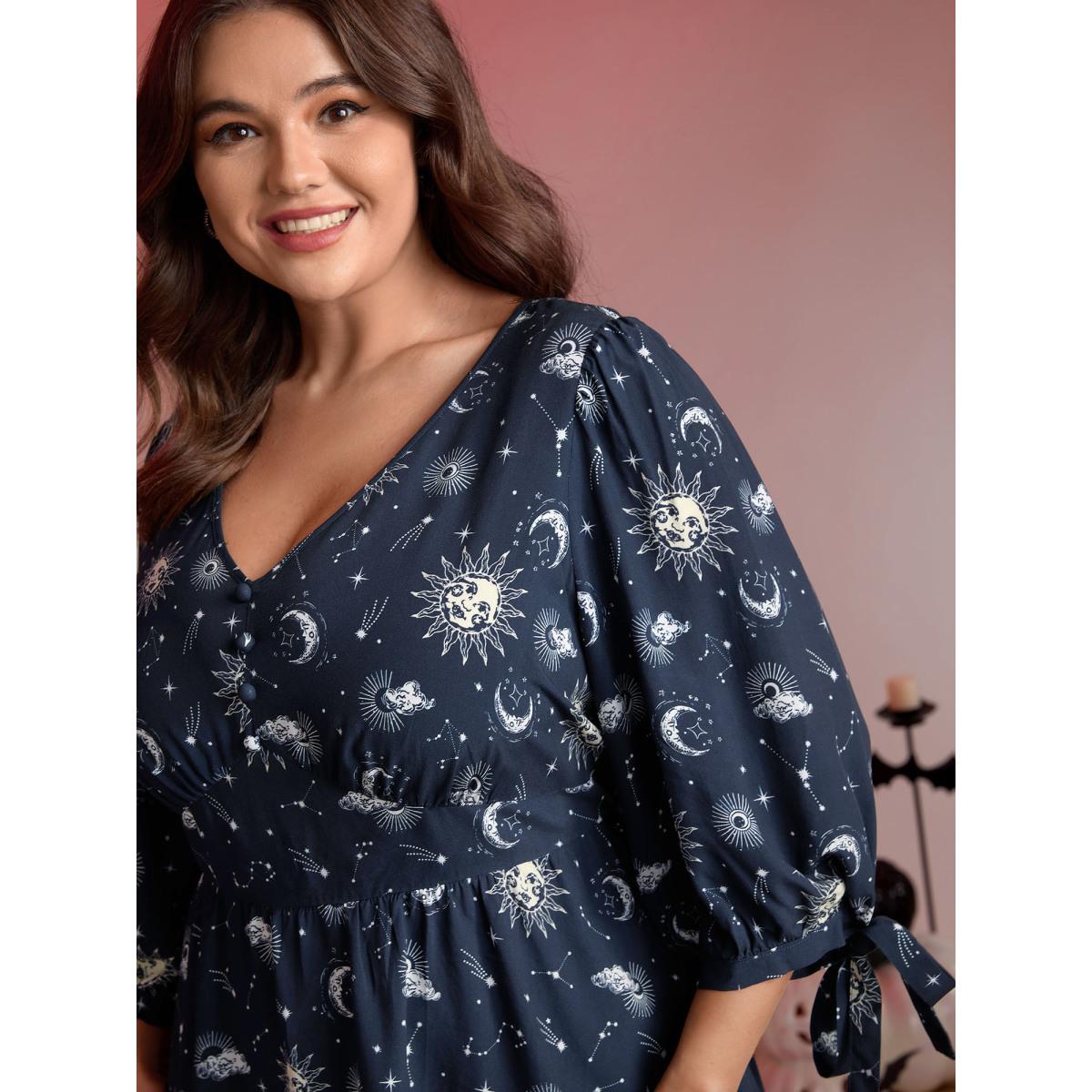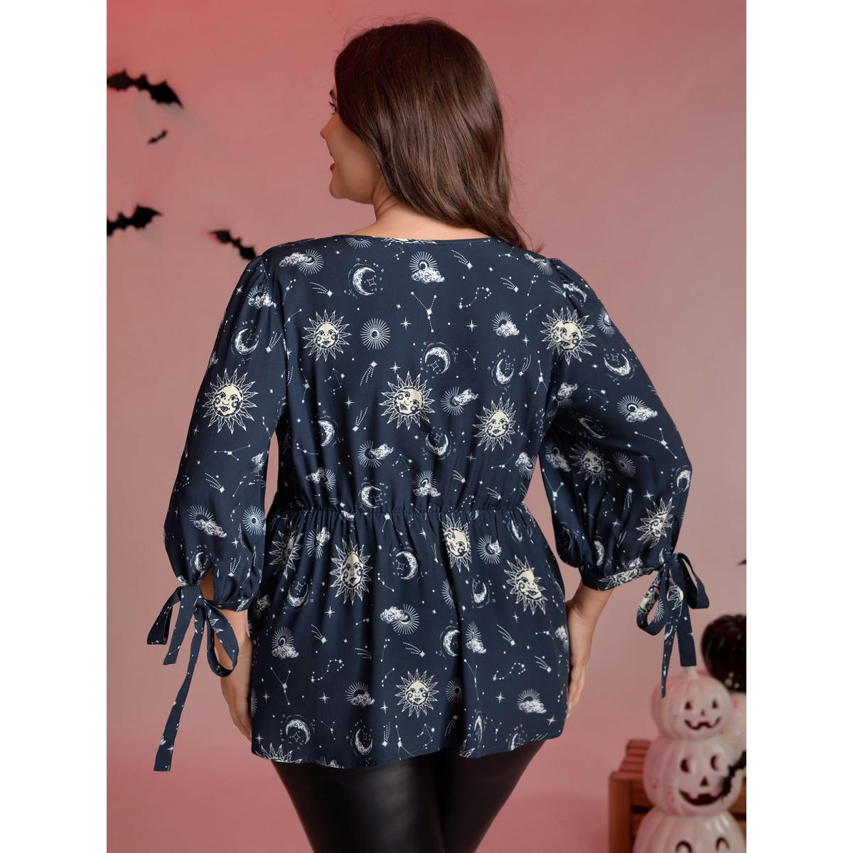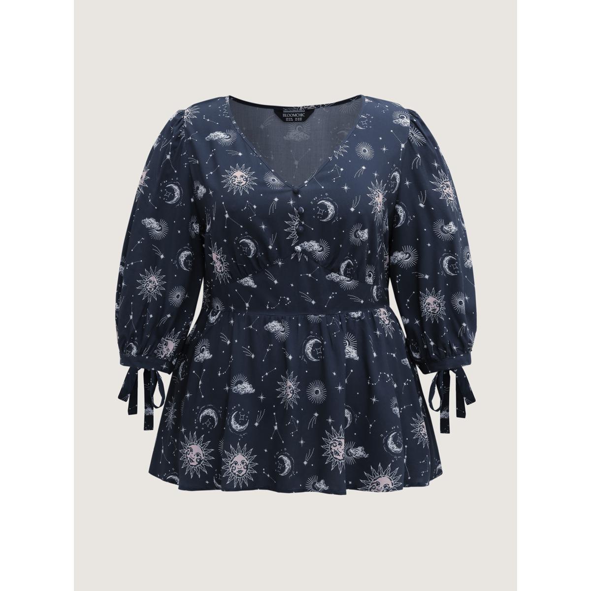 Plus Size DarkBlue Star and Moon Print Sleeve Tie Blouse Women Timeless Elbow-length sleeve V-neck Elegant Blouses BloomChic 22-24/3X