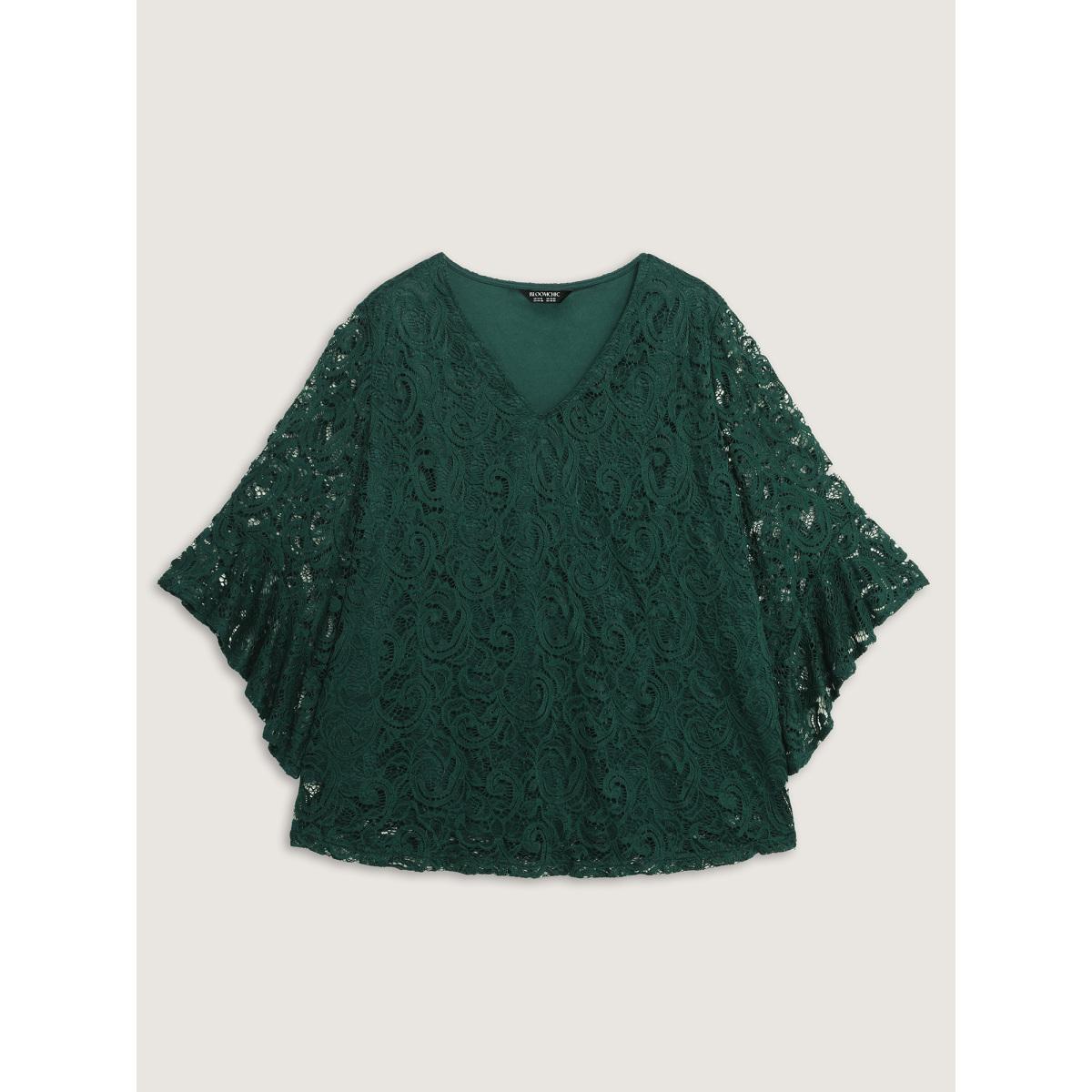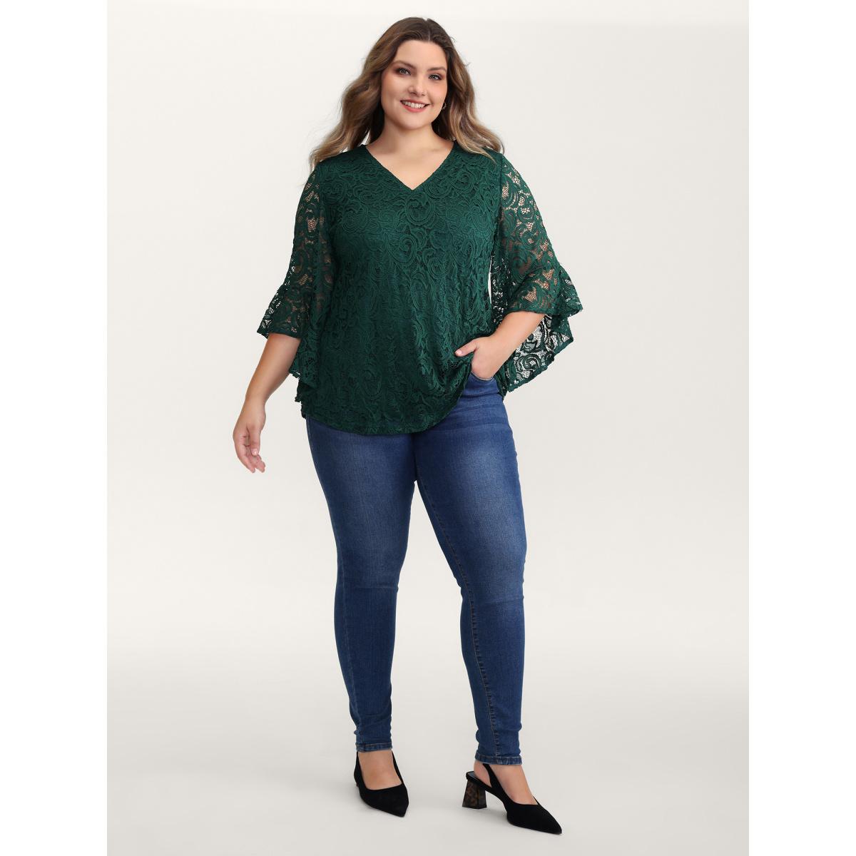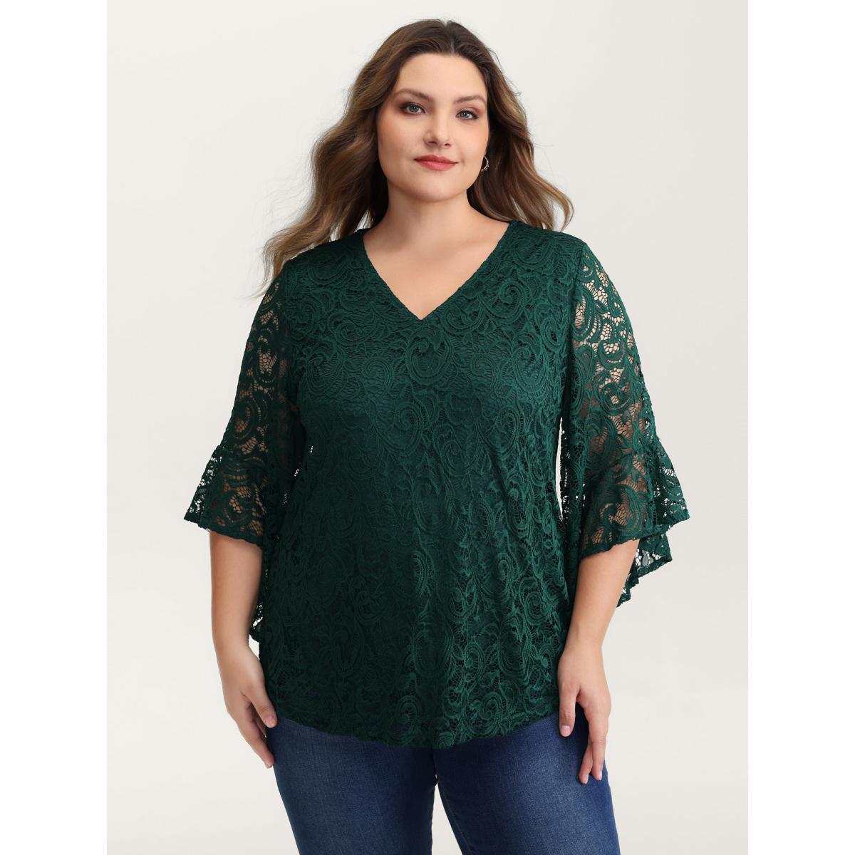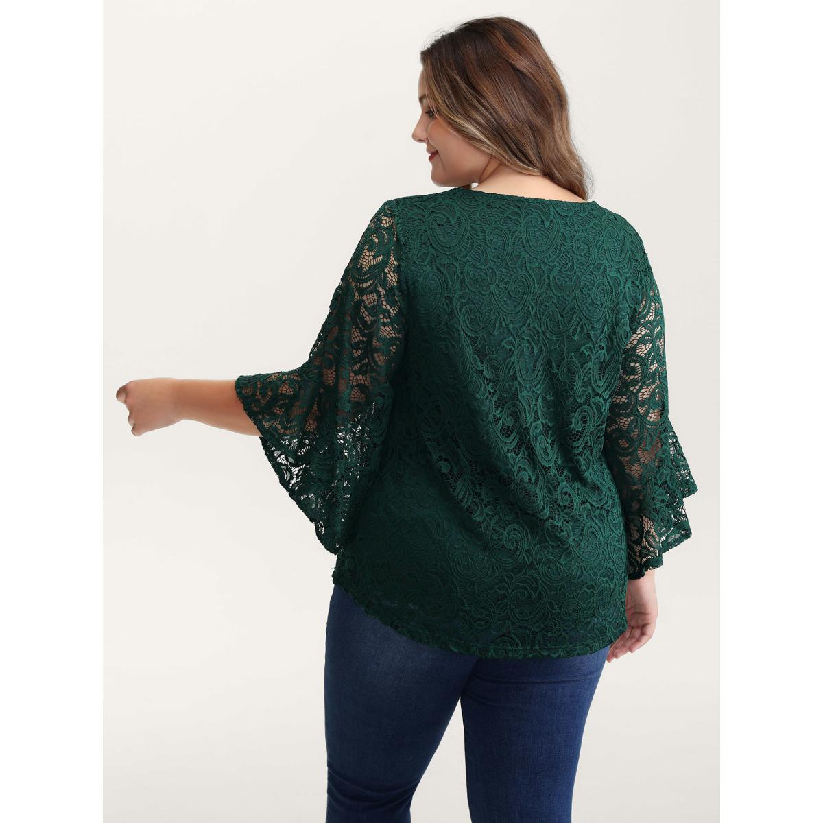 Plus Size DarkGreen Lace Sheer Flared Sleeve V-Neck Blouse Women Romantic Elbow-length sleeve V-neck Elegant Blouses BloomChic 28/5X