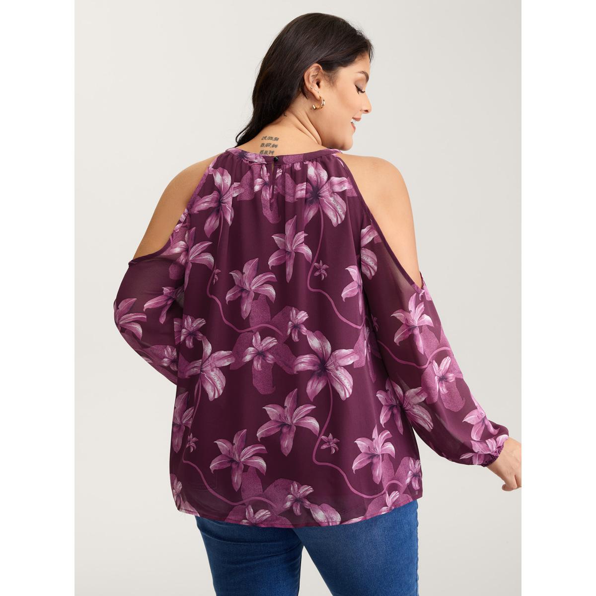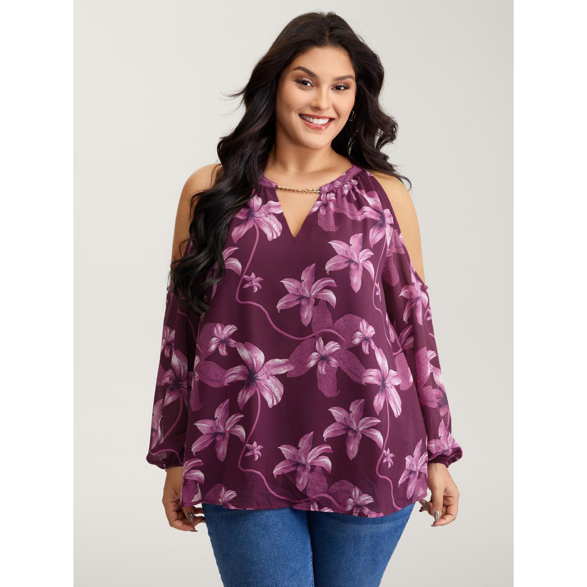Plus Size Deeppurplered Off-Shoulder Floral Print Metal Detail Blouse Women Romantic Long Sleeve Notched collar Elegant Blouses BloomChic 14-16/1X