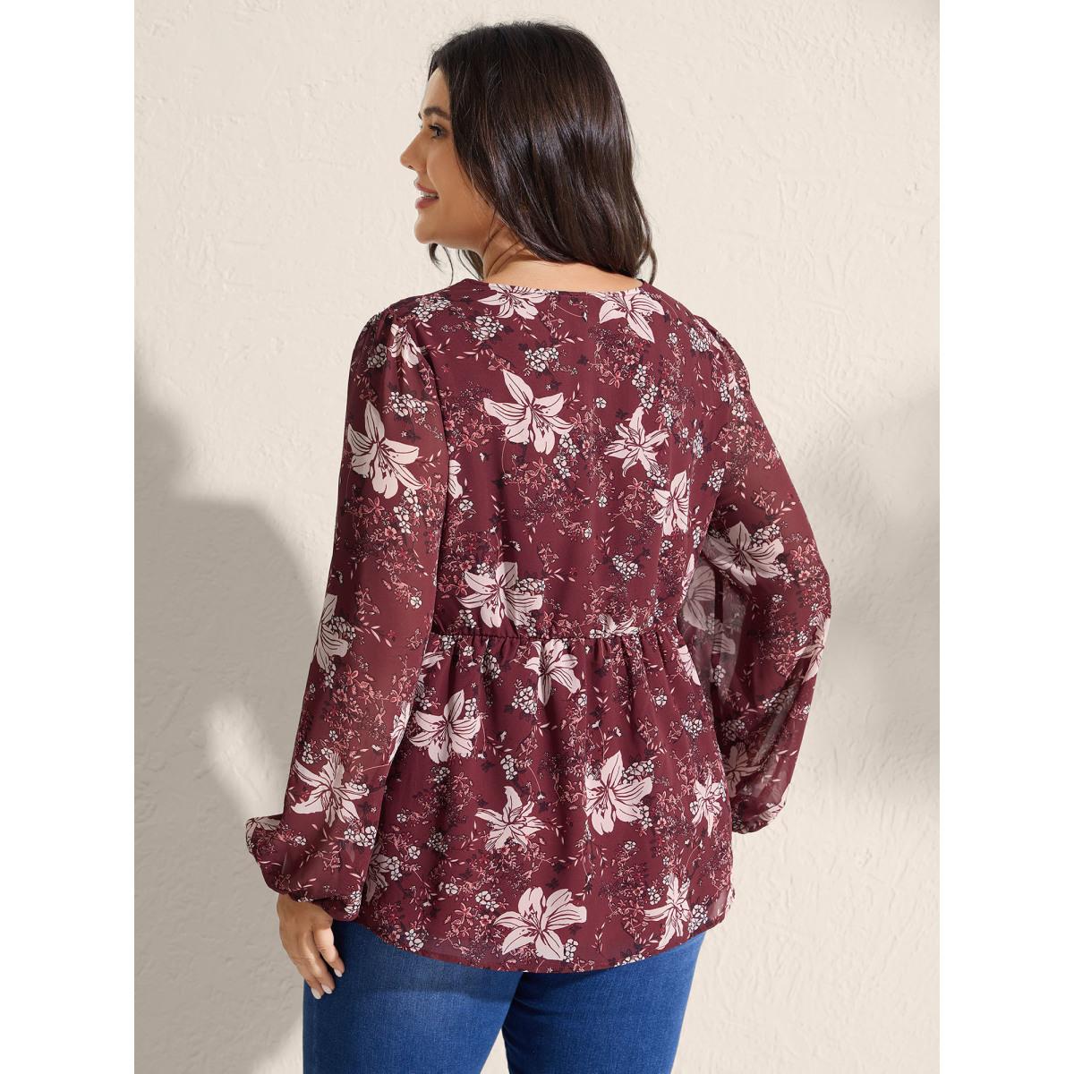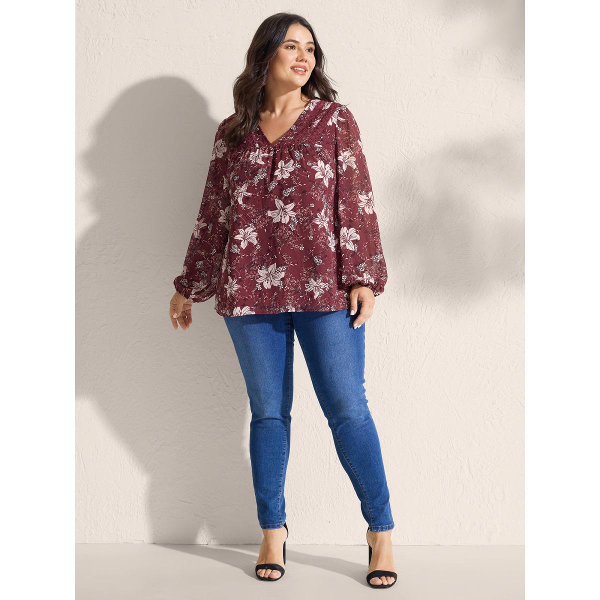 Plus Size Rosered Floral Shirred Frill Trim Lantern Sleeve Blouse Women Elegant Long Sleeve V-neck Everyday Blouses BloomChic 22-24/3X