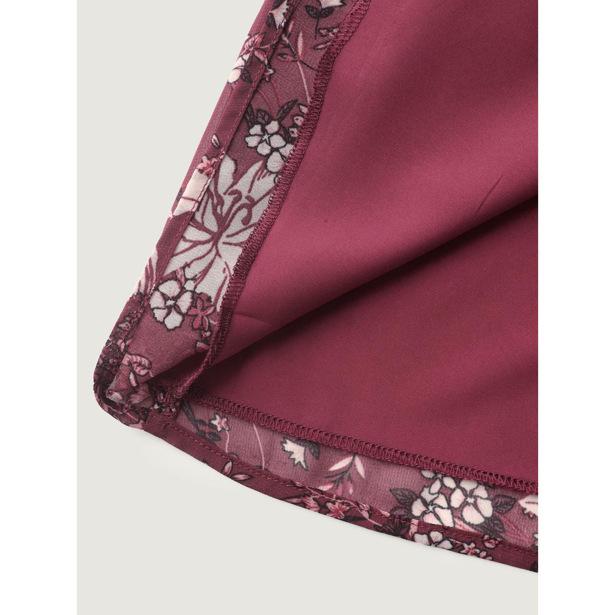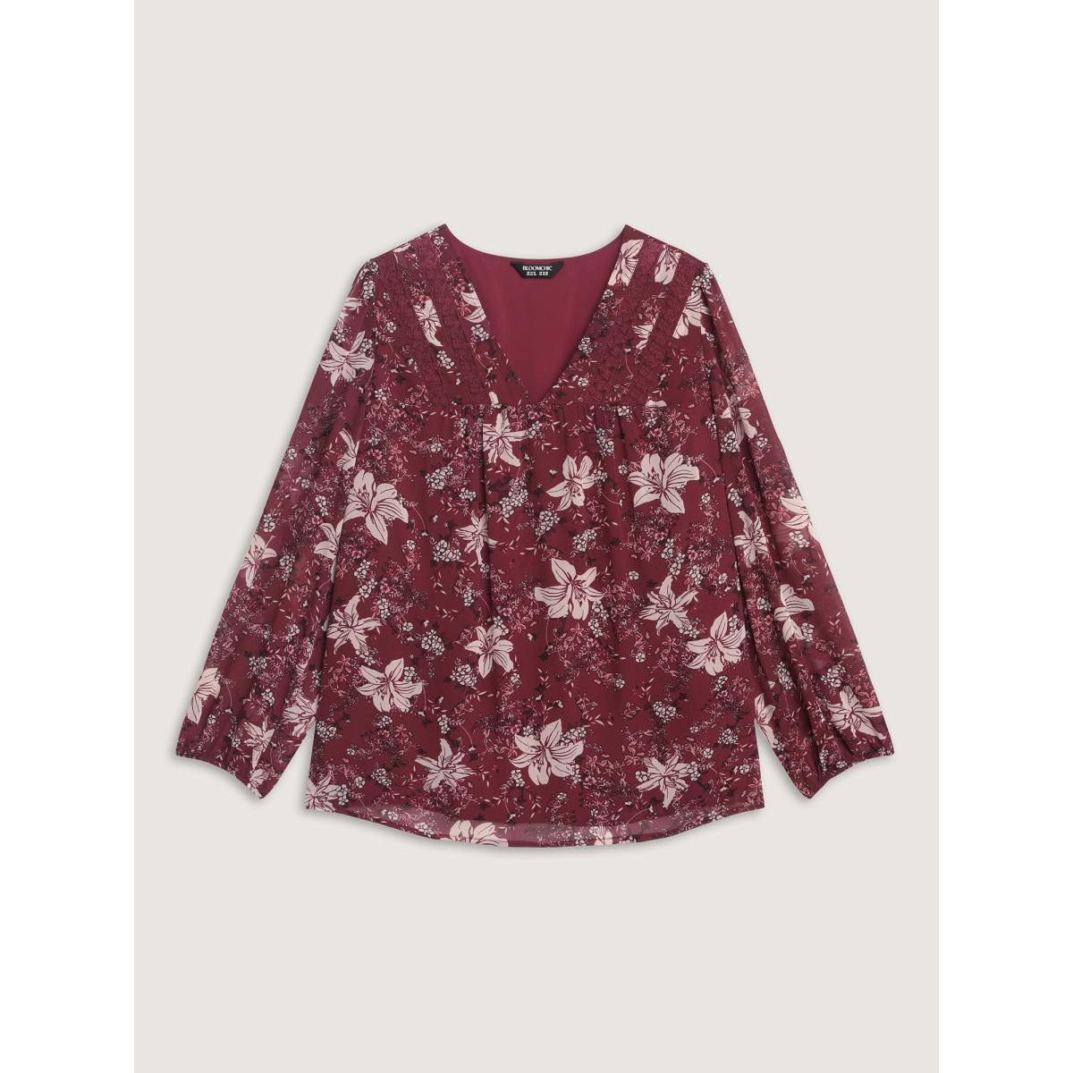 Plus Size Deepred Fall Floral Print Lace Trim Blouse Women Timeless Long Sleeve V-neck Elegant Blouses BloomChic 18-20/2X