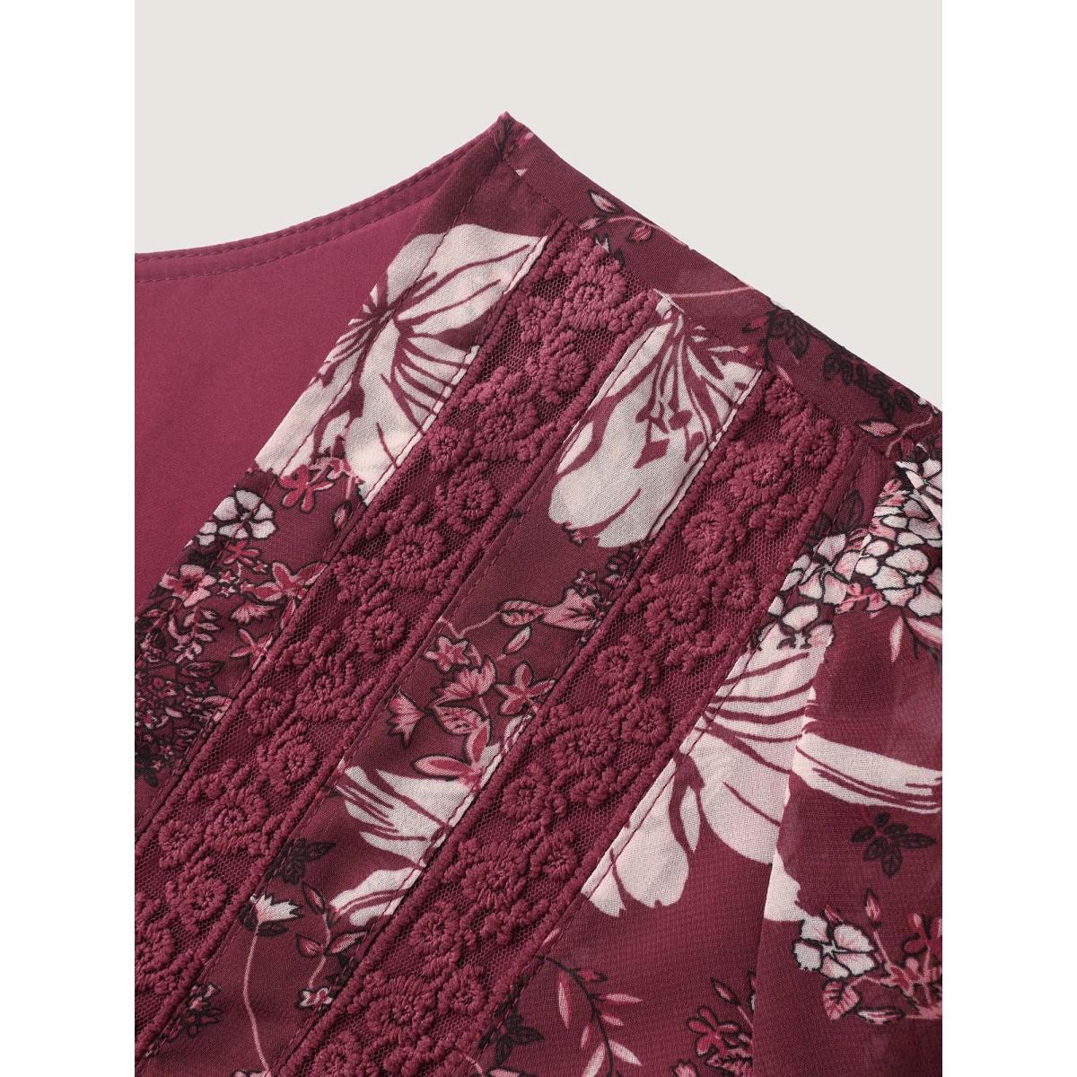 Plus Size Deepred Fall Floral Print Lace Trim Blouse Women Timeless Long Sleeve V-neck Elegant Blouses BloomChic 18-20/2X Product Image