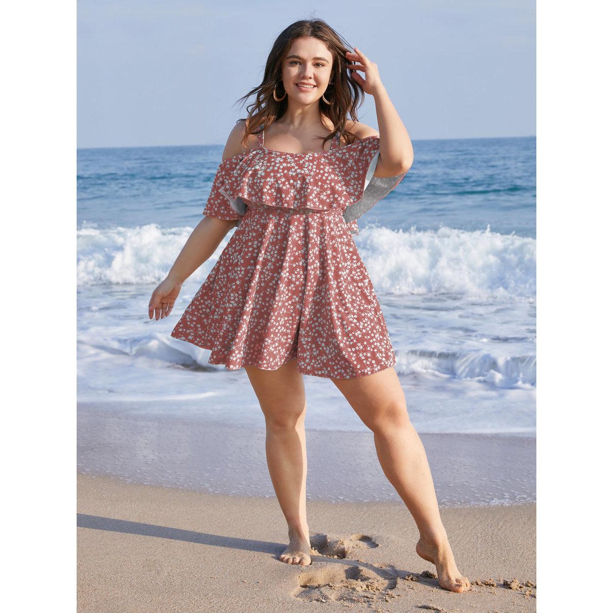 Plus Size Ditsy Floral Cold Shoulder Sculpt Waist Ruffles Swim Dress Women's Swimwear Salmon Beach Bodycon One-shoulder neck High stretch Curve Swim Dresses BloomChic 28/5X