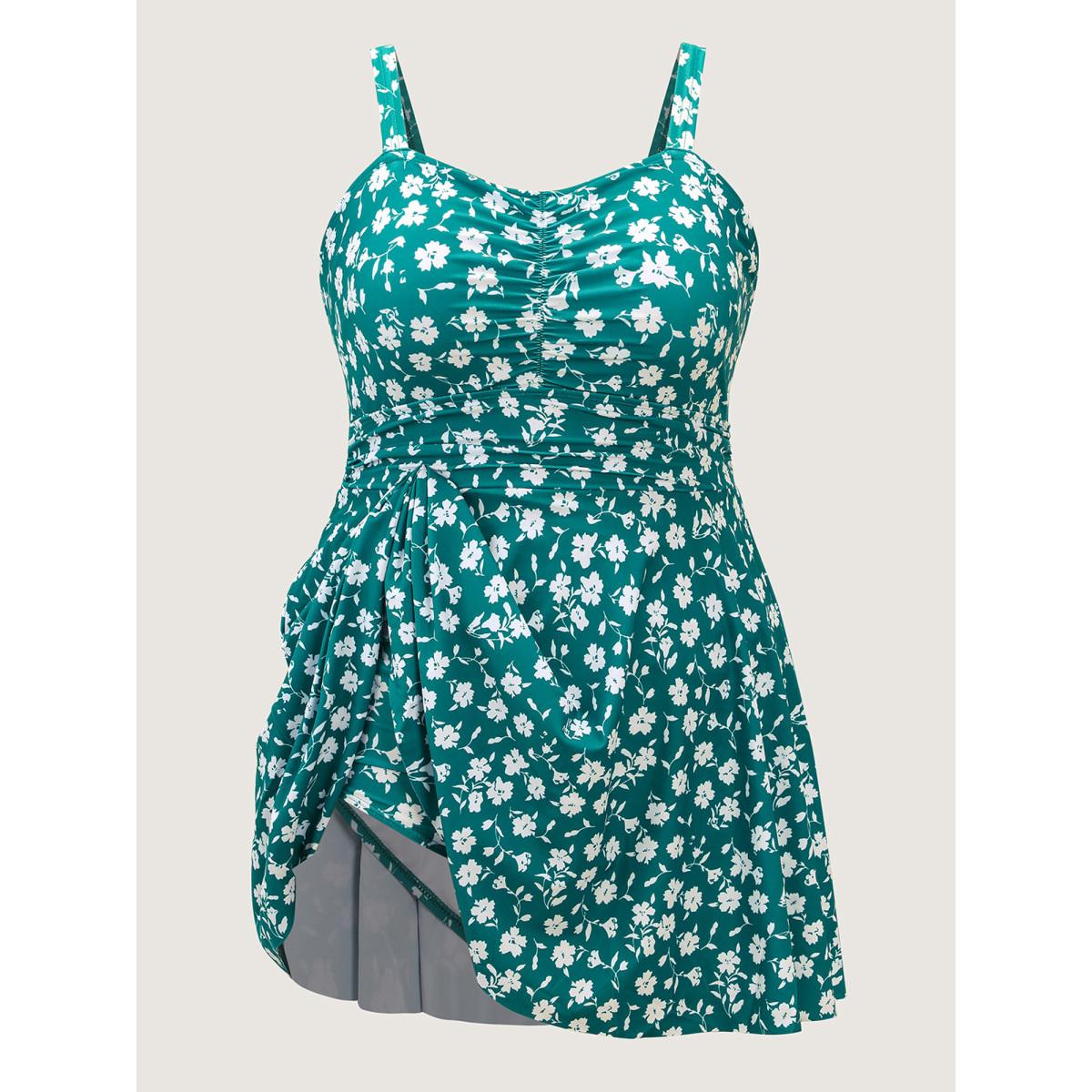 Plus Size Ditsy Floral Ruched Empire Waist Swim Dress Women's Swimwear Teal Resort Bodycon Heart neckline High stretch Curve Swim Dresses BloomChic 26/4X