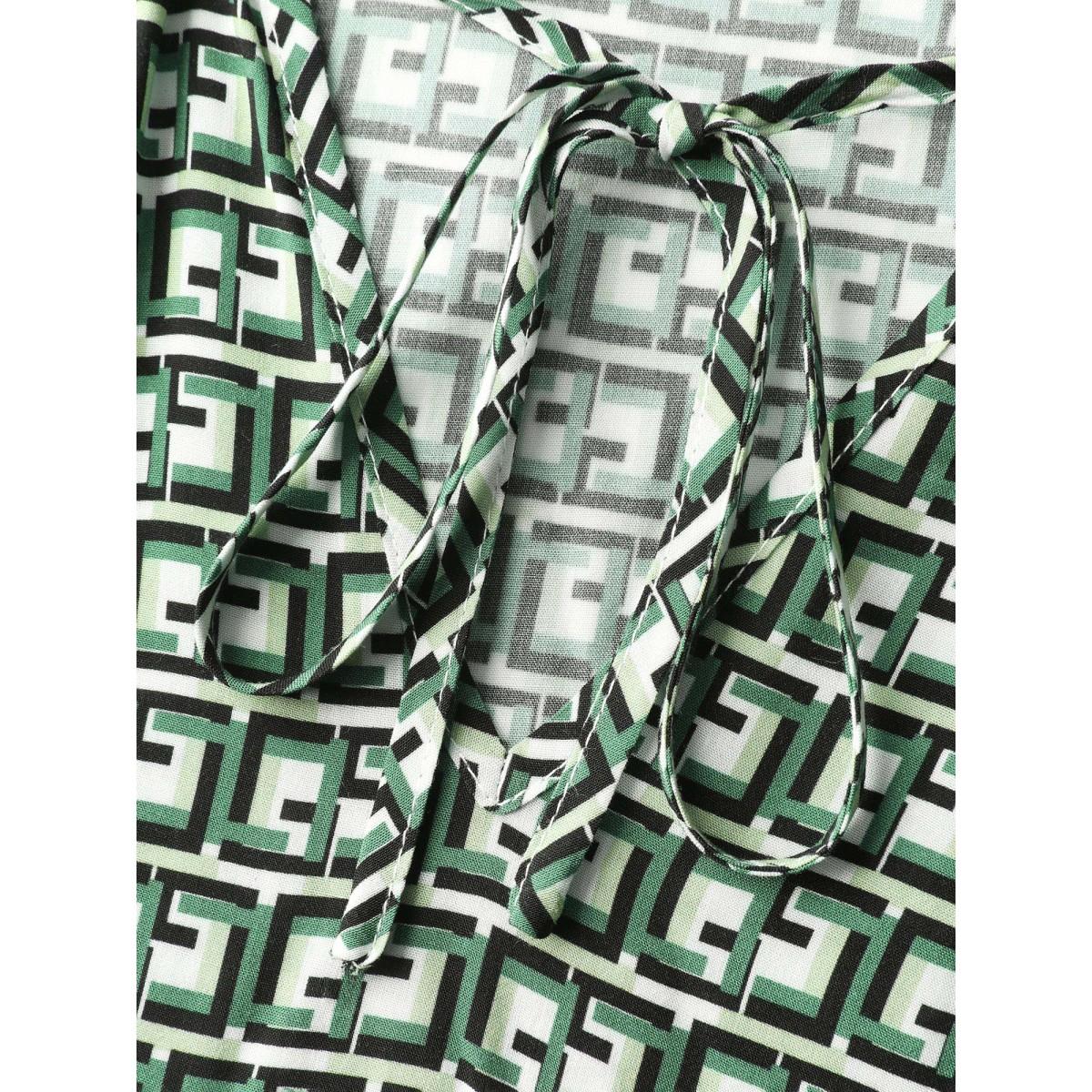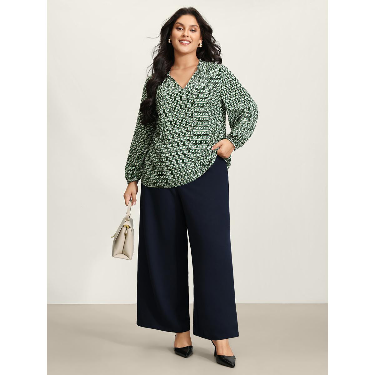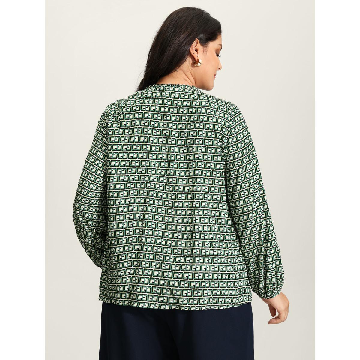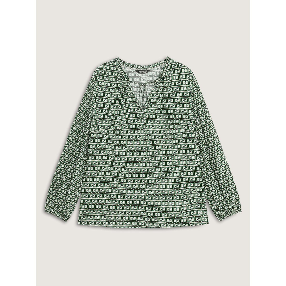 Plus Size Emerald Geometric Print Neck-Tie Relaxed-Fit Blouse Women Office Extra Long Sleeve V-neck Office Blouses BloomChic 18-20/2X