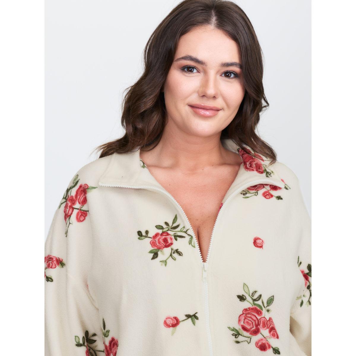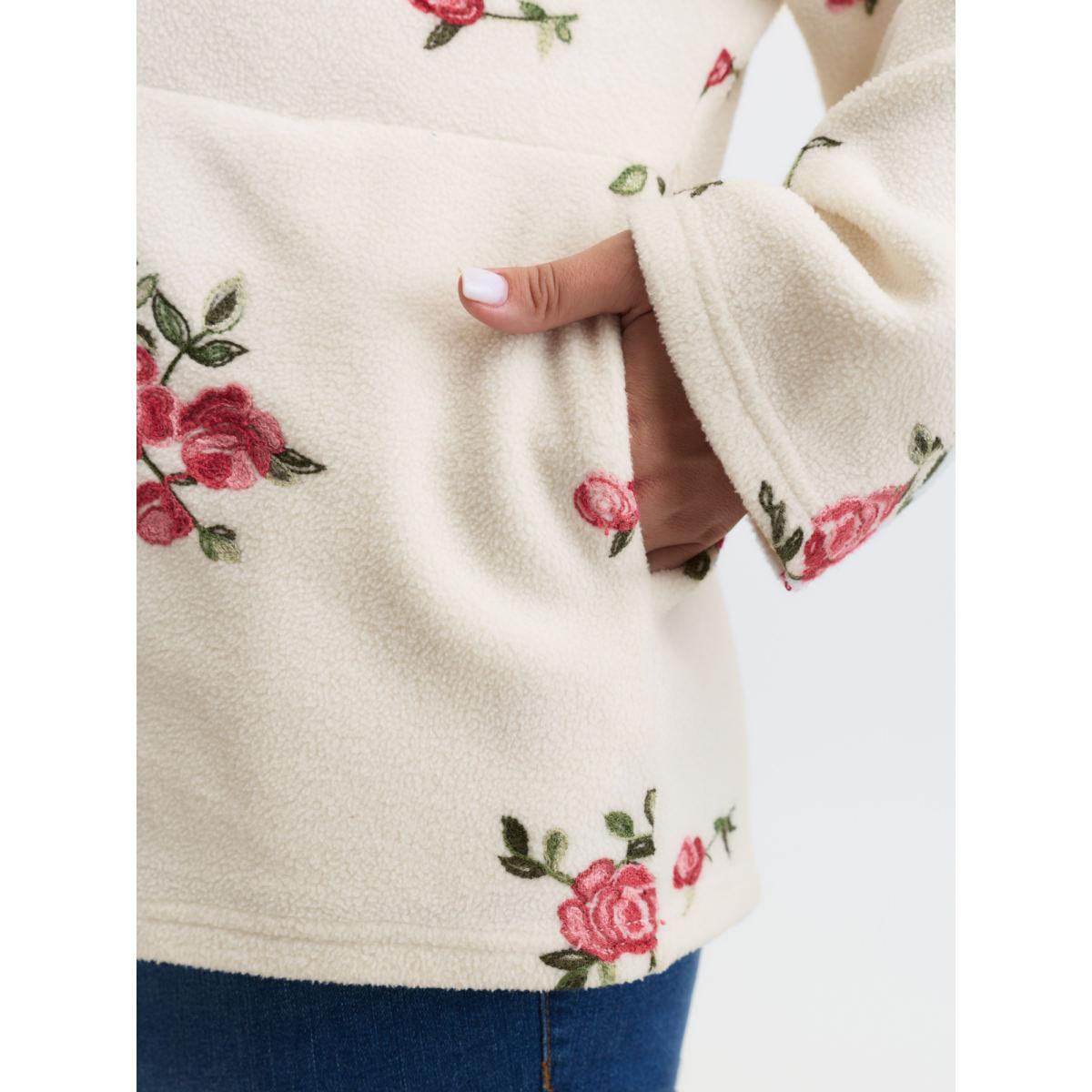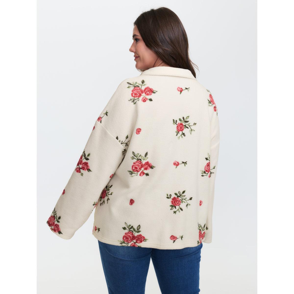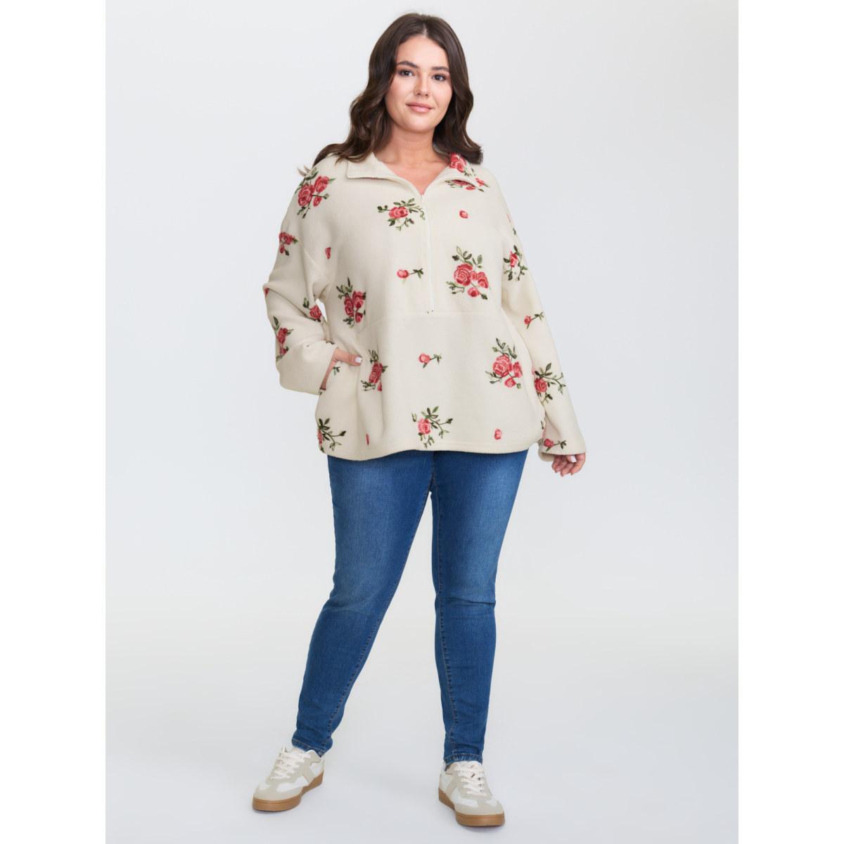 Plus Size Fleece Floral Embroidered Zipper Sweatshirt Women Beige Leisure Turtleneck Casual Sweatshirts BloomChic 10/M