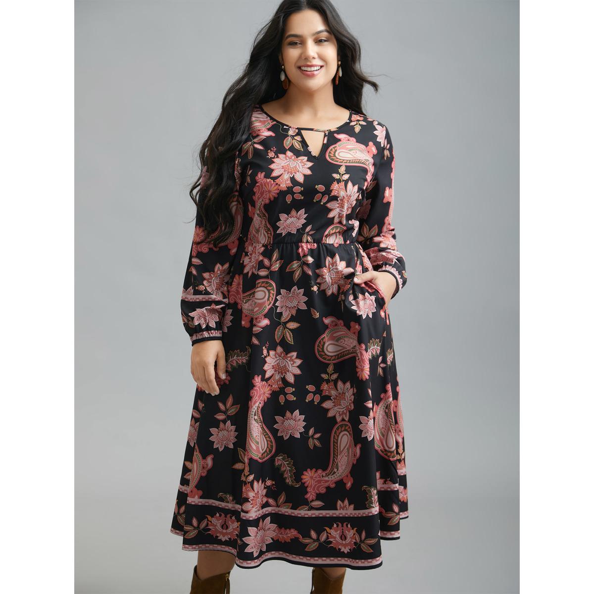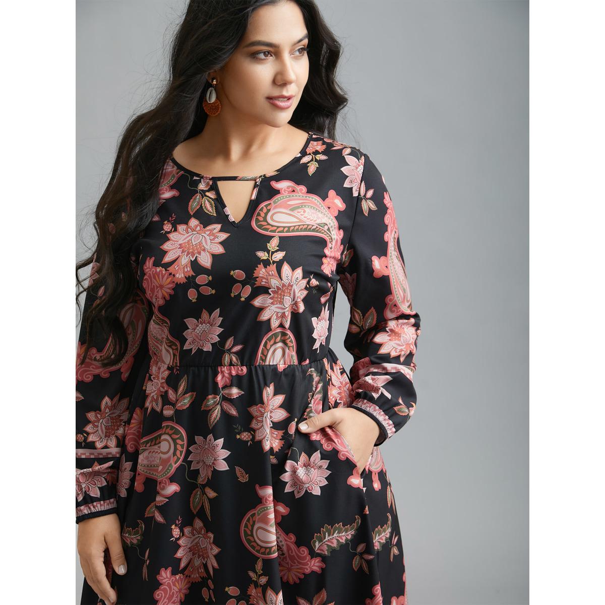 Plus Size Floral Boho Print Neck Cut-Out Dress Black Women Resort Cut-Out Notched collar Long Sleeve Curvy BloomChic 22-24/3X