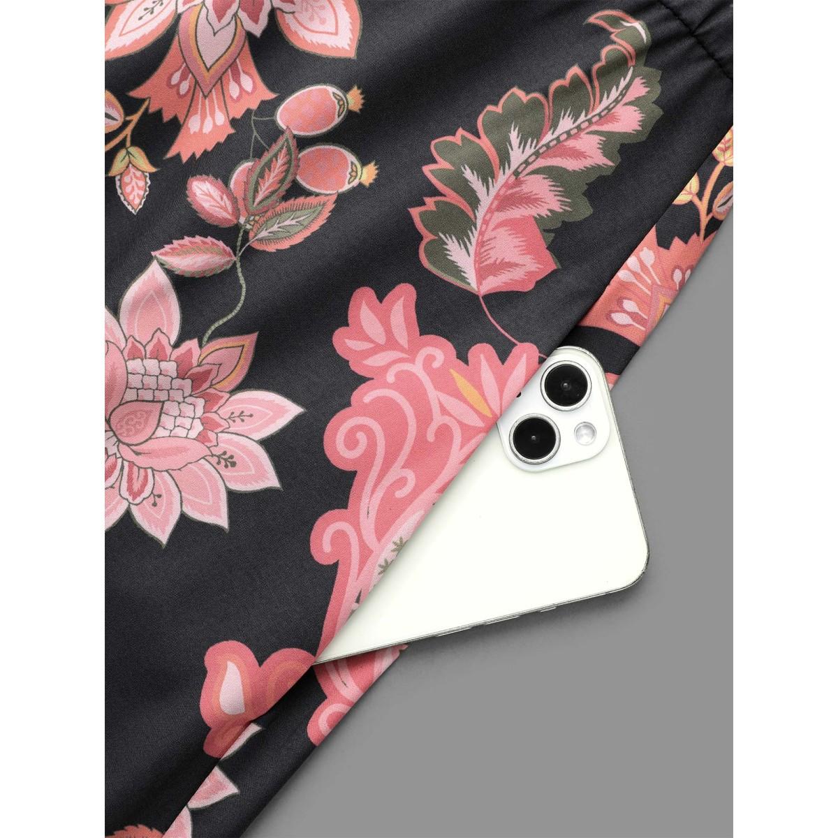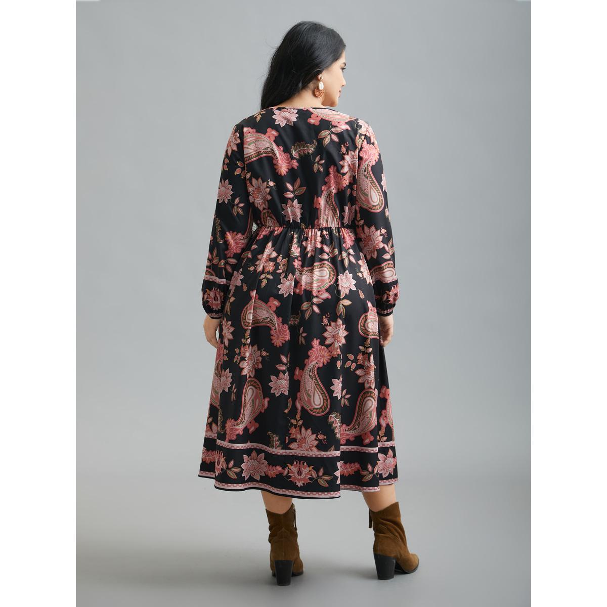 Plus Size Floral Print Notched Collar Elastic Waist Dress Black Women Resort Elastic cuffs Flat collar with V-notch Long Sleeve Curvy BloomChic 14-16/1X