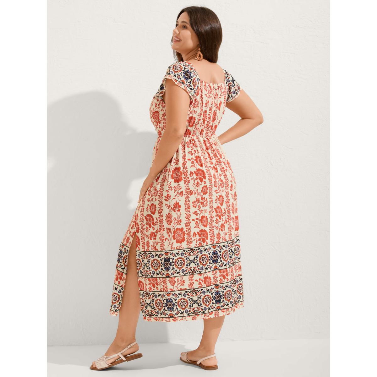 Plus Size Floral Contrast Print Cap Sleeve Midi Dress Rust Women Boho Slit Heart neckline Cap Sleeve Curvy BloomChic 22-24/3X