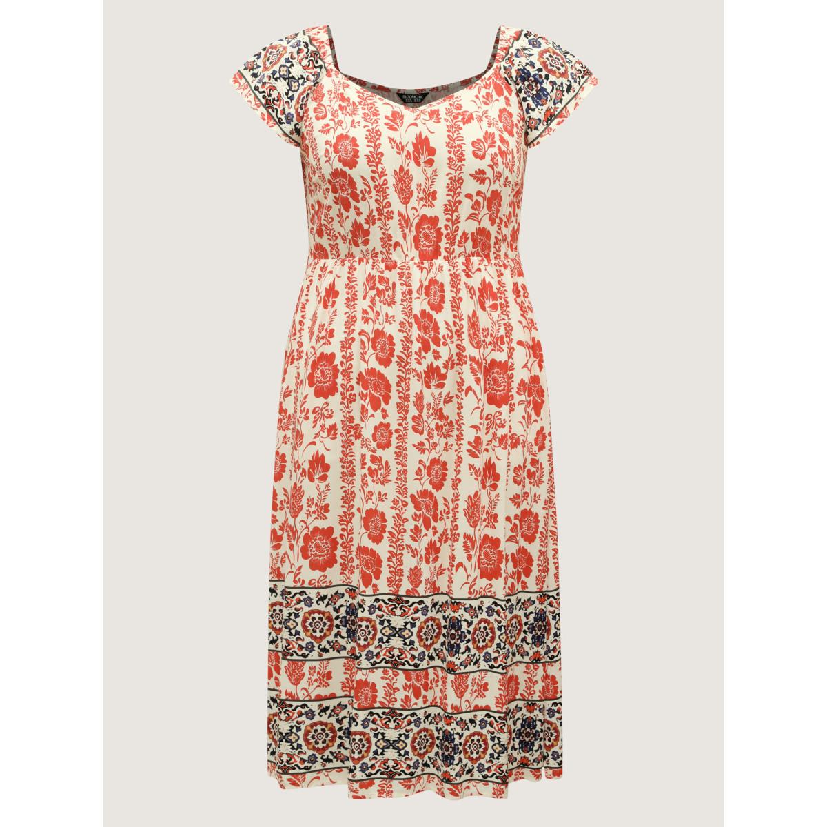 Plus Size Floral Print Stretchy Waist Flutter Midi Dress Multicolor Women V-neck Cap Sleeve Curvy BloomChic 18-20/2X