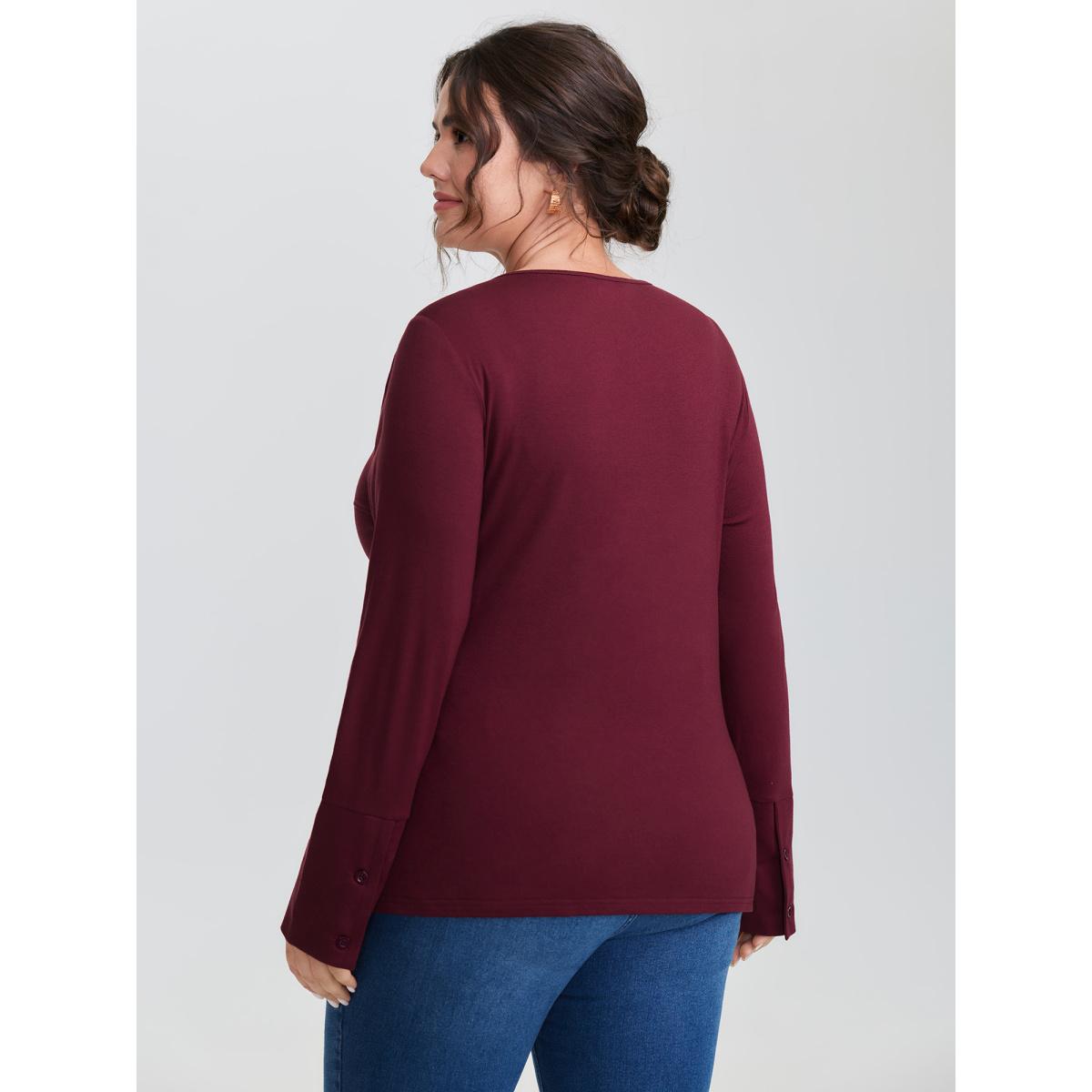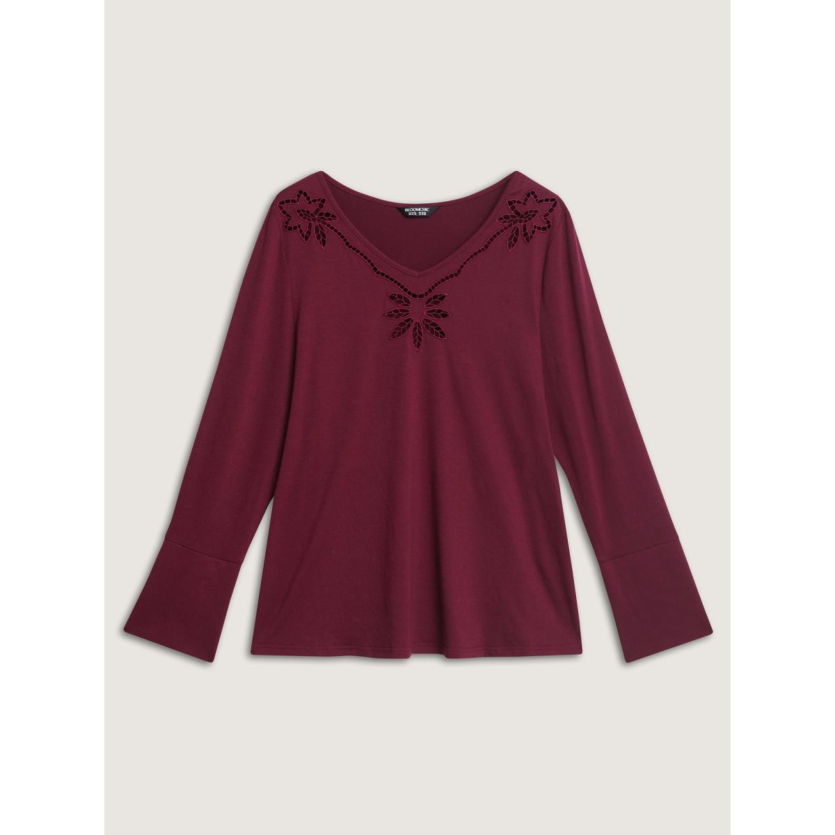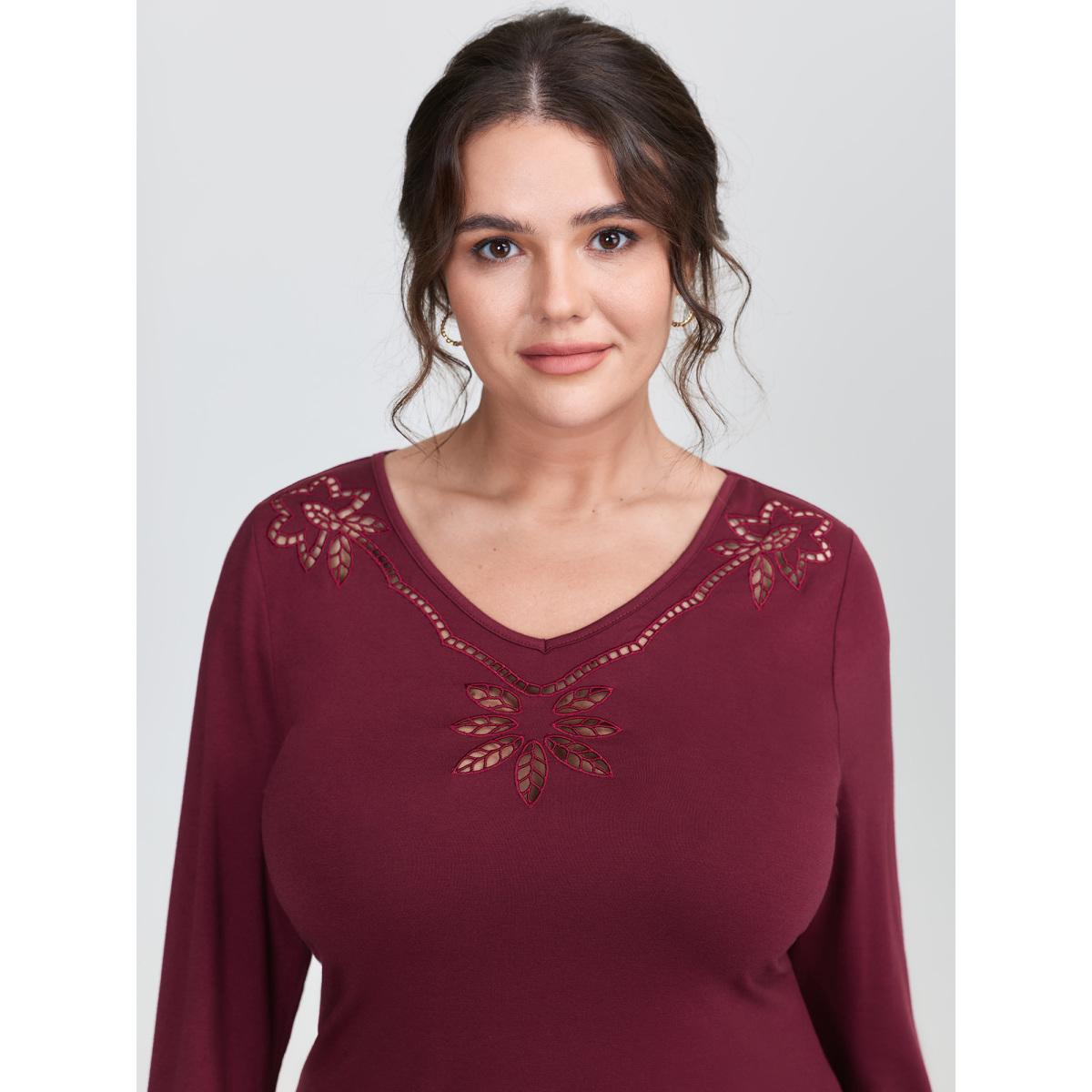Plus Size Floral Cut-Out Embroidery Fitted T-Shirt Burgundy Women Non Elegant T-shirts BloomChic 26/4X