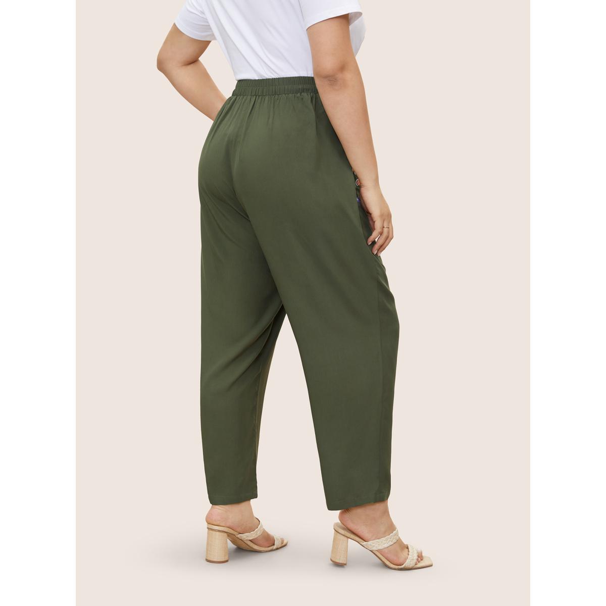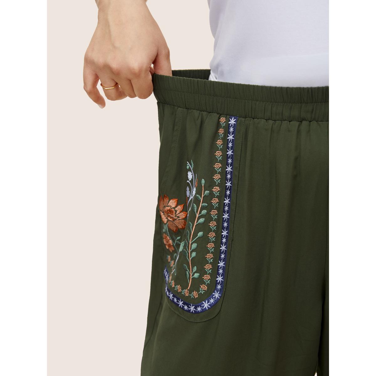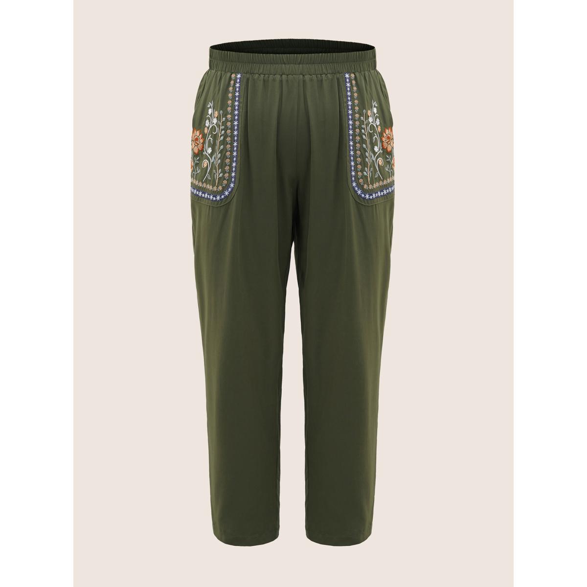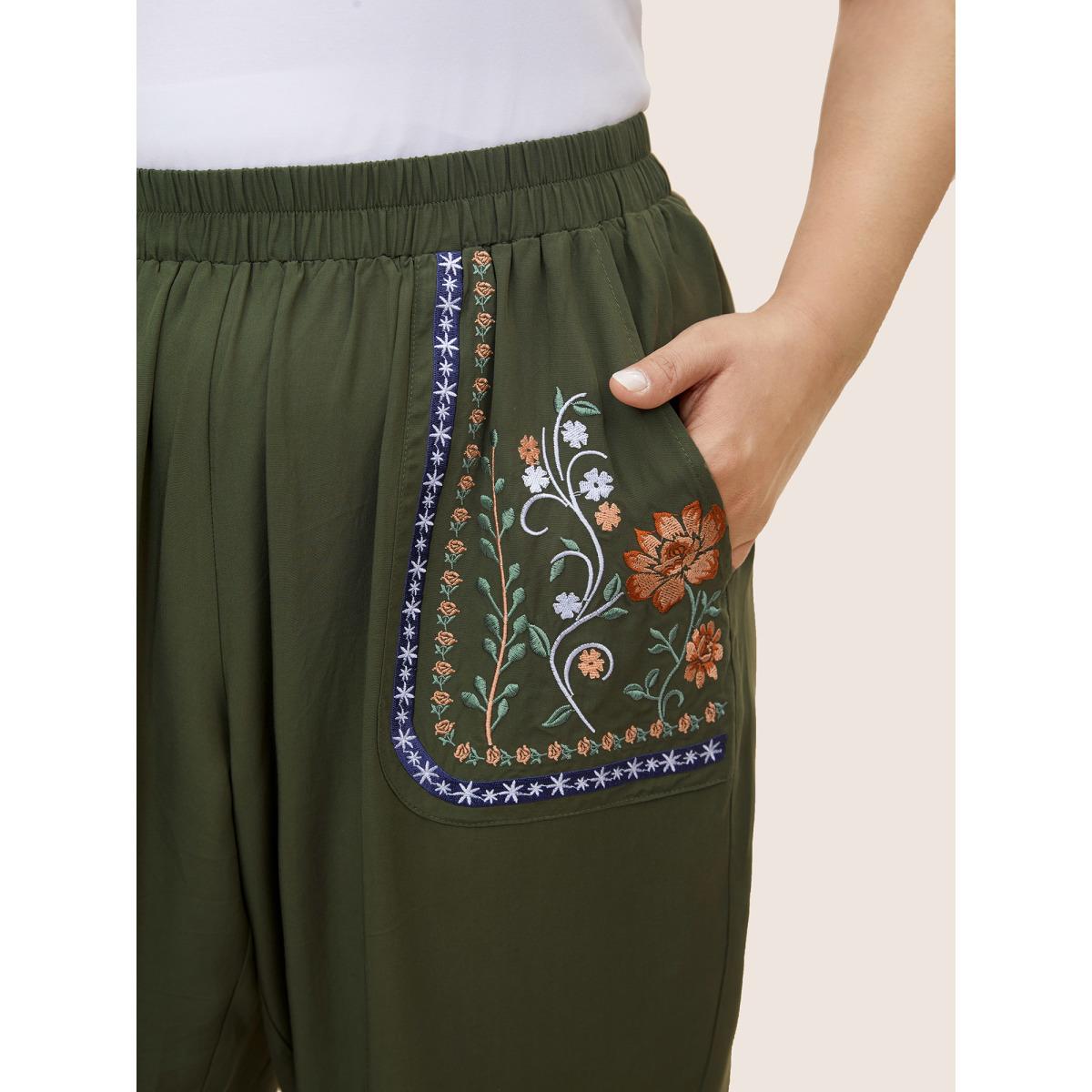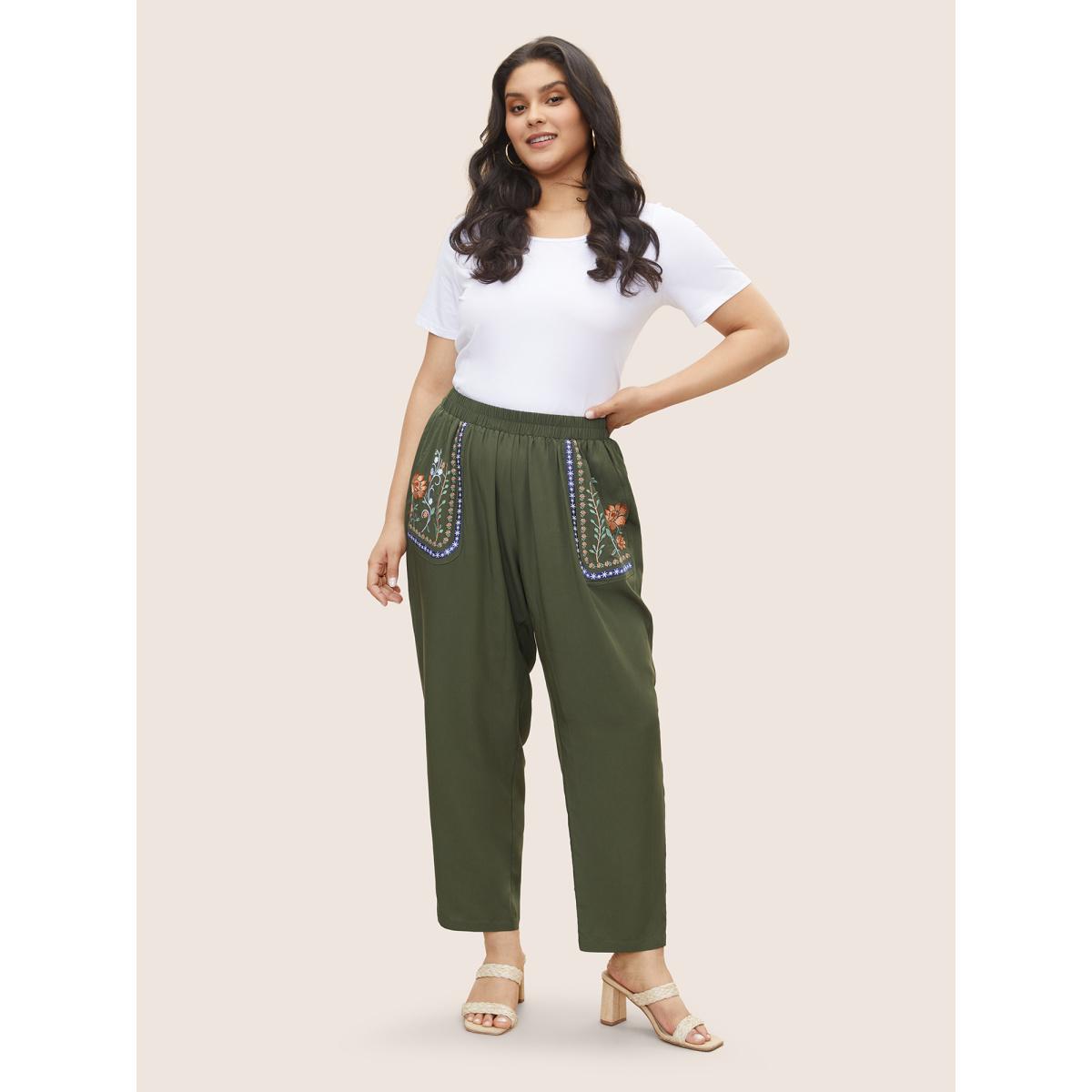 Plus Size Floral Embroidered Elastic Waist Slanted Pocket Pants Women ArmyGreen Resort Loose High Rise Vacation Pants BloomChic 22-24/3X