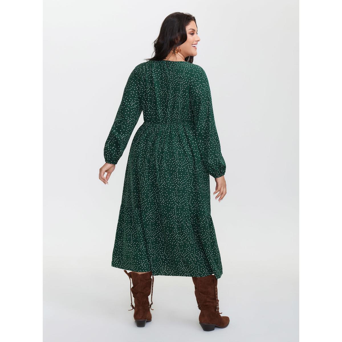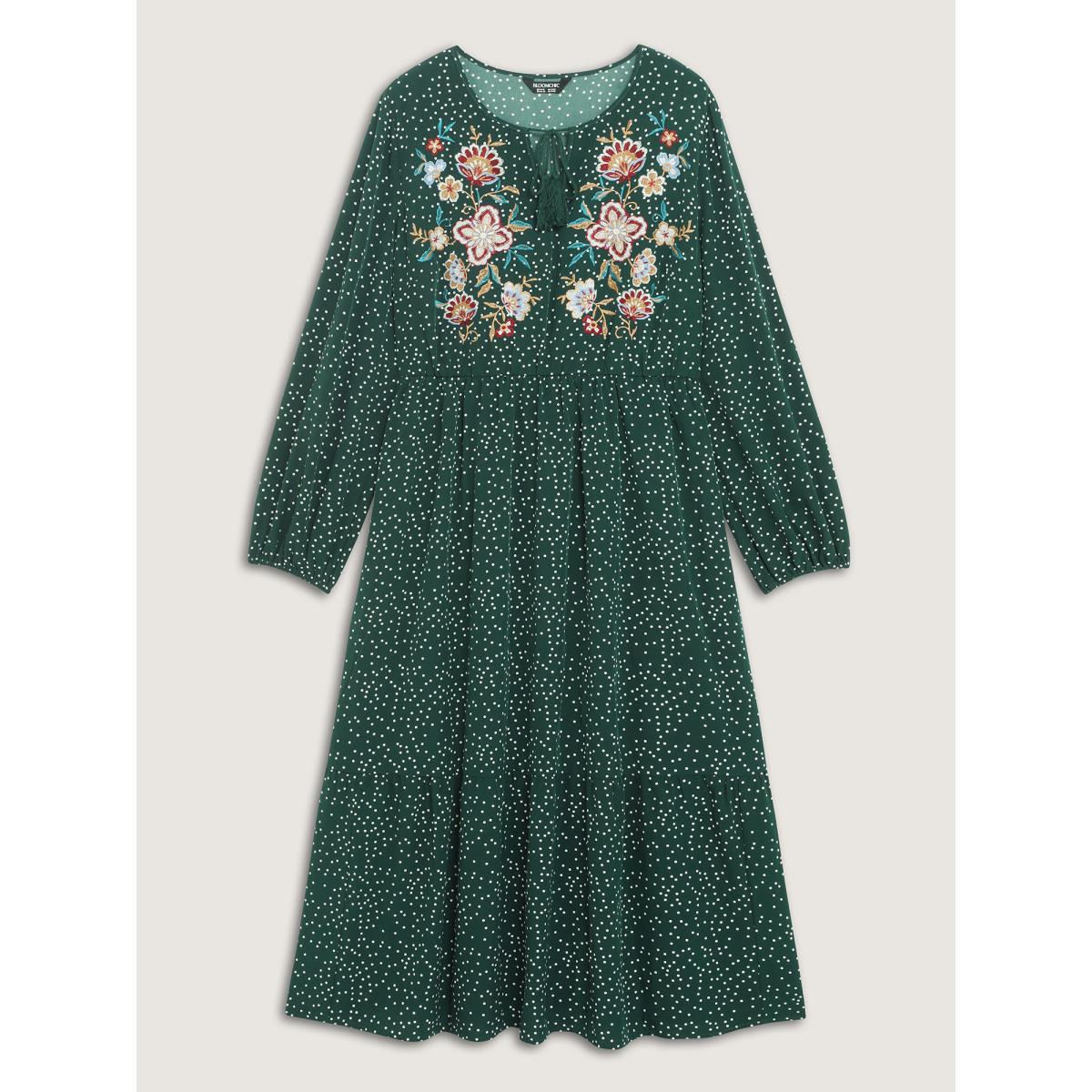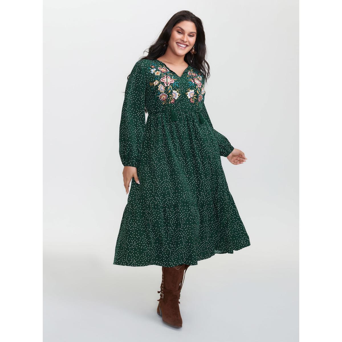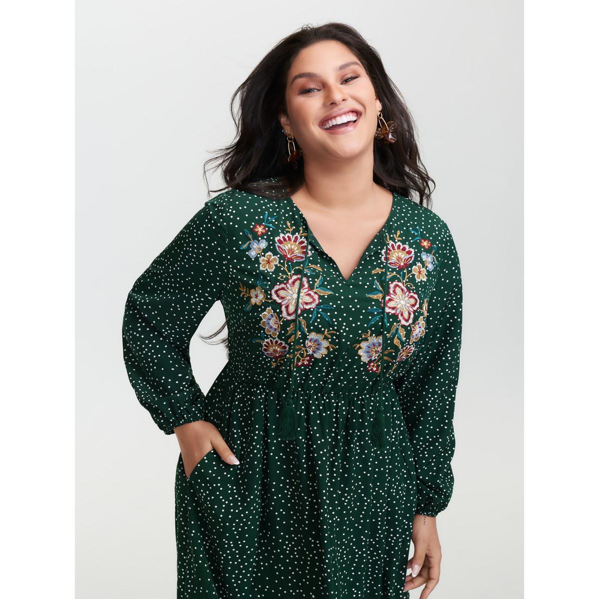 Plus Size Floral Embroidery Tassels Maxi Dress DarkGreen Women Boho Tie knot Flat collar with V-notch Extra Long Sleeve Curvy BloomChic 22-24/3X