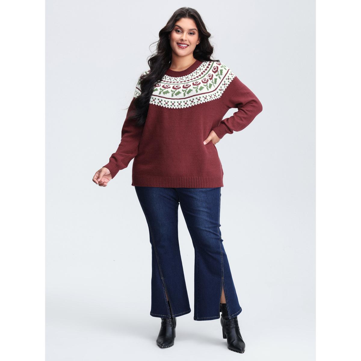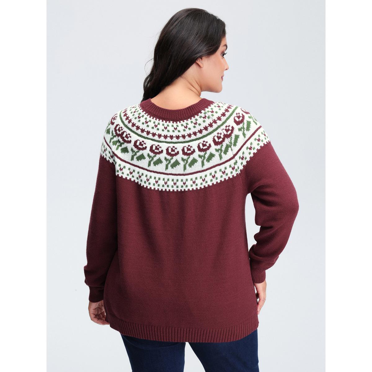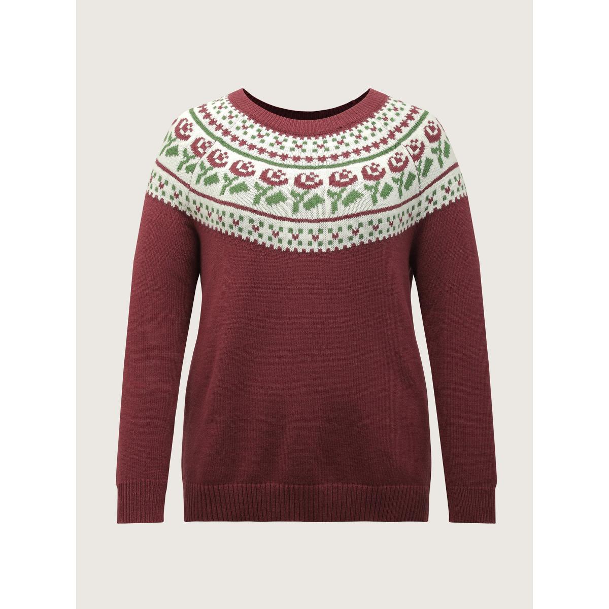 Plus Size Floral Fair Isle Raglan Sleeve Pullover Deepred Women Leisure Loose Long Sleeve Round Neck Casual Pullovers BloomChic 22-24/3X