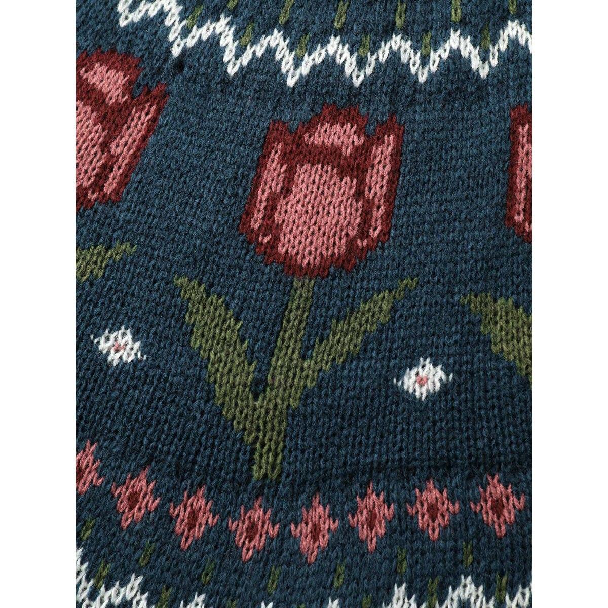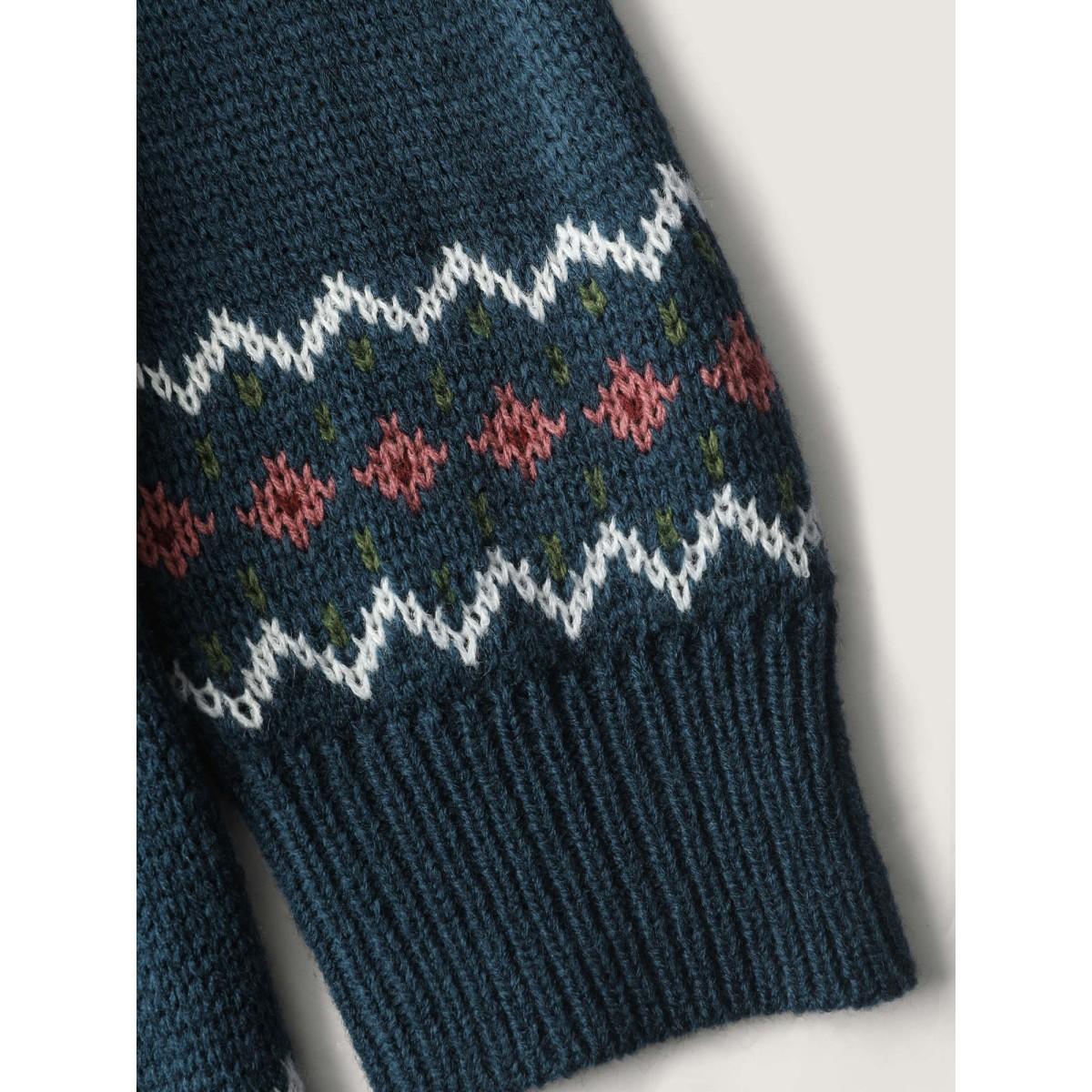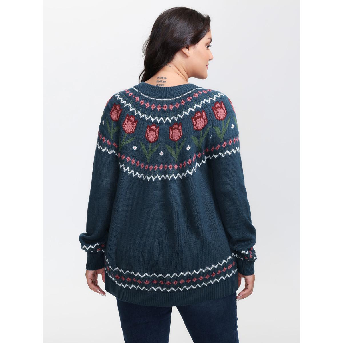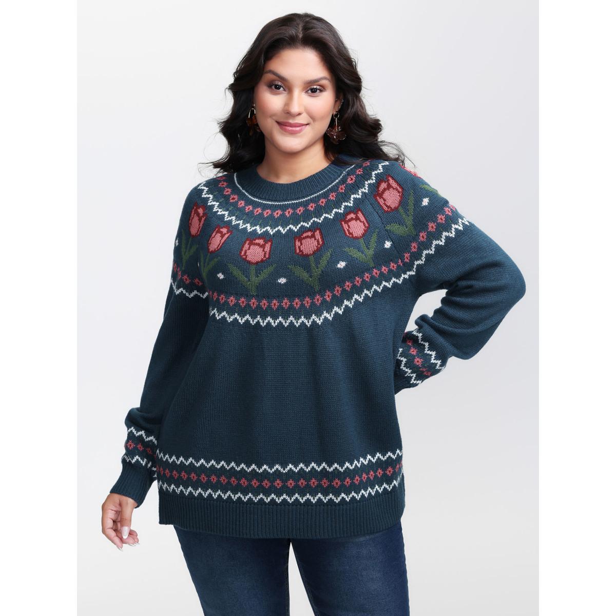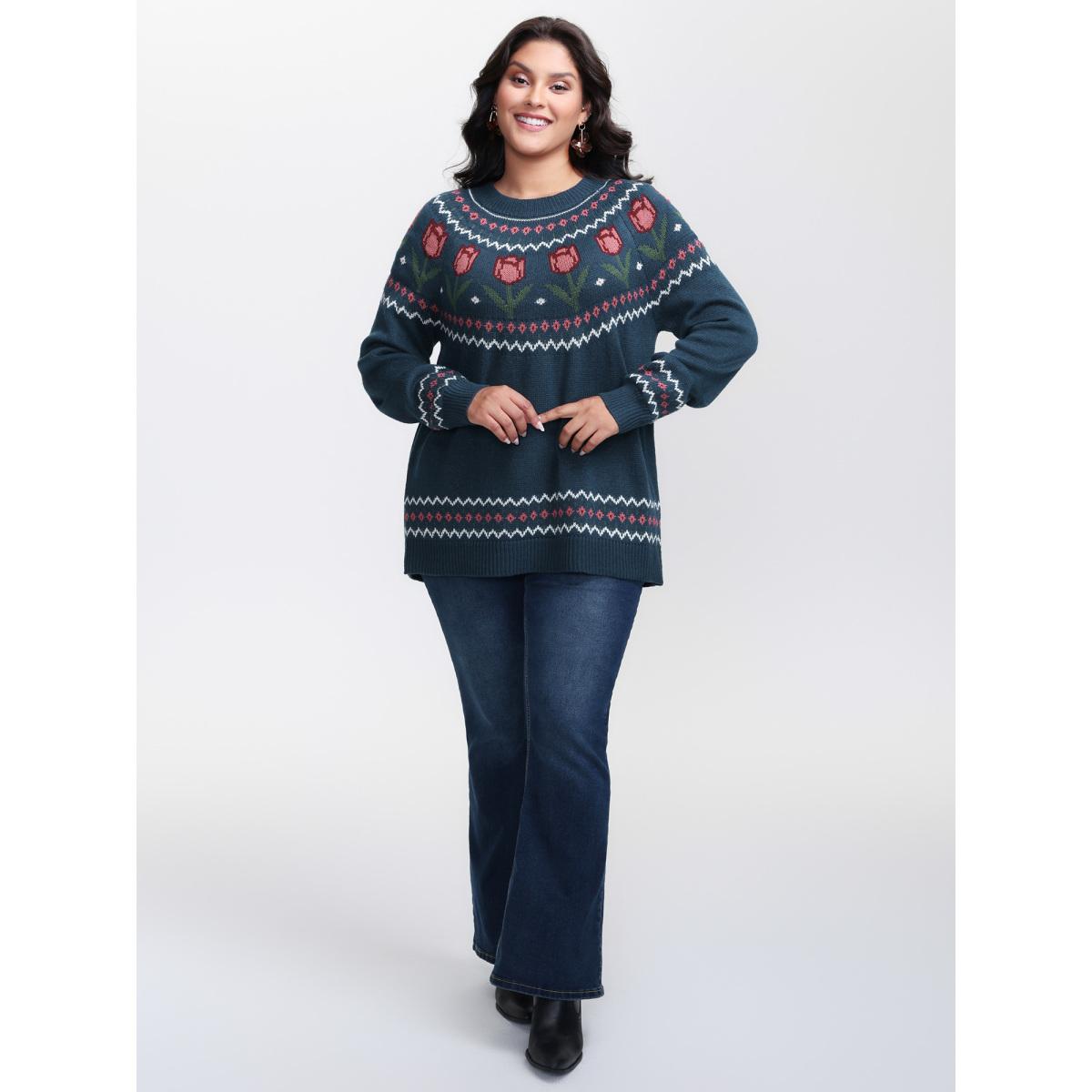 Plus Size Floral Jacquard Color Contrast Pullover Indigo Women Leisure Loose Long Sleeve Round Neck Casual Pullovers BloomChic 22-24/3X