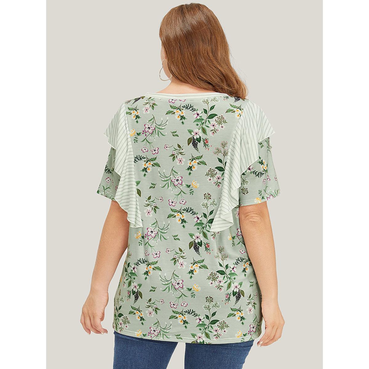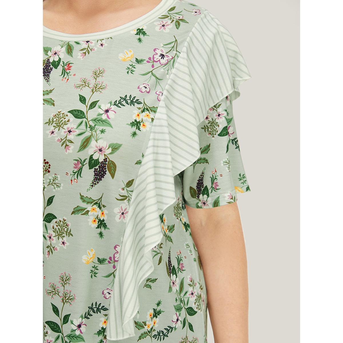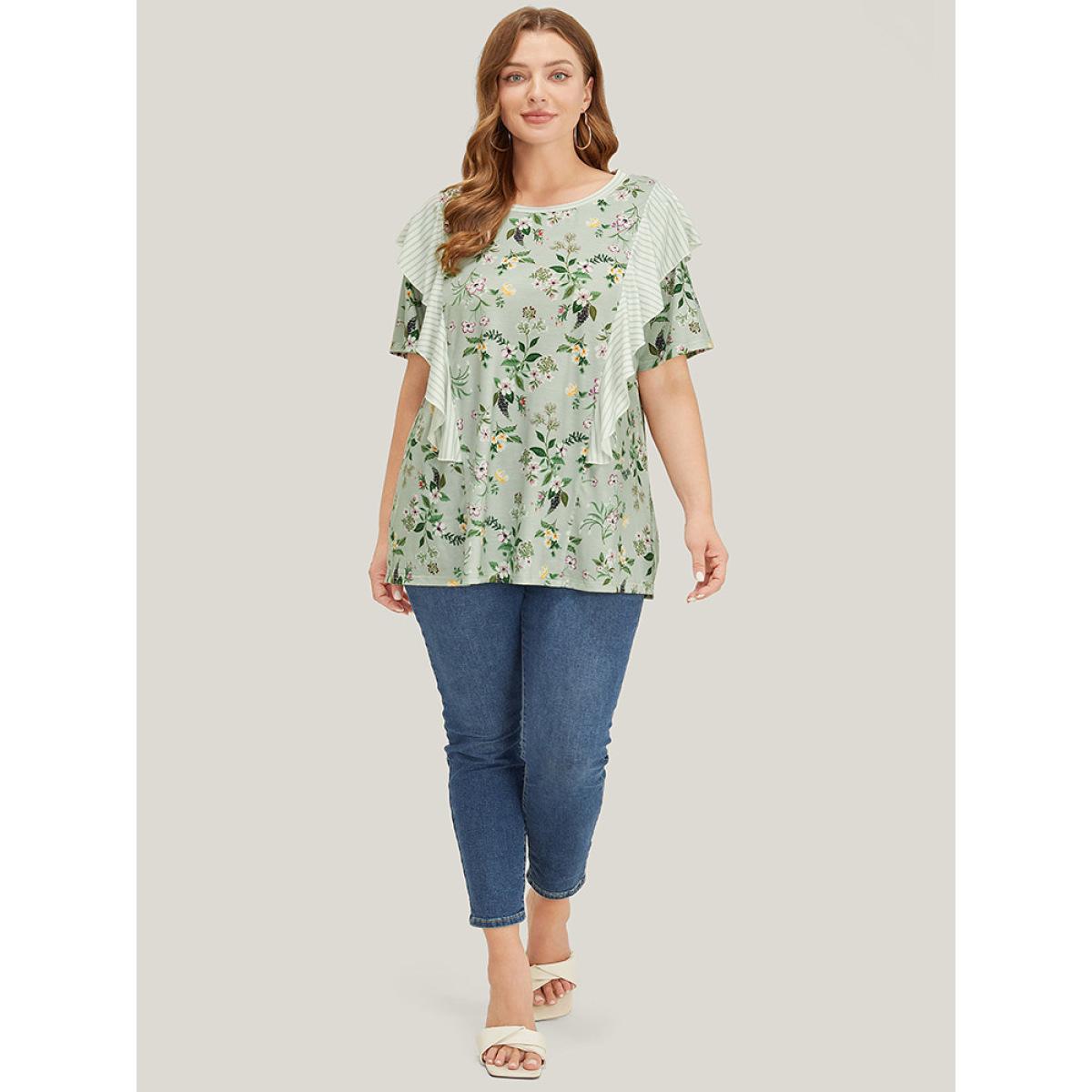 Plus Size Floral Patchwork Round Neck Striped Ruffle Trim T-shirt SpringGreen Women Elegant Striped Round Neck Dailywear T-shirts BloomChic 28/5X