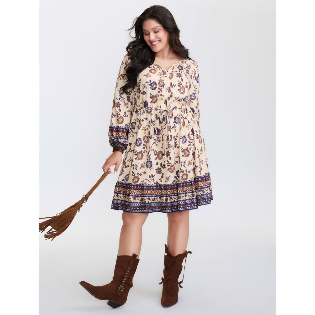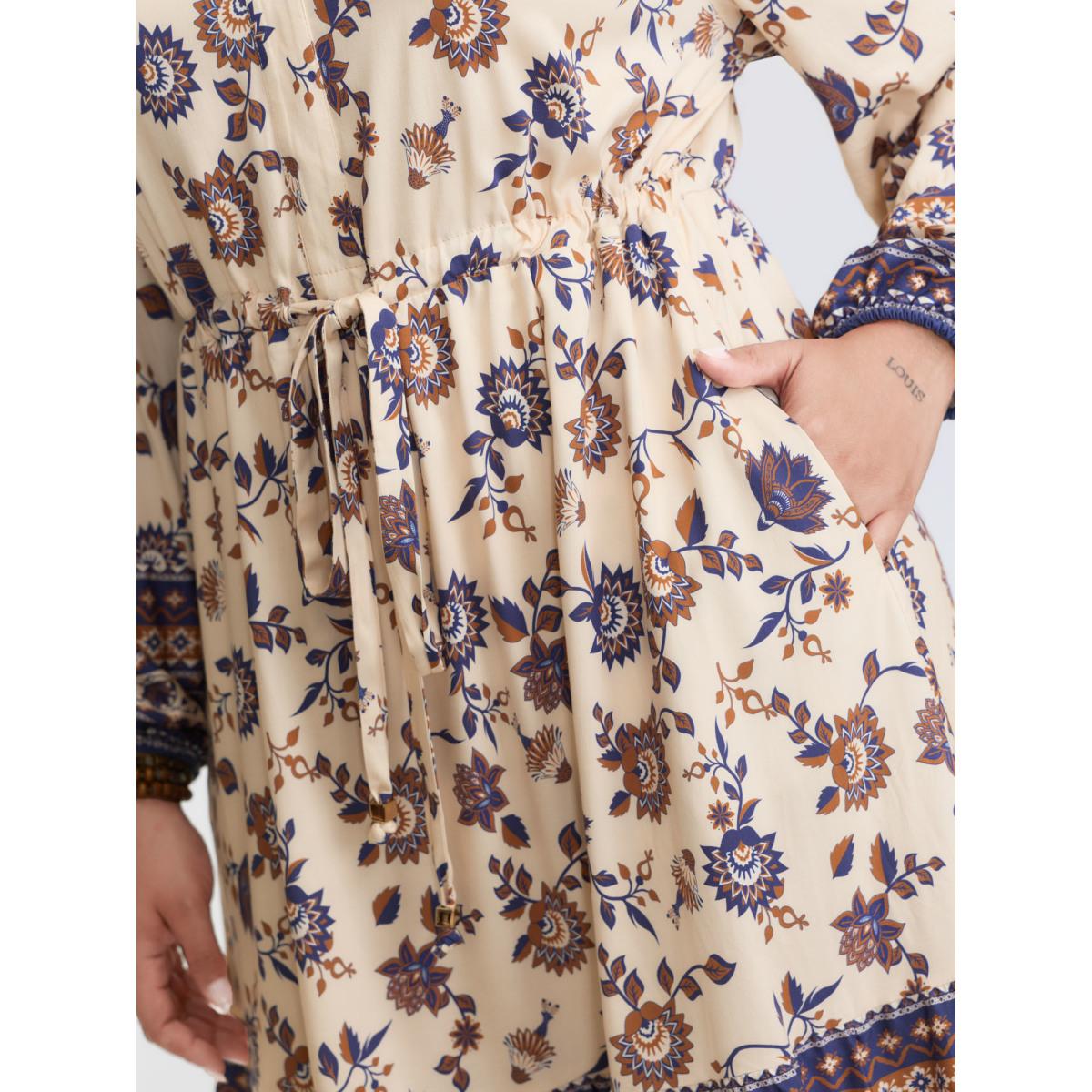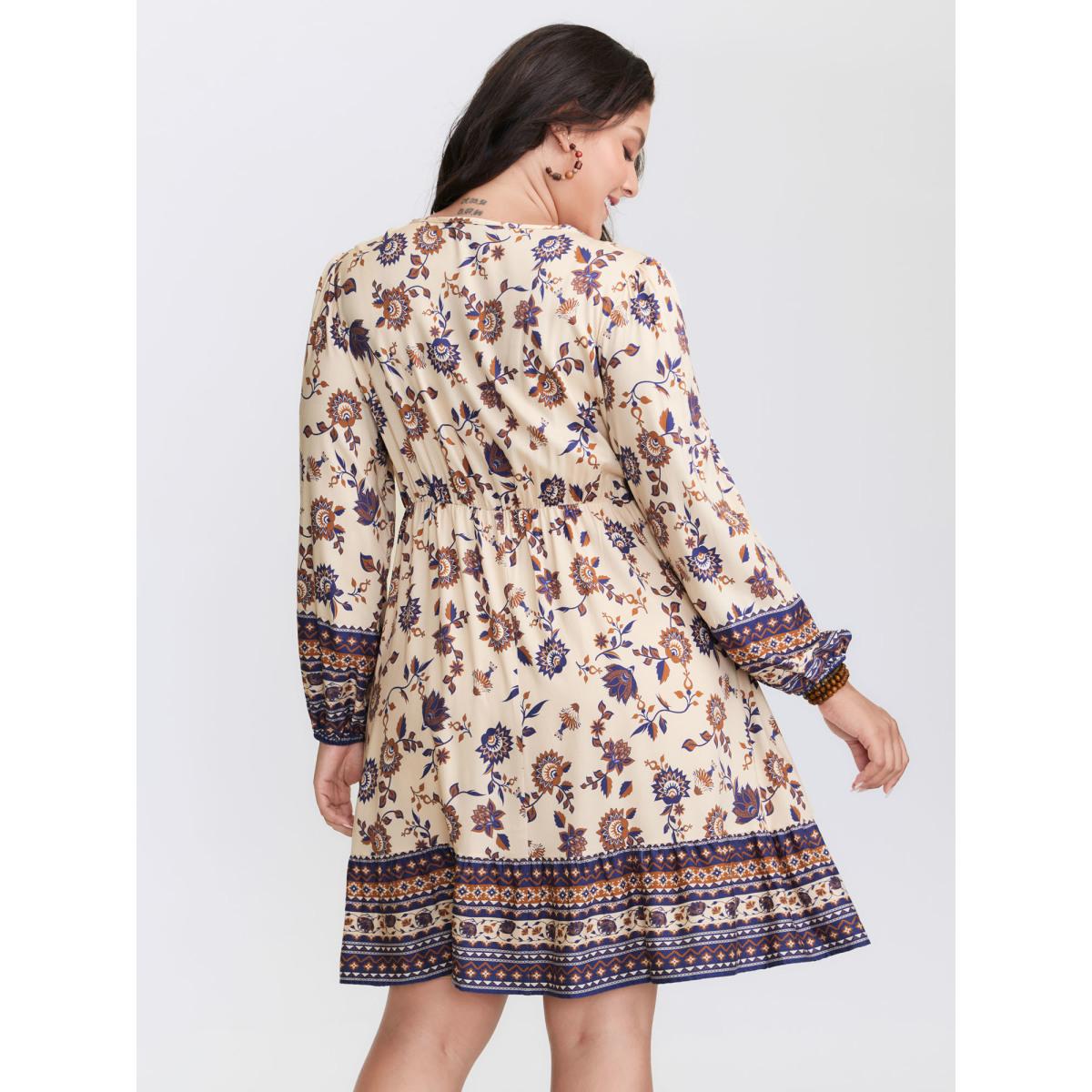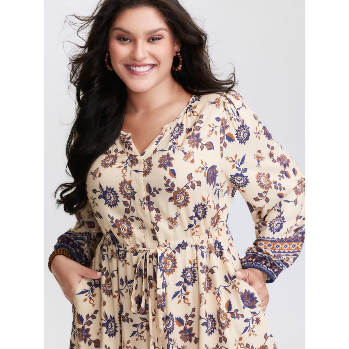 Plus Size Floral Print Adjustable Waist Mini Dress Beige Women Flat collar with V-notch Extra Long Sleeve Curvy BloomChic 22-24/3X