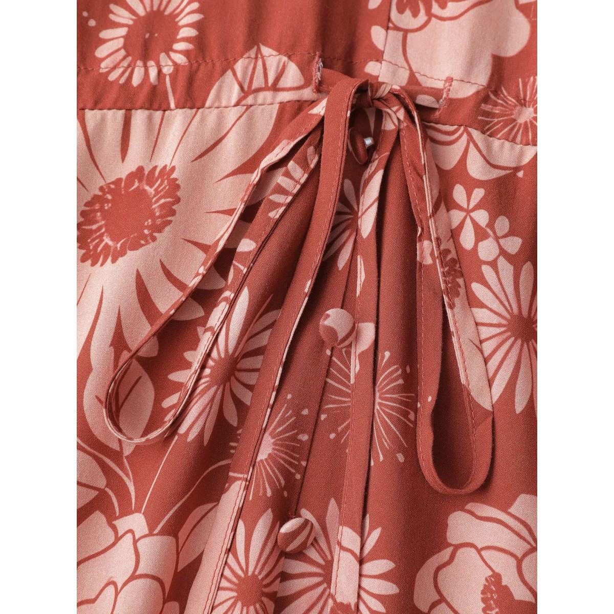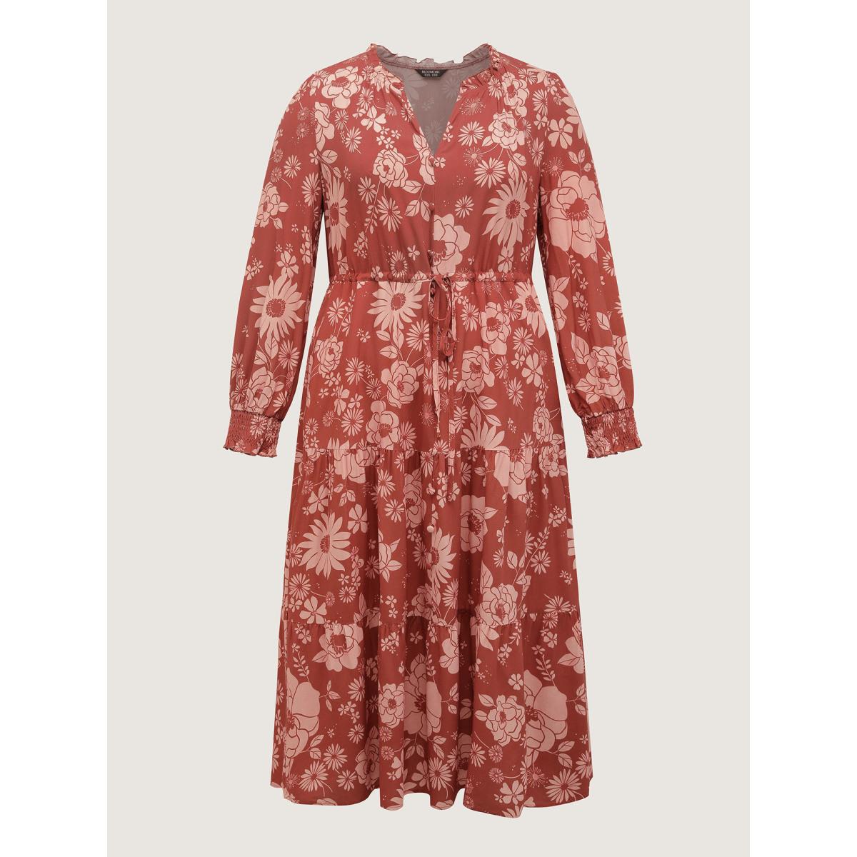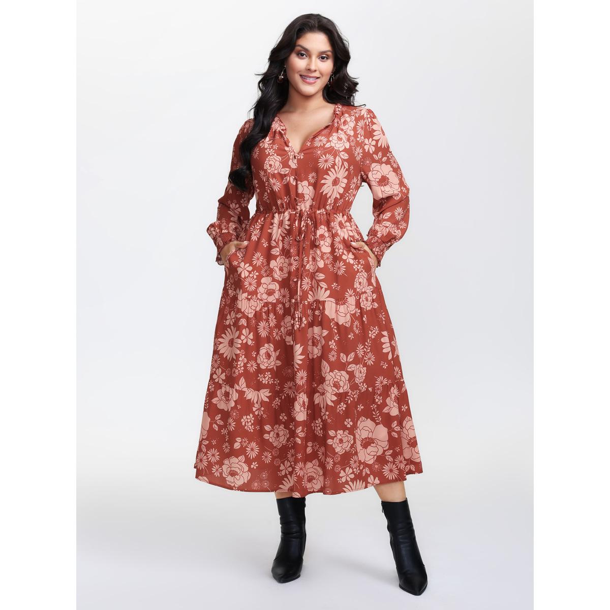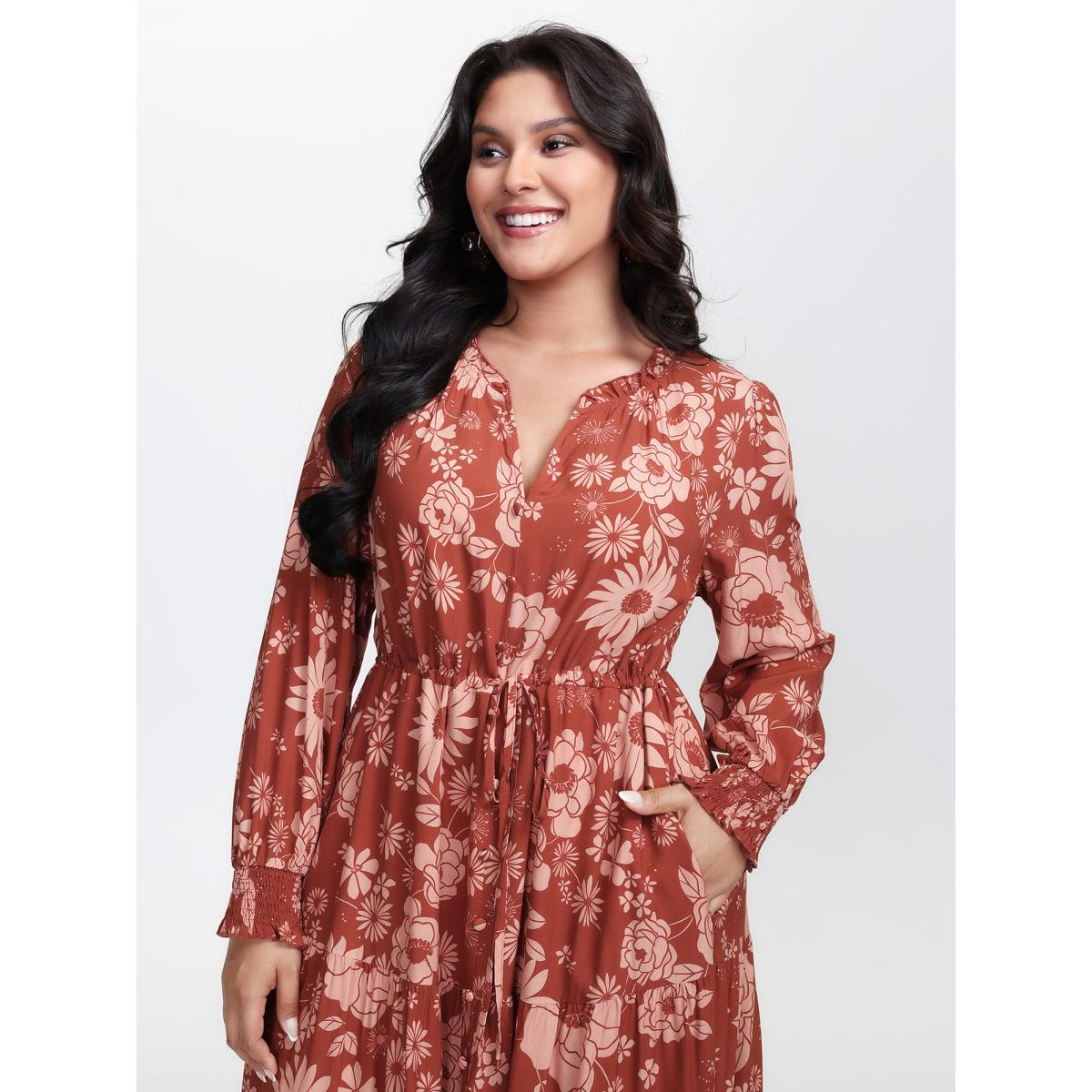 Plus Size Floral Print Adjustable Waist-Tie Maxi Dress OrangeRed Women Boho Non Extra Long Sleeve Curvy BloomChic 10/M