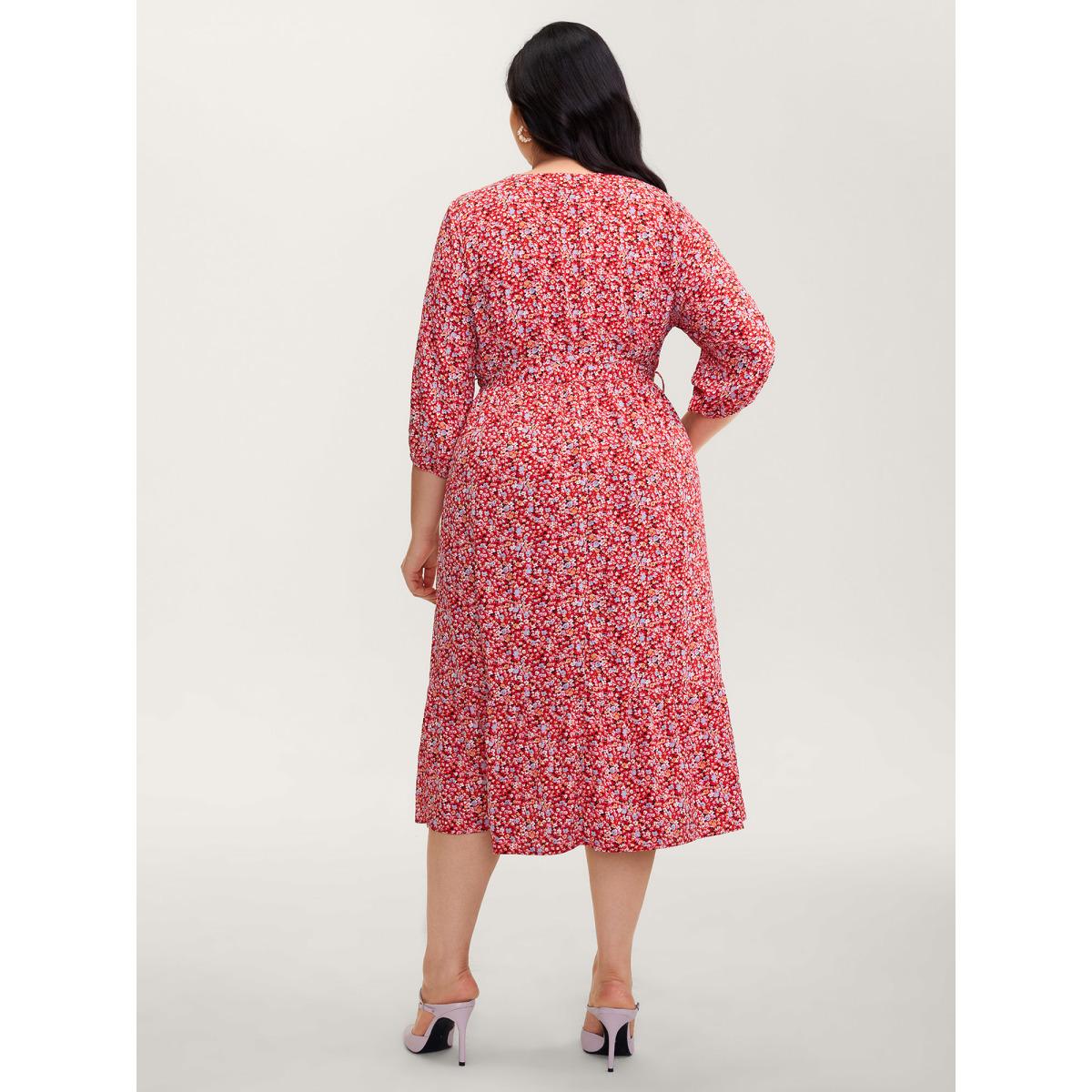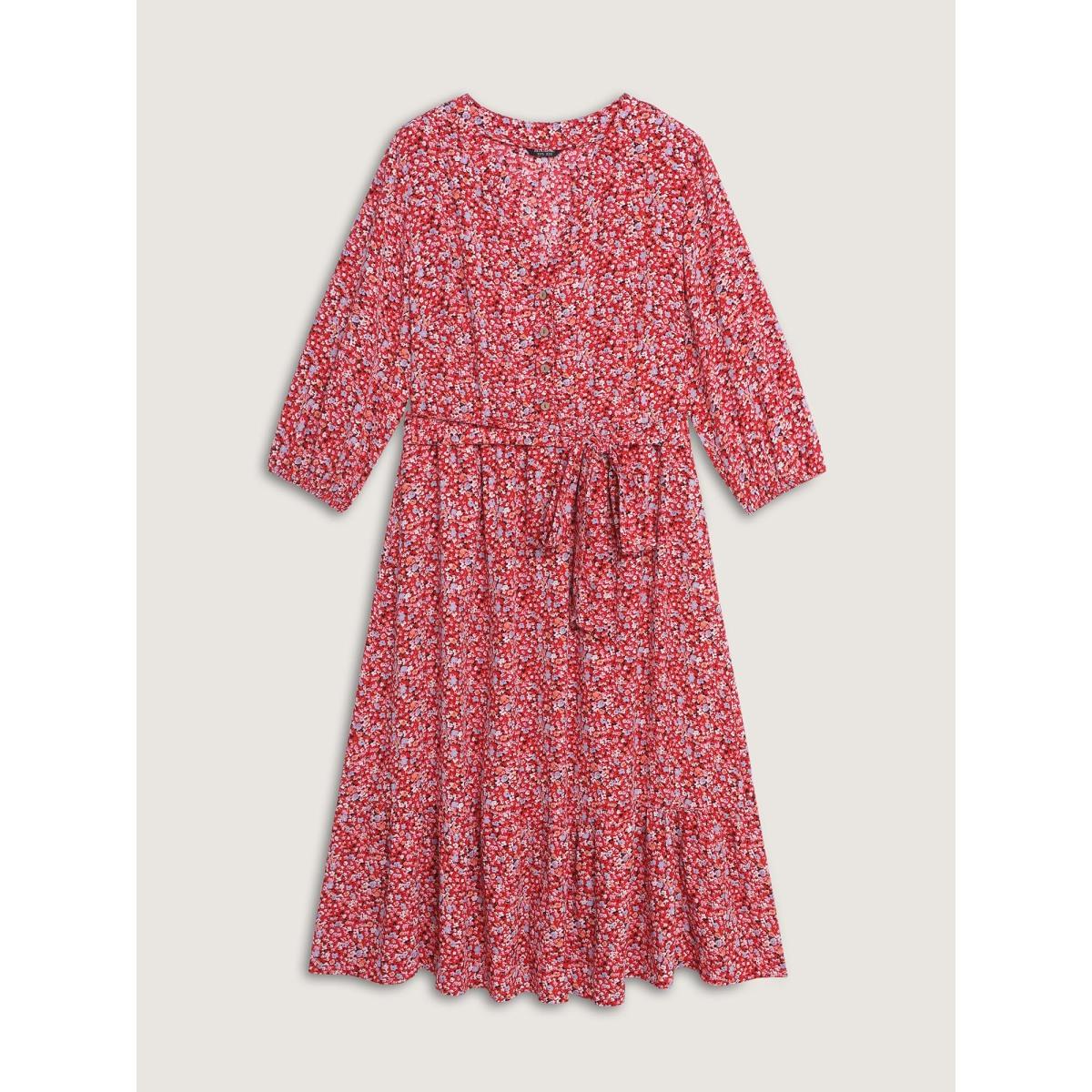 Plus Size Ditsy Floral Belted Ruffle Sleeve Dress Scarlet Women Elegant Belted Round Neck Long Sleeve Curvy Midi Dress BloomChic 18-20/2X